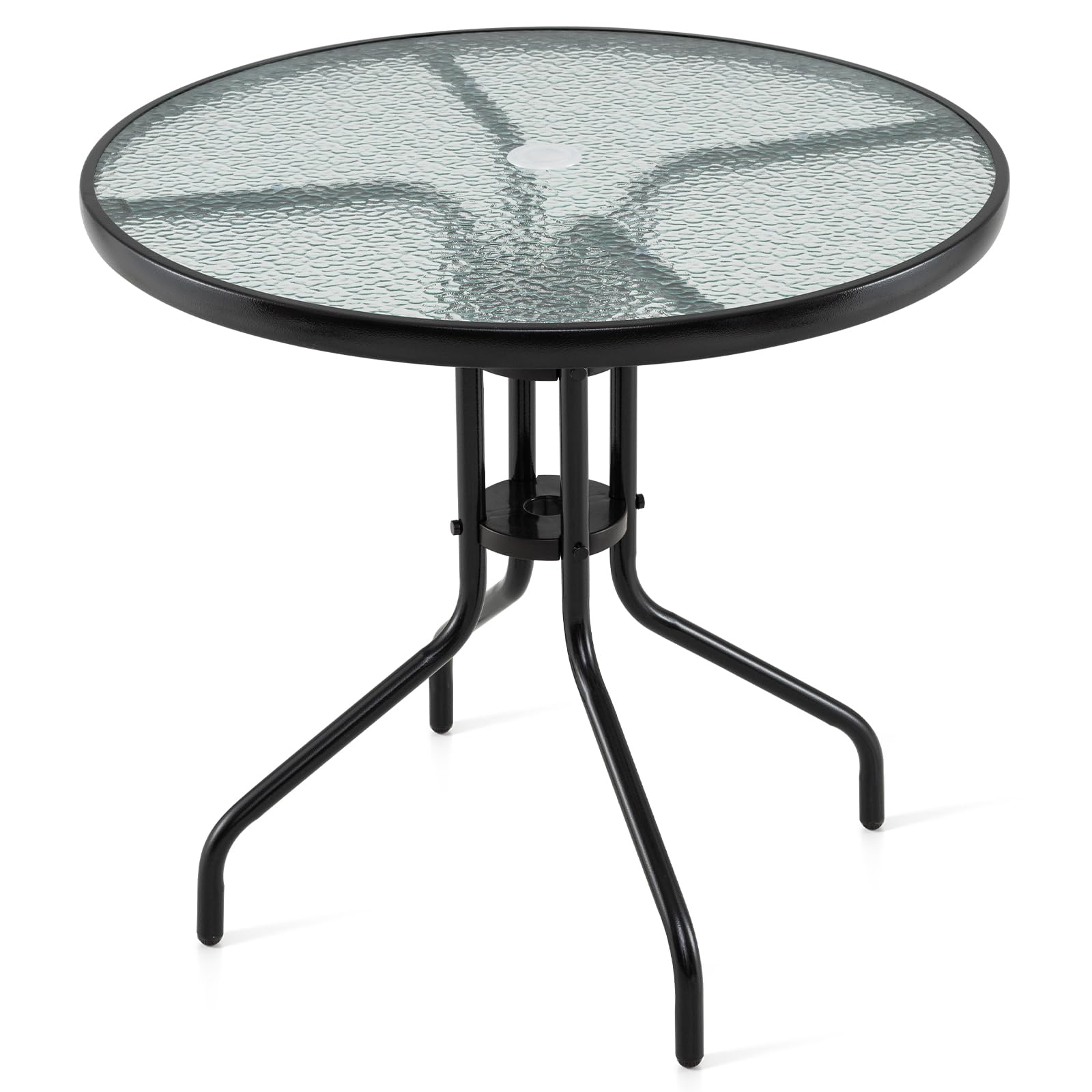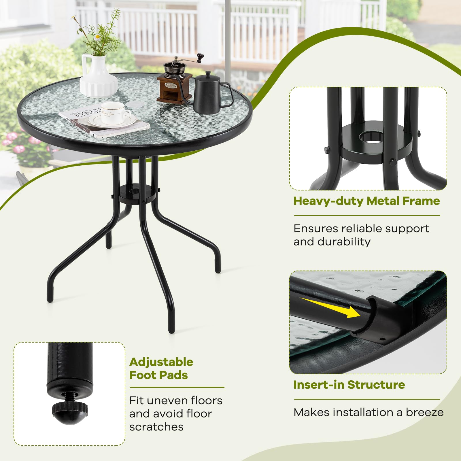 Elevate your outdoor dining experience with this elegant patio round dining table, featuring a robust, ripple-like tempered glass tabletop that is not only stylish but also waterproof, sun-resistant, and easy to clean. Supported by a heavy-duty metal frame with a simple insert-in leg design, it promises easy assembly and exceptional durability. Adjustable foot pads ensure stability on uneven surfaces, providing perfect balance whether placed in your backyard, poolside, or porch. Enjoy shaded relaxation during sunny days with the built-in 2” umbrella hole, complete with additional brackets to secure your patio umbrella firmly (umbrella not included). This versatile table transitions effortlessly to indoor use, making it a striking addition to any space. Ideal for those who value functional, chic, and low-maintenance furniture, this patio bistro table offers practicality wrapped in sophistication.