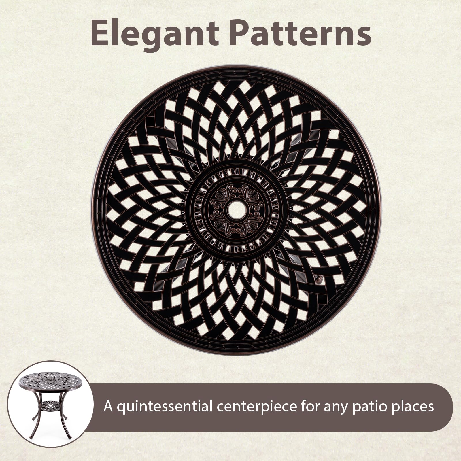 - Ideal Outdoor Dining Choice: With 31” large tabletop and 13” bottom shelf, the table offers ample space for meals and dinnerware. And the elegant patterns make it more appealing in multiple occasions like backyard, front porch and poolside.