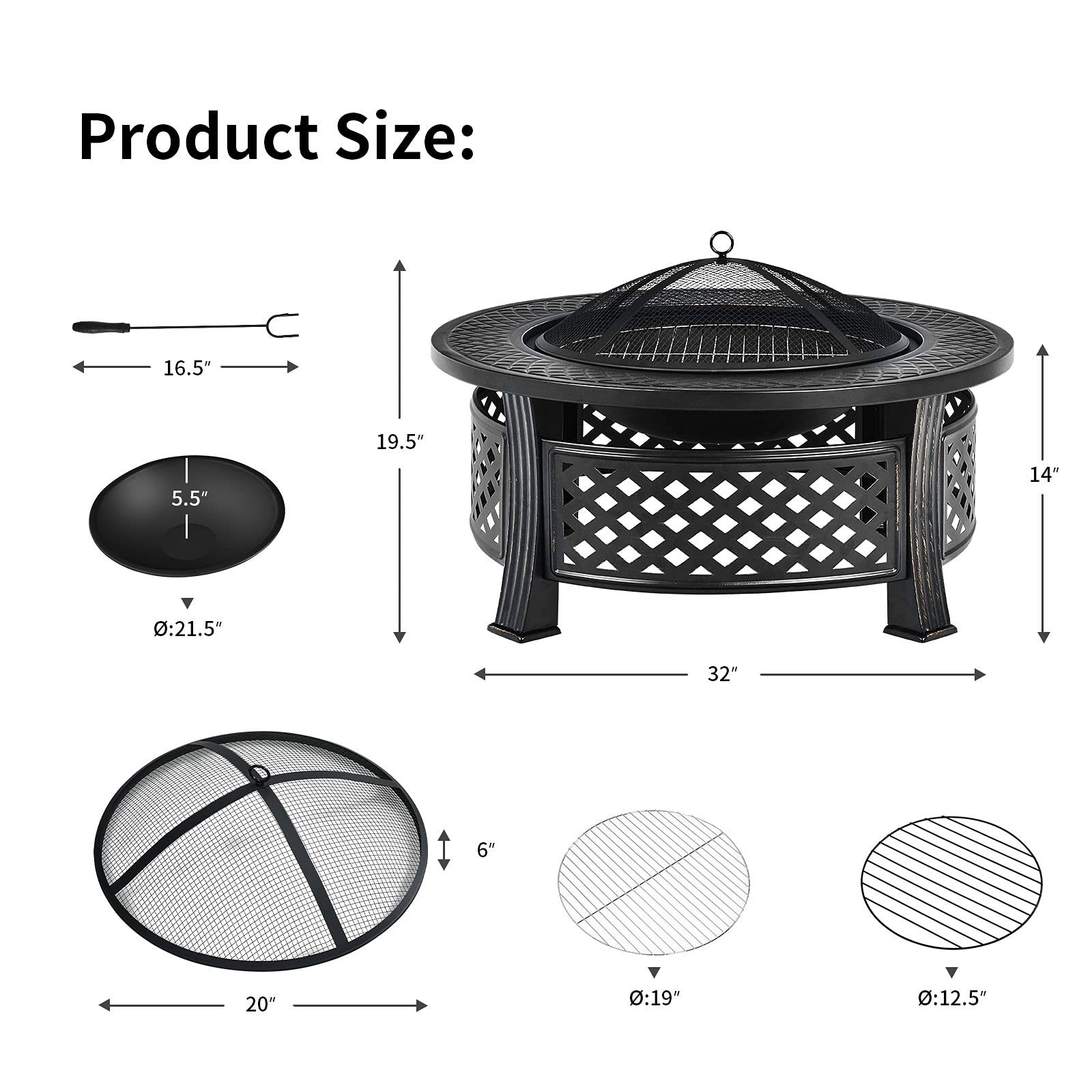 The package includes a fire pit, a mesh cover, a poker and a rain cover