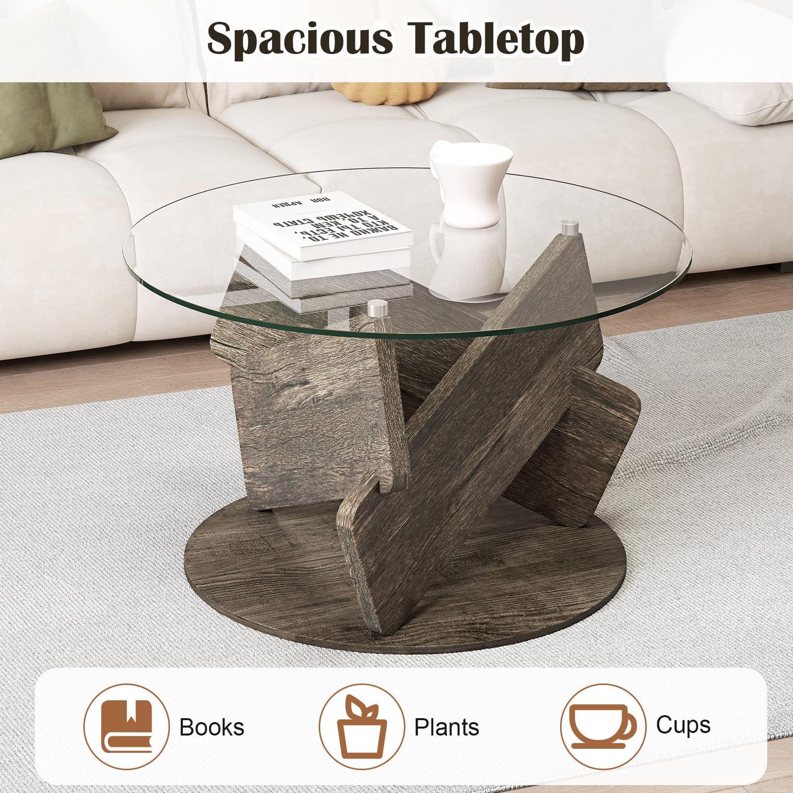 Featuring modern appearance, the round rustic coffee table effortlessly fits into contemporary decoration. With practical details such as rounded edges for safety and anti-slip foot mats for stability, this coffee table is perfect for use as a center table, side table or decorative accent in various rooms of your home. Supported by solid embedded rubber wood boards and 3 aluminum supports, this glass table offers exceptional stability and a weight capacity of 200 lbs, while the round base ensures security for your items.