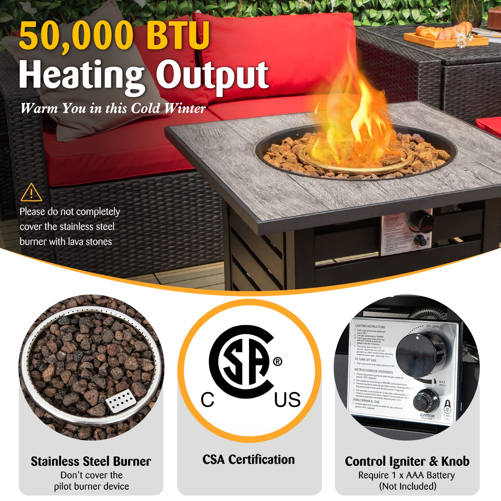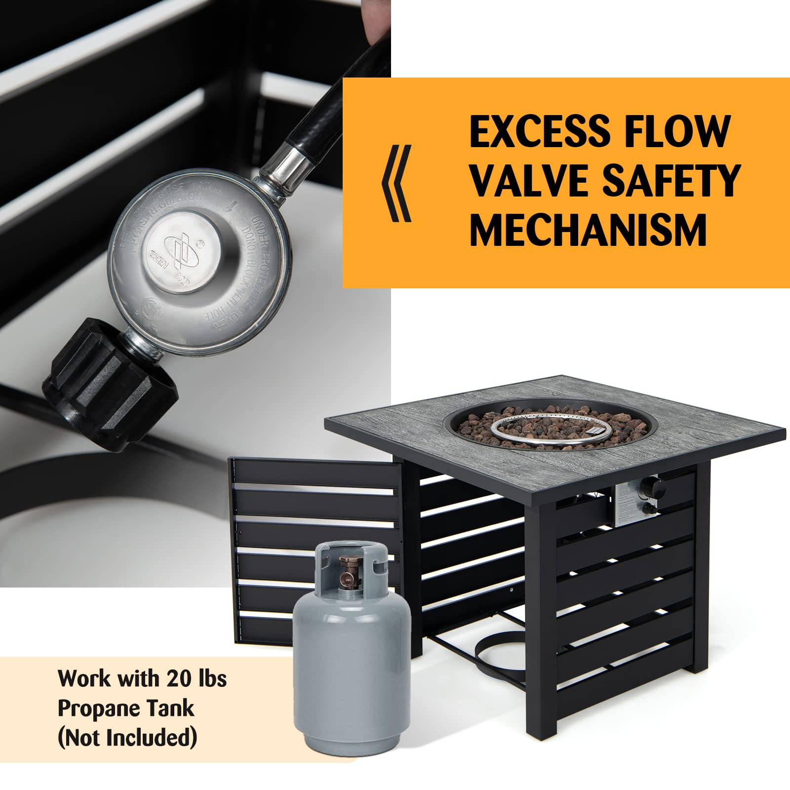 Once you connect it with a 20 lbs propane tank (not included) with excess flow valve safety mechanism and then turn on the 50,000 BTU fire pit table, you can get a steady and efficient heating experience. When you sit around this propane fire pit table, you will see the beautiful and adjustable flame with lava stones to bring a warm atmosphere. What's more, the high-temp resistant tabletop and steel frame as well as the CSA certification ensure safety during use. And there is a waterproof cover to protect the fire pit table from the changing outdoor environment.