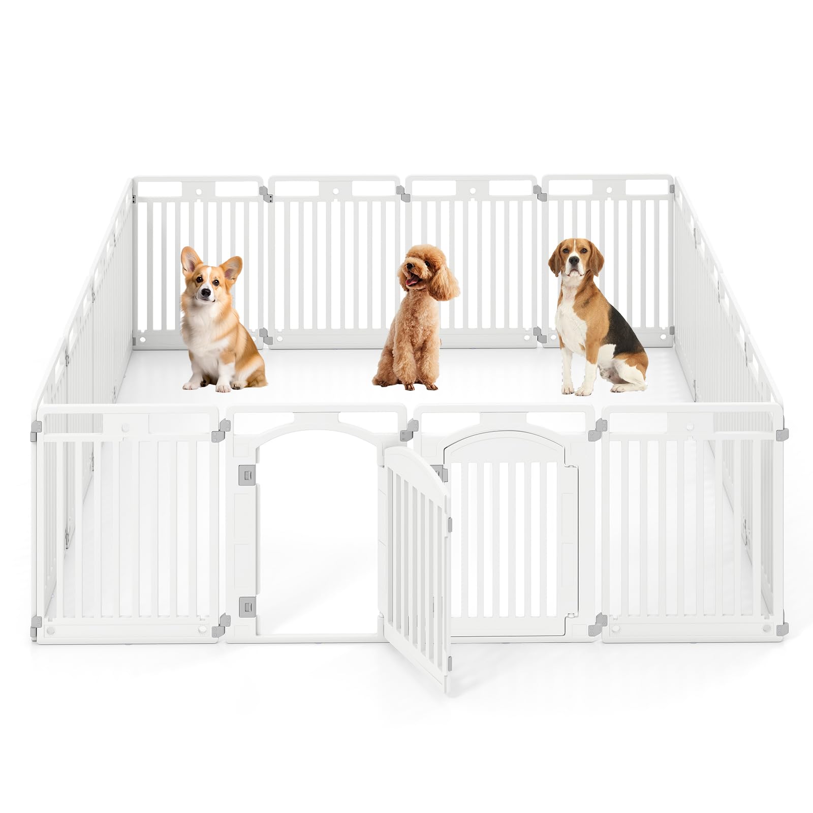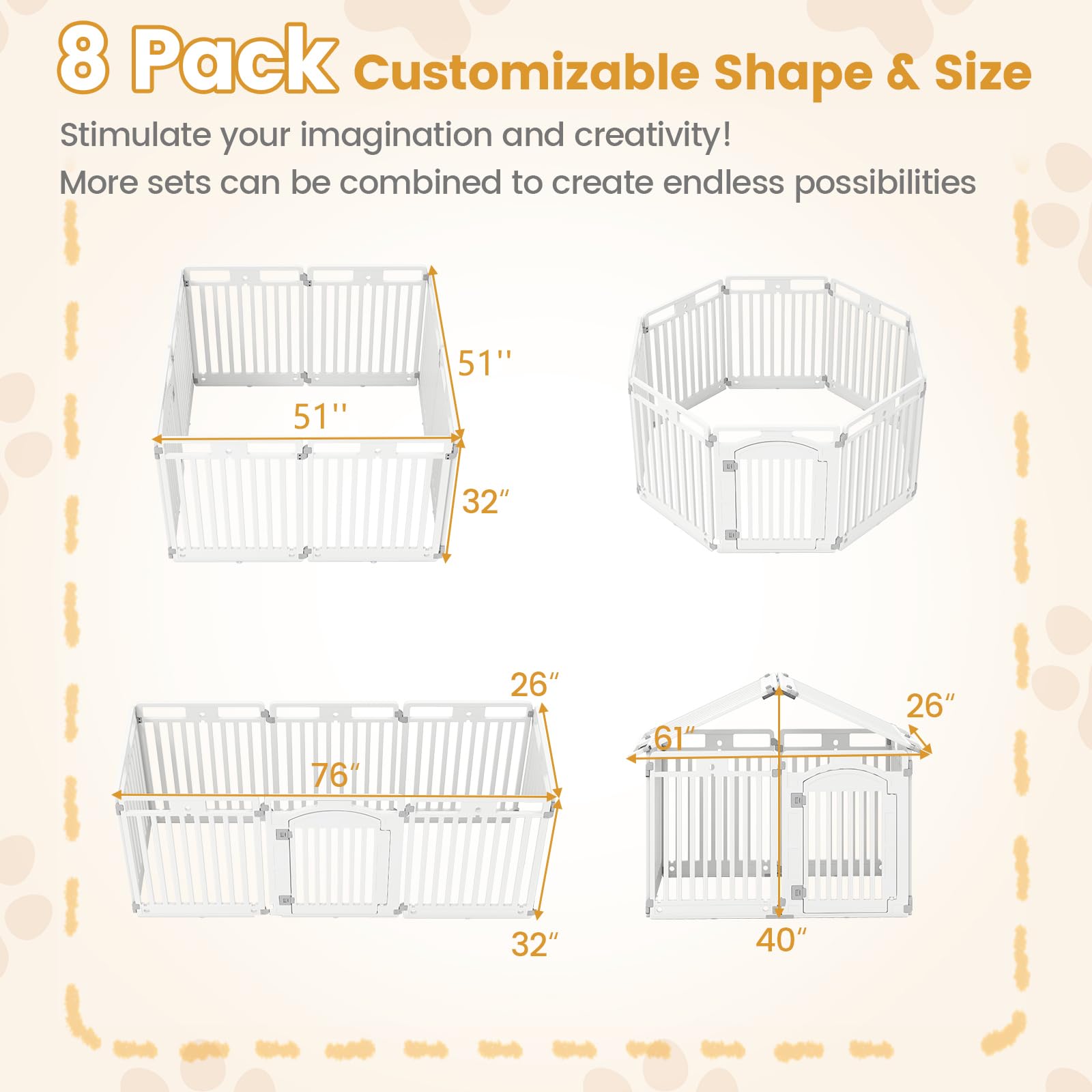 Give your pets a secure and versatile space to play, rest, and explore — indoors or outdoors. This 8-panel plastic playpen is made of durable, waterproof HDPE and can be arranged into various shapes like a rectangle, hexagon, or a cozy house-shaped enclosure with a roof. Each panel features smooth, rounded edges for safety, and one includes a lockable door for convenient access. With anti-slip suction cups for indoor stability and ground stakes for outdoor use, this portable fence is ideal for small to medium-sized pets.