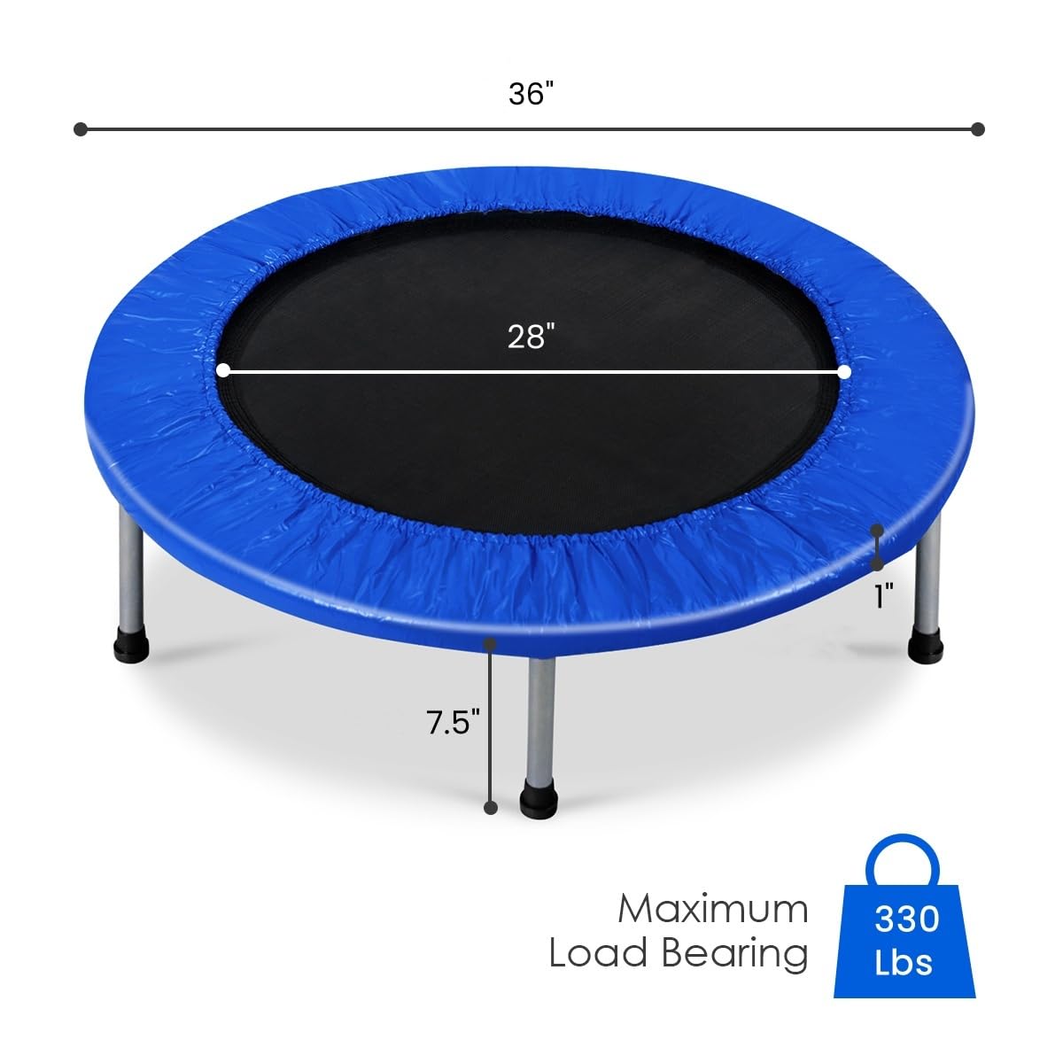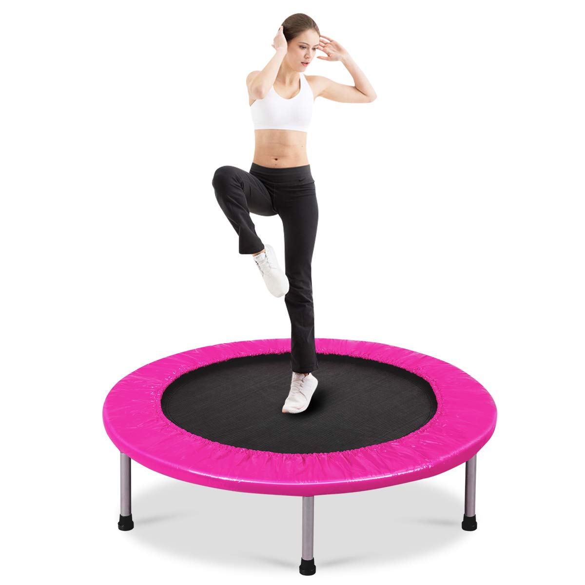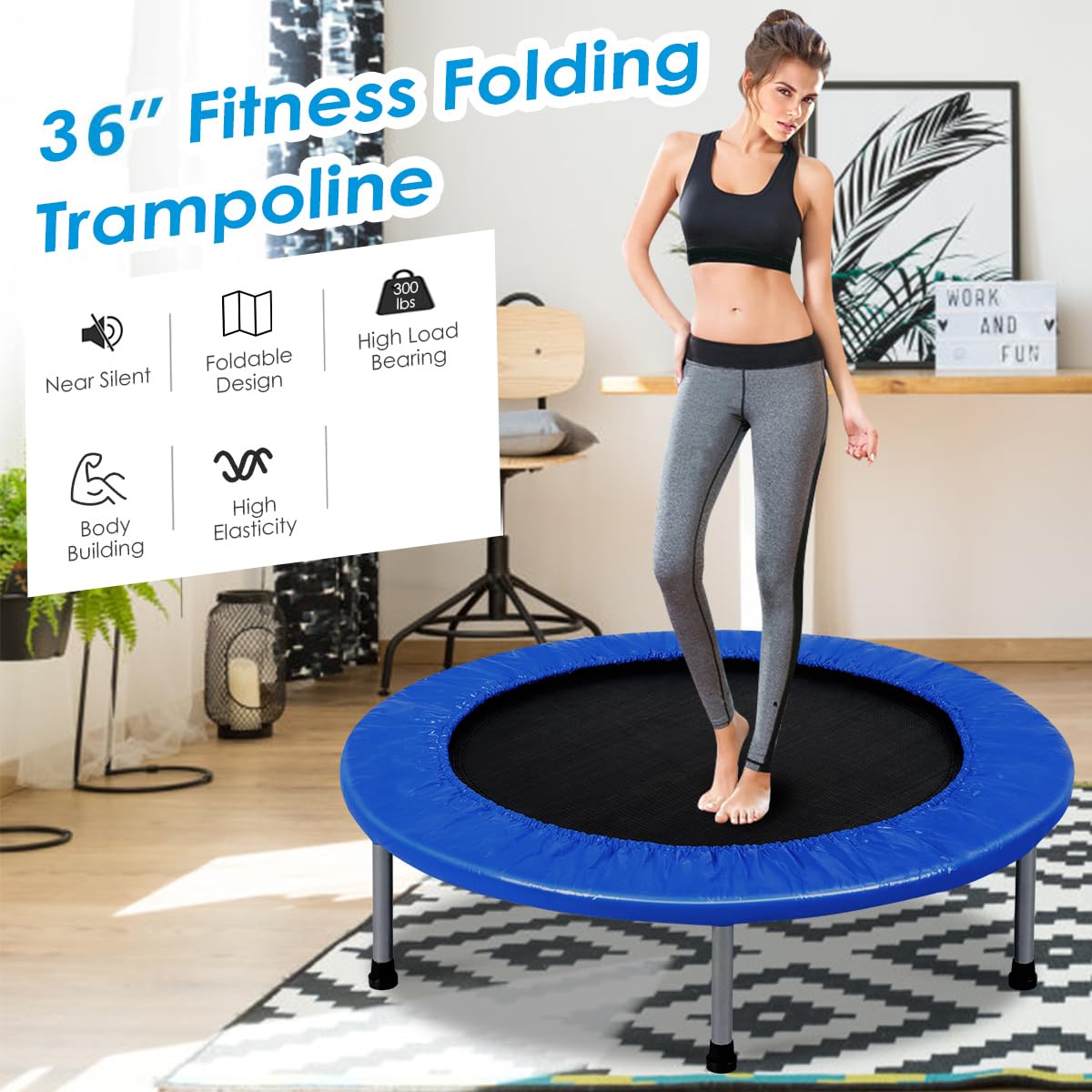 This is our Giantex 36" Foldable Mini Band Trampoline which provides more convenience and fun to bounce and work out. It features sturdy construction and safe design. The whole frame and legs are constructed of rust-resistant and durable metal which maintains years of use. The six legs with protective rubber feet ensure stability and balance and protect floor from being scratched for indoor use. The jumping mat is made of high-resilience PP material and connected to the trampoline edge with manysprings, which ensures your safety while you are enjoying your jumping time. It comes with thickly padded cover for its no-pinch springs and large rubber feet for stability. The foldable design is convenient for storage and maintenance.
