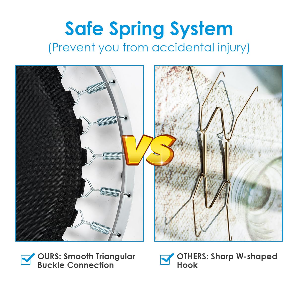 - [High-resilience Jumping Mat] The jumping mat is connected to the round edge with 28 springs, providing powerful support for a spacious and flat jumping surface. Enjoy a fully immersive jumping experience with a maximum load capacity of 330 lbs.