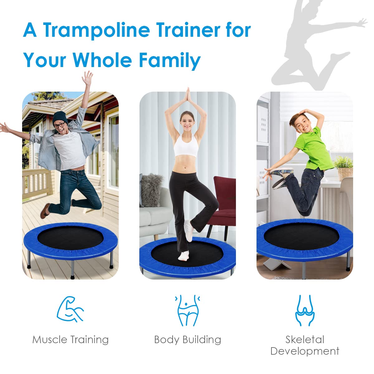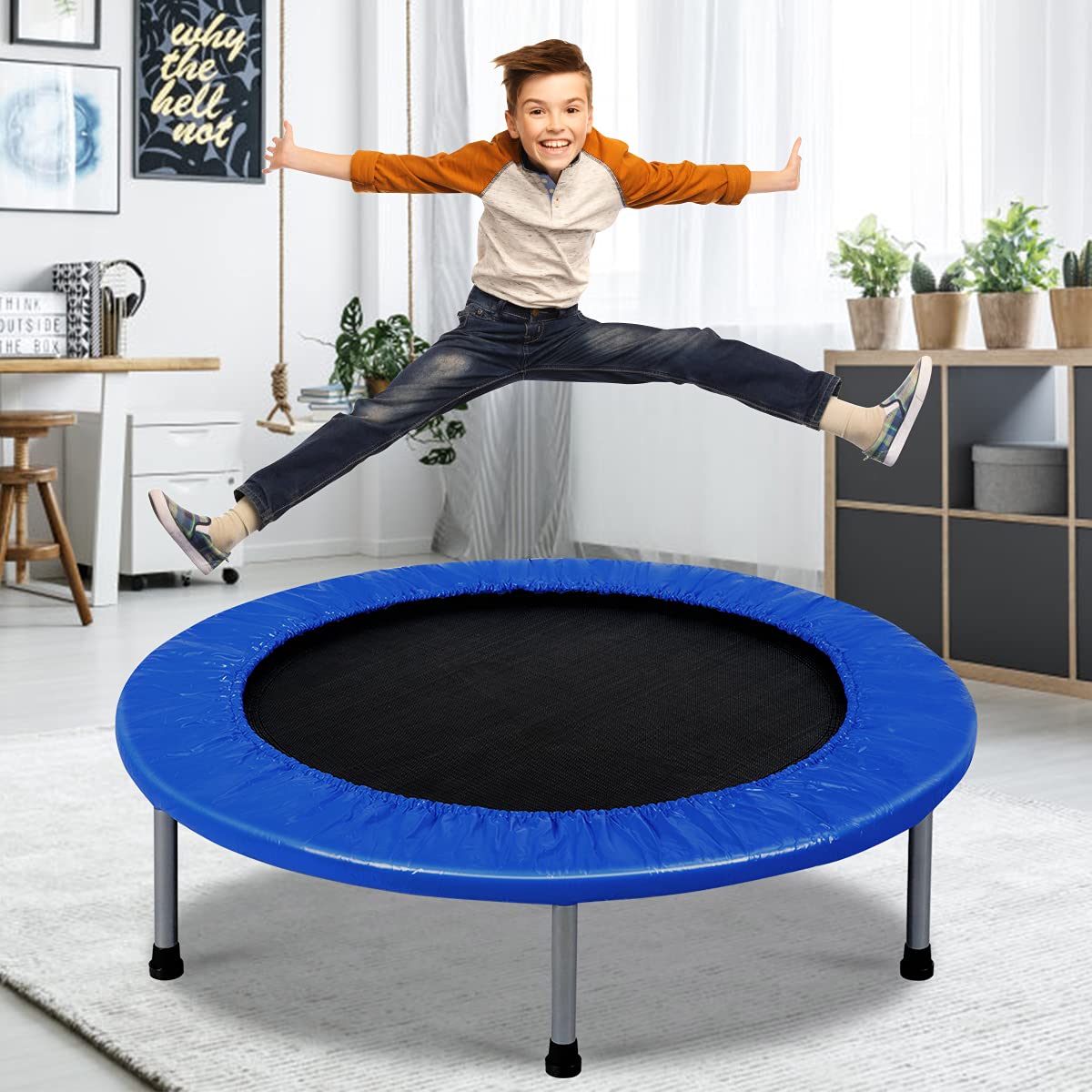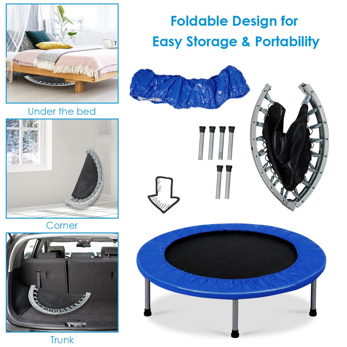 - [Space-saving Foldable Trampoline] A detailed manual and complete accessories provide great assistance for assembling the trampoline. Thanks to its folding design, it can be easily stored under the bed, sofa, in the car trunk, closet, or any other space. Product Dimensions: 36" x 7.5" (Diameter x Height).