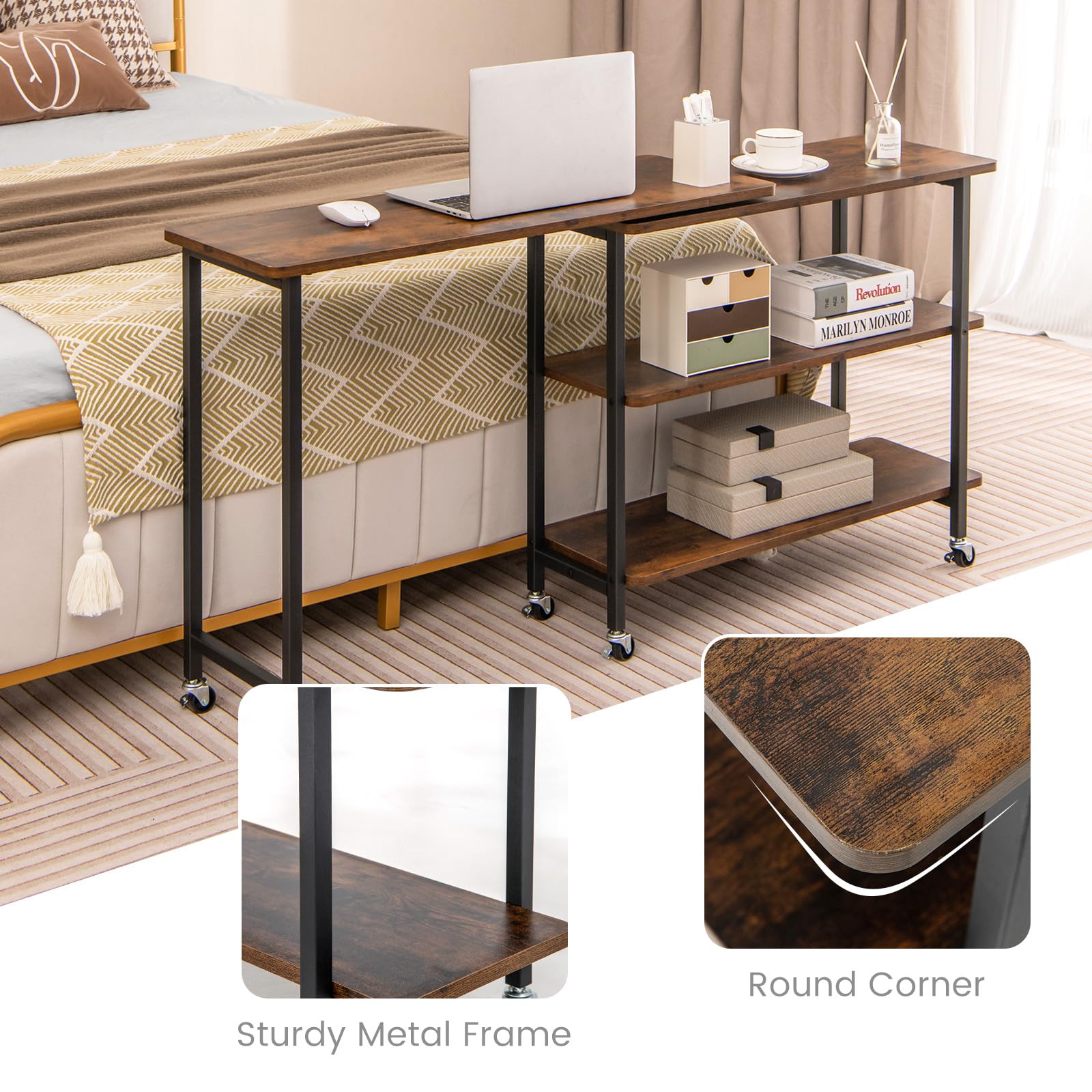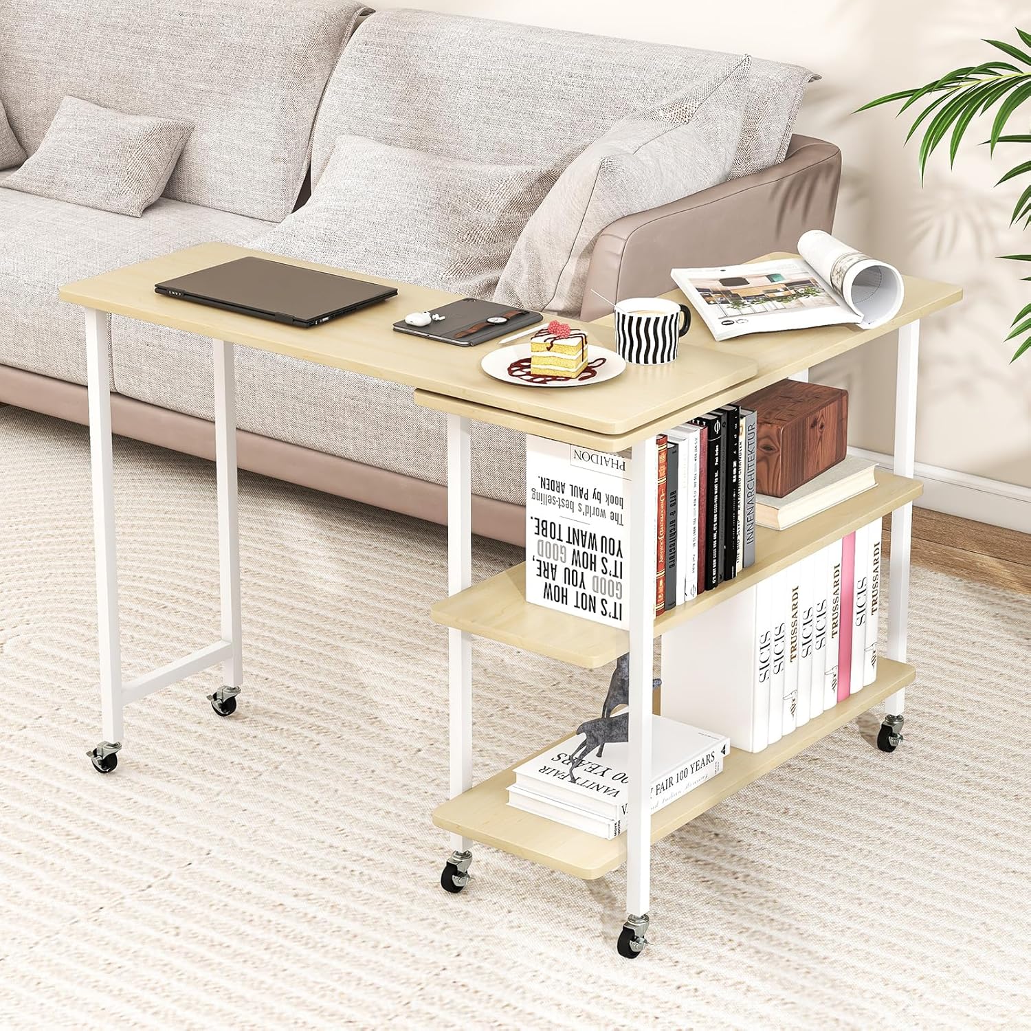 With 360°rotating function, the sofa side table is easy to transform its shape and perfectly fits different scenes and meets needs. Besides, the spacious tabletop and 2-tier storage shelf easily accommodate daily supplies and keep space tidy. The 6 universal casters with brakes allow you to move the side table easily and keep it in place. You can take it as a bedside table, end table, couch table, etc and put it at your home or office.