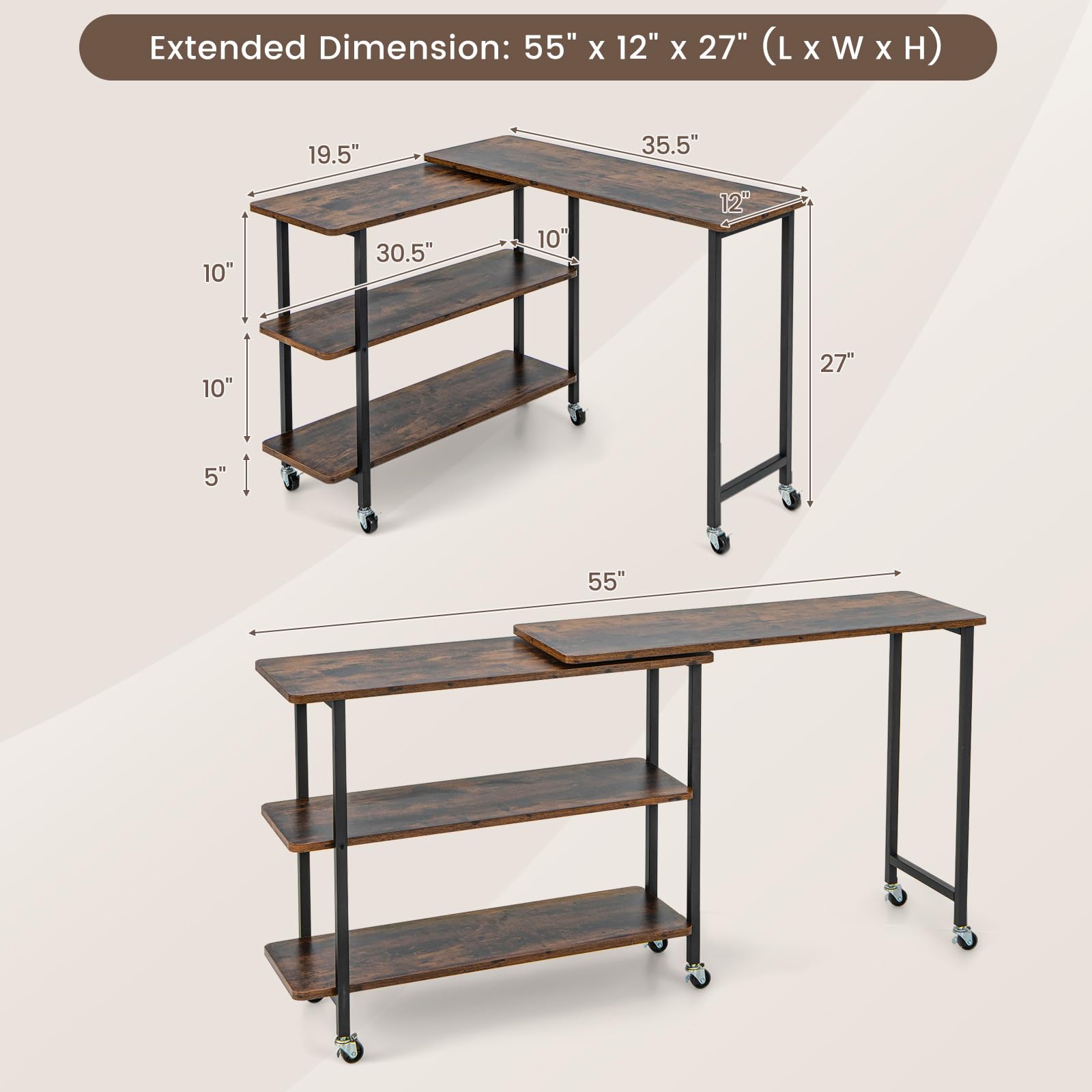 • 6 Lockable Universal Wheels: Equipped with 6 universal wheels, the L-shaped laptop desk is easy to move, offering you lots of convenience. Plus, the brakes keep it in place and greatly add stability.