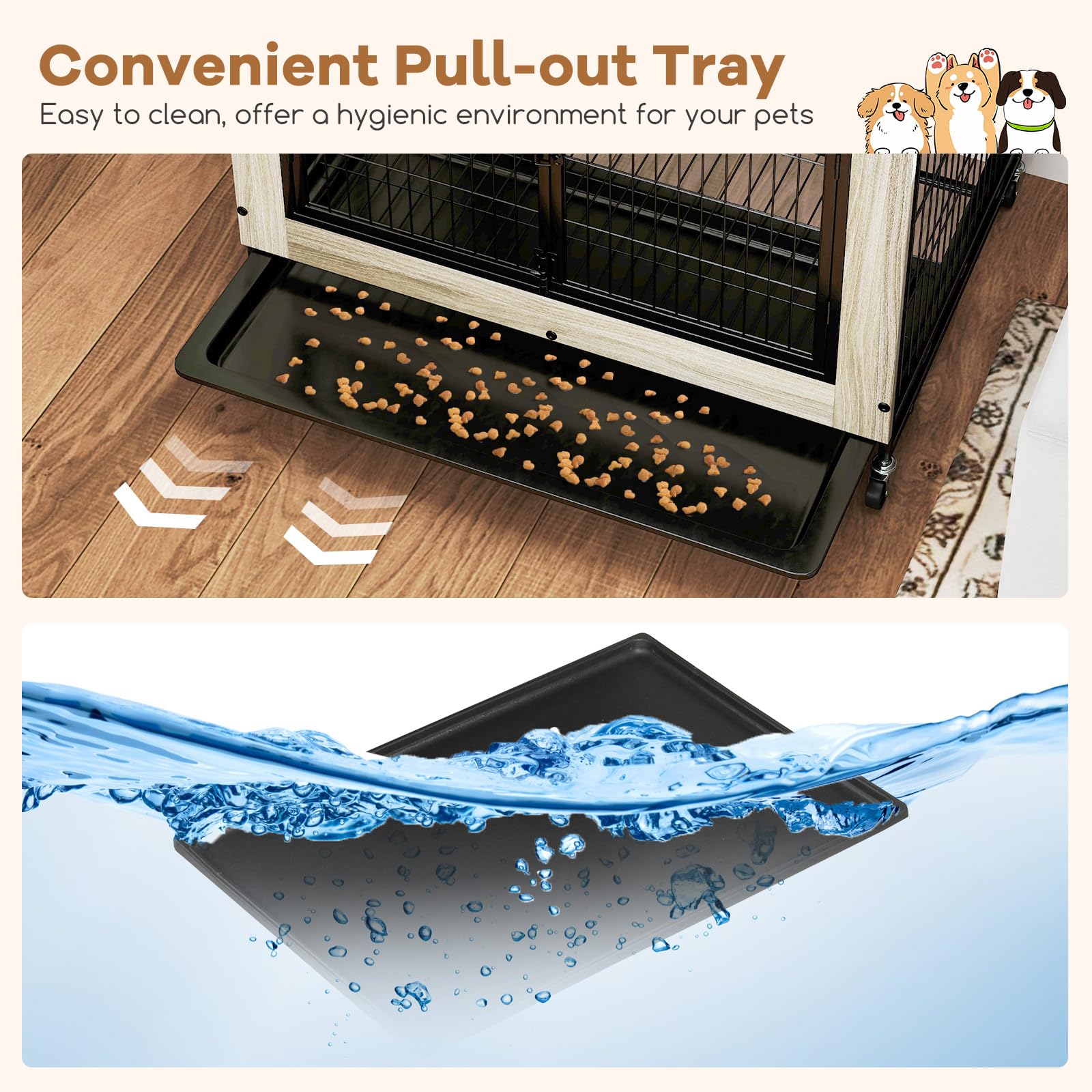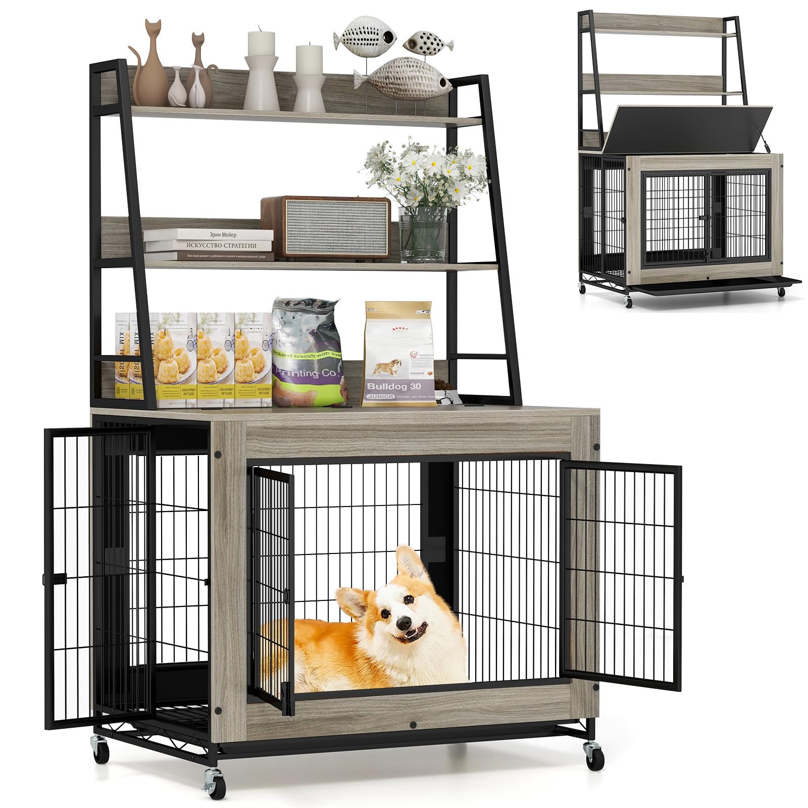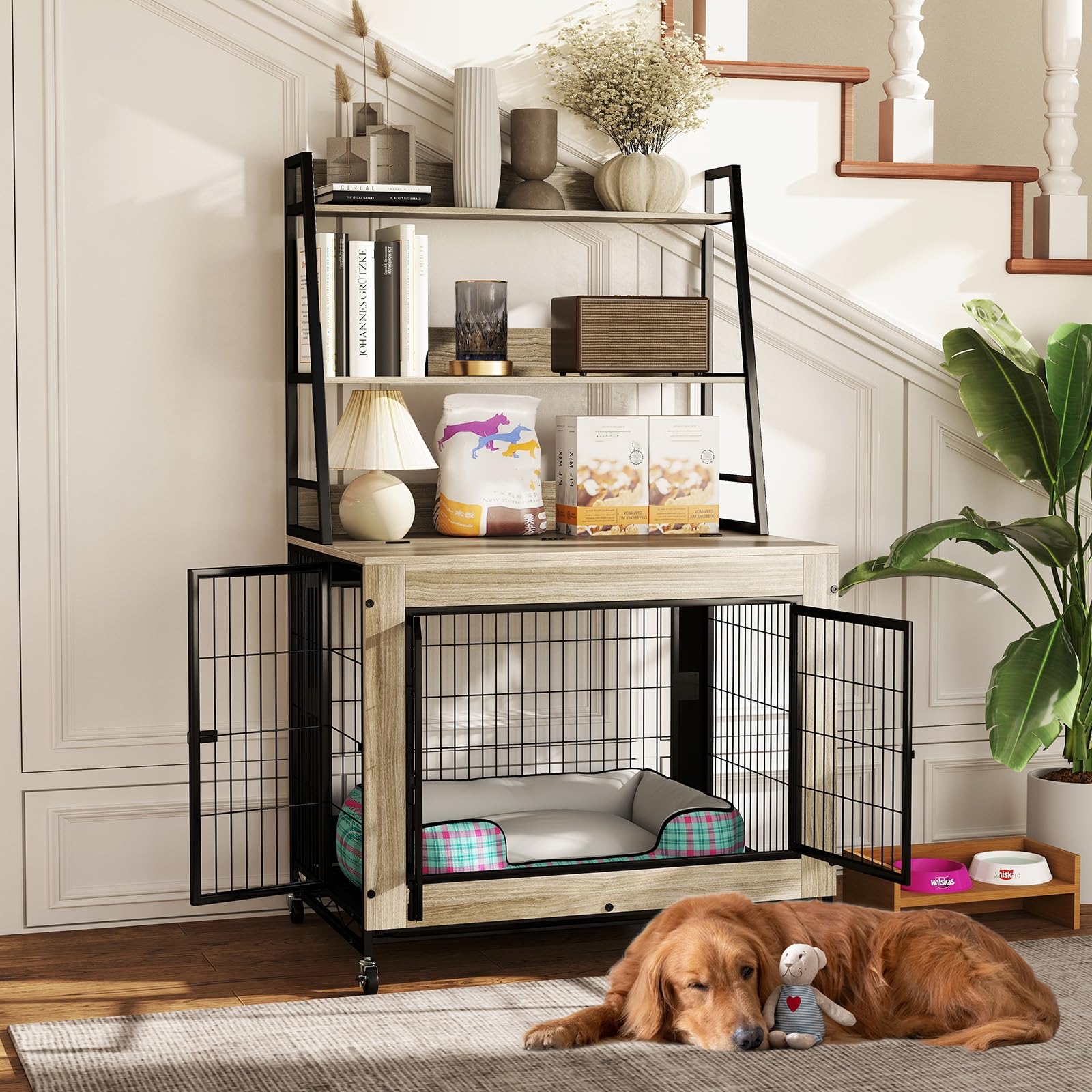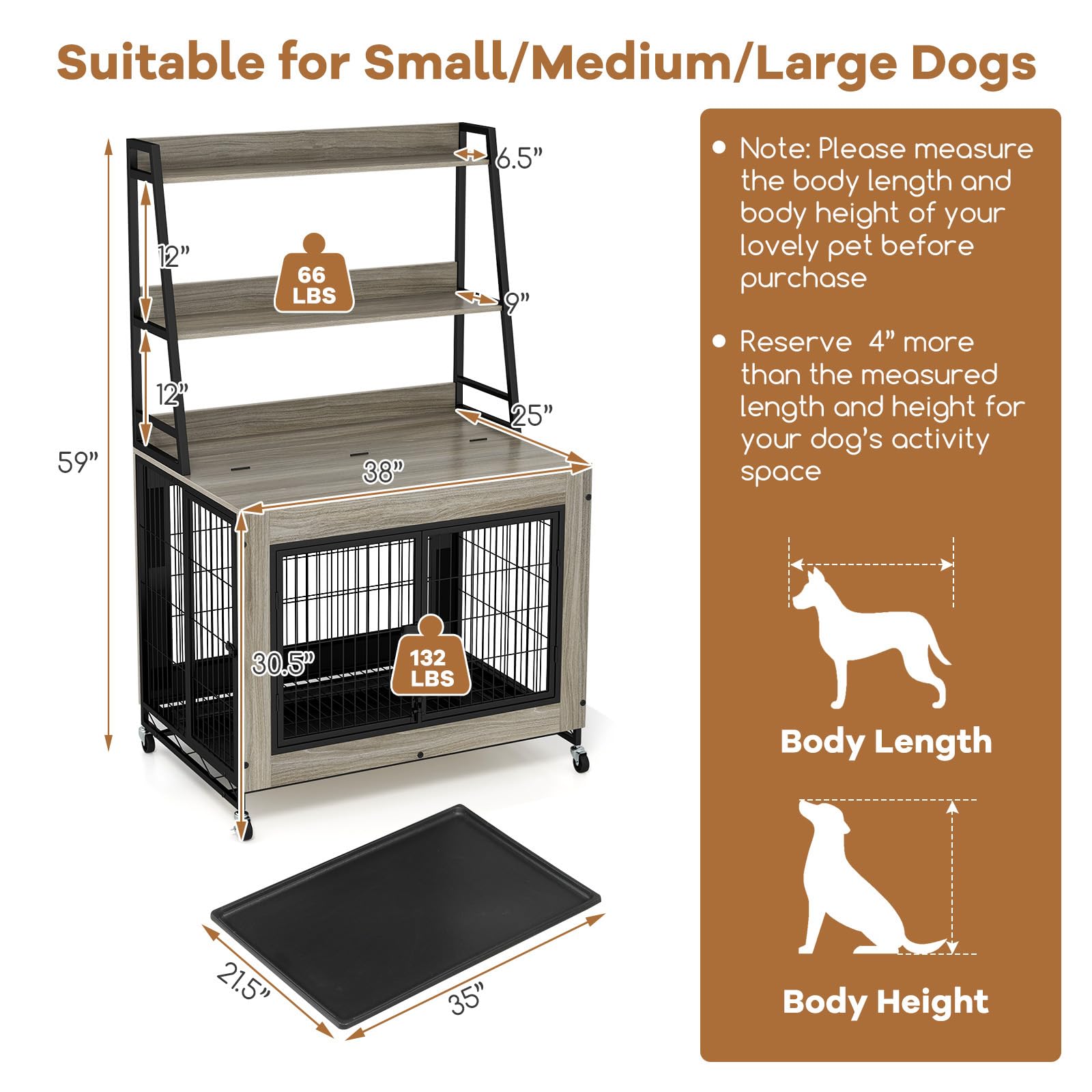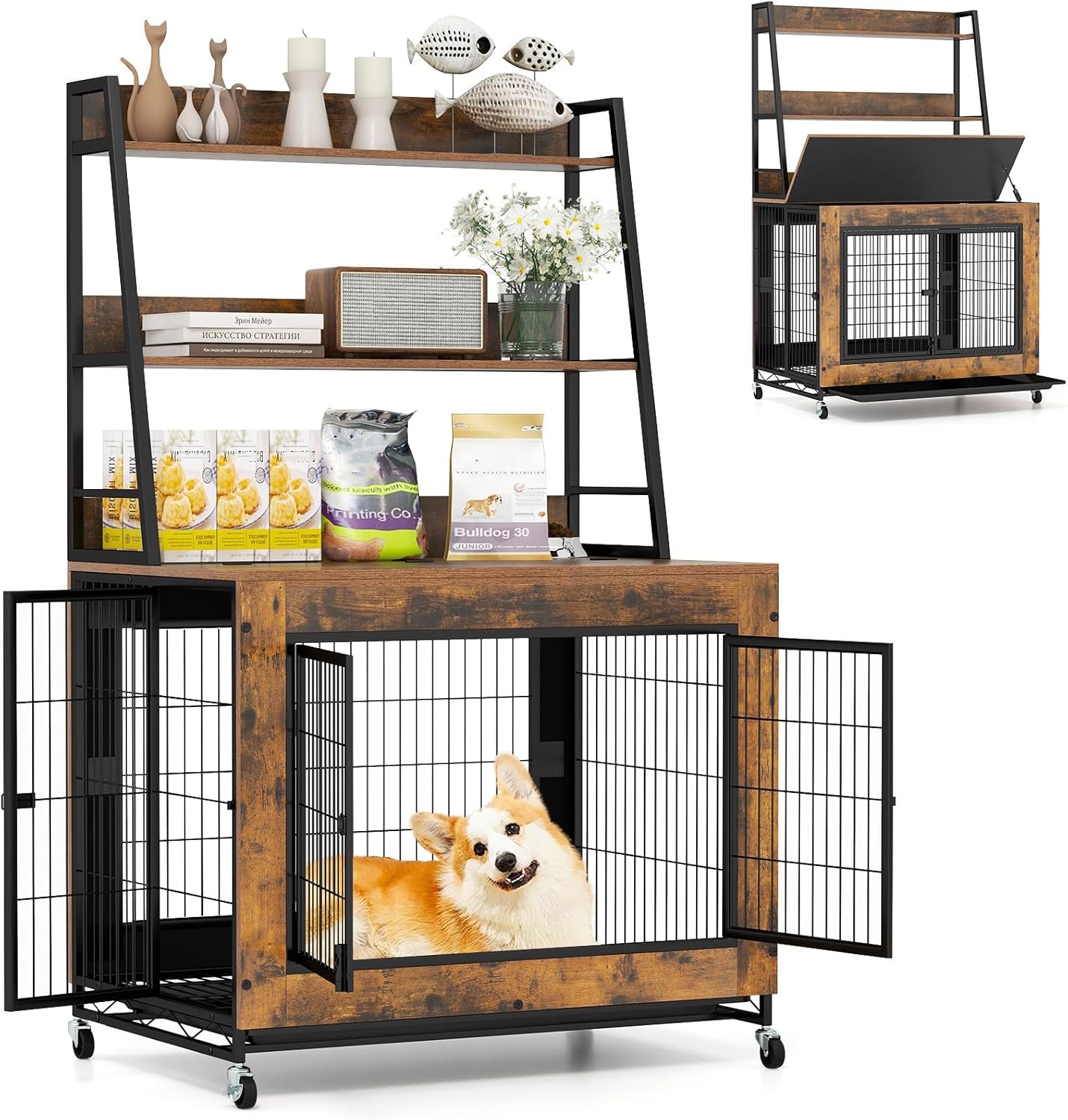 Our multifunctional dog crate furniture with storage shelves measures 38'' x 25'' x 59'' (L x W x H), which doubles as a chic bookcase, media console, or accent table, providing comfort for your furry companion (ideal for small/medium/large dogs) while offering ample room for your storage and display needs. Constructed with chew-resistant metal tubes and premium MDF board, the crate provides a safe and secure environment for your pet while standing up to daily wear and tear. For easy access, it is equipped with double front doors and a side door, all secured with robust locks, making it convenient for your dog to get in and out from both directions. The innovative flip-up top opening, supported by damping rods, ensures smooth and controlled operation, enhancing the bond between you and your furry friend. Moreover, it boasts 4 universal wheels and 2 lockable, thus you can effortlessly move it from room to room. Thanks to its pull-out tray and waterproof surfaces, cleanup is also a breeze!