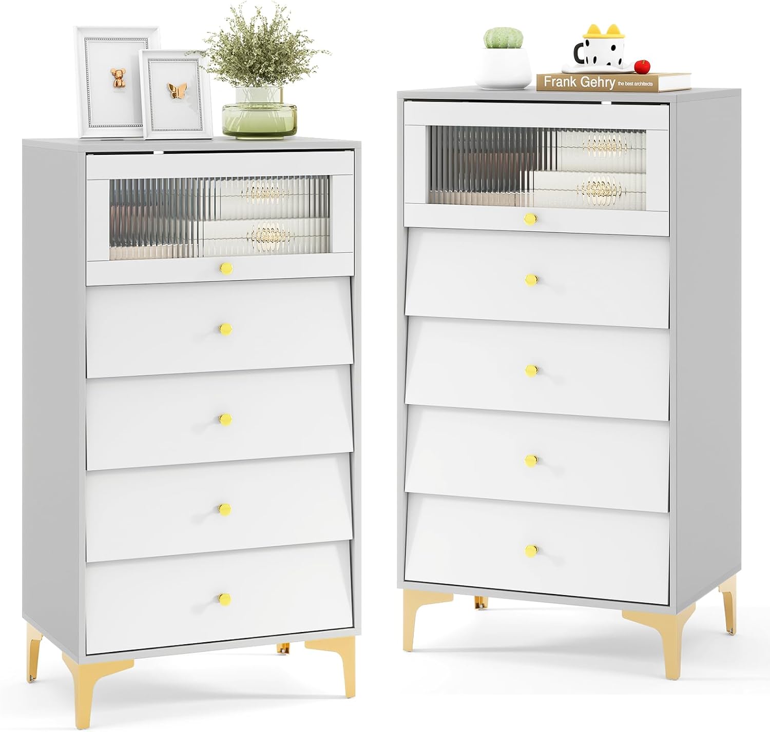 It is designed with 4 large drawers and 1 small cabinet to store your belongings. With L-shaped metal legs and an anti-toppling design, the freestanding storage cabinet will remain stable and steady for years to come. Additionally, the flip-up glass door allows for easy access to items within the storage organizer. The handy knobs and metal slides help you easily open the drawers to access your items. The fluted glass door and inclined drawer doors bring an elegant touch to any room. You can place it in bedrooms, hallways, or entrances. It is also easy to assemble and clean.
