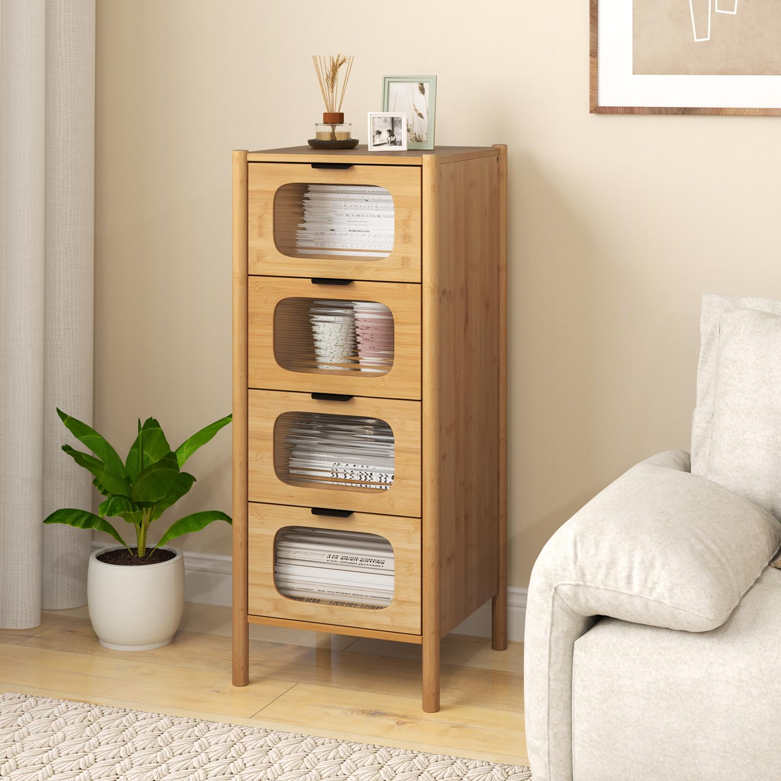 Featuring 4 drawers and wide top, this natural floor cabinet offers unique and versatile storage options. This sturdy bamboo storage organizer combines durability with style while the reeded tempered glass front adds a touch of sophistication. Additionally, this 4-drawer storage unit boasts a stable construction with raised support legs and non-slip foot pads. Plus, the anti-toppling device ensure the cabinet remains securely upright, providing extra safety. With its mid-century modern design, this storage cabinet adds a chic and retro charm to your space.