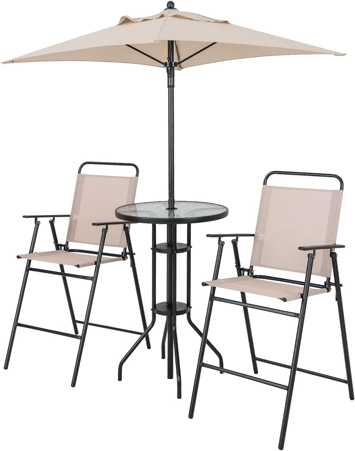 Enhance your outdoor space effortlessly with our all-inclusive patio furniture set! Boasting a cool square umbrella that shields you from relentless sun rays while letting refreshing breezes flow through, it’s a true summer essential. And that’s not all - our innovative folding bar chairs maximize space usage without sacrificing an ounce of comfort, thanks to their ergonomic design. Meanwhile, the covered fabric is breathable, quick-drying, fade-resistant and sun-proof, ensuring long-lasting comfort and durability. Crafted from robust, weather-resistant materials, this stunning set stands up to Mother Nature’s whims, promising years of enjoyment on any occasion. Assembling it is a breeze, as the umbrella is designed with spring button for easy assembly, and the assembly-free folding chairs open up in seconds. Don’t miss out on this ultimate ticket to upscale alfresco living!