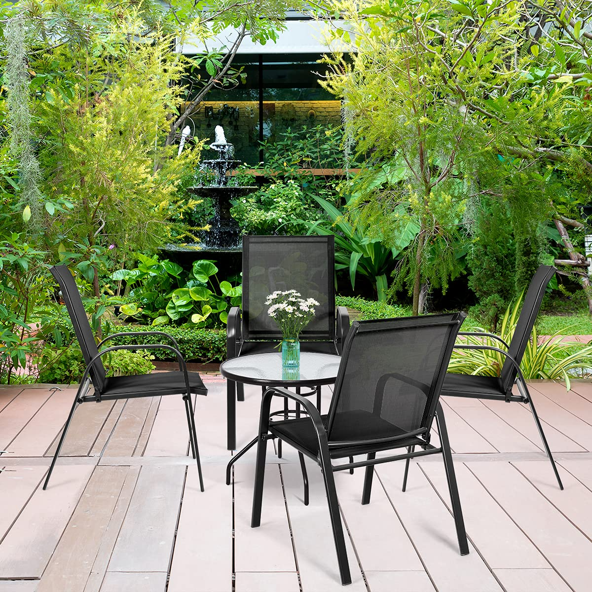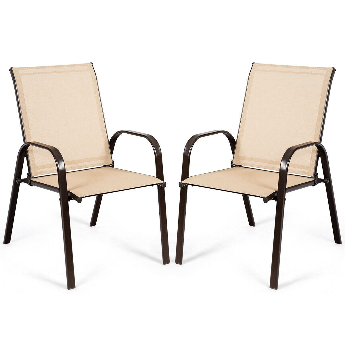 This set of 2 patio chairs combining with practical and modern design is perfect for your outdoor environment. Featuring with solid steel frame with powder-coated finish, this chair has high stability and strong durability. The breathable fabric is durable enough to support large weight capacity and it provides a concise look in any setting. In hot summer days, this chair will provide you with cooler sitting experience with the mesh fabric. Smart space-saving design is convenient for storage when not in use, which won't take much space. It is perfect for backyard parties, picnics, outings, or relaxing on a porch.