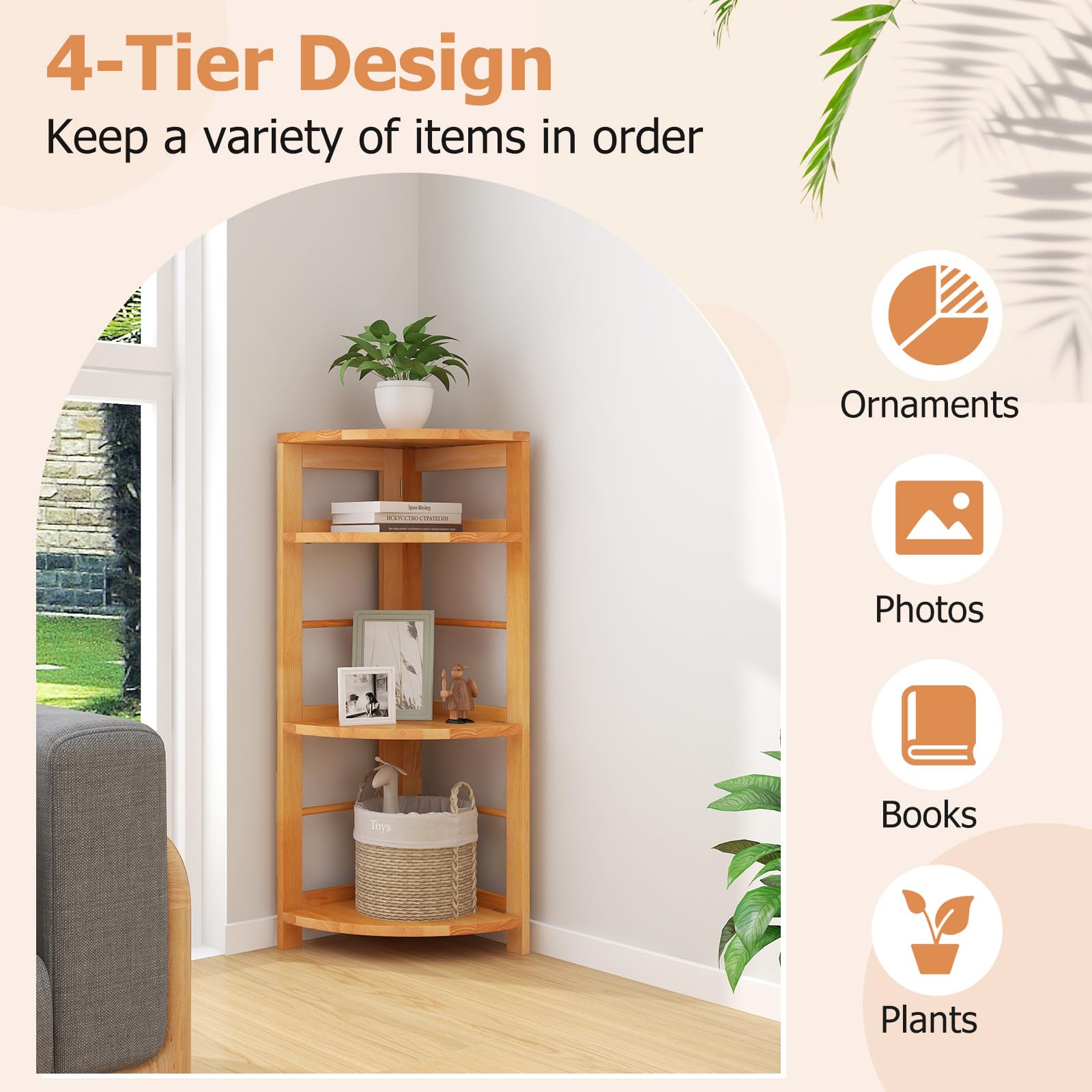 Maximize your corner space with our 4-tier storage shelf. From books to decorative accents, you can organize your essentials in a way that suits your needs. The corner shelf features 90 degrees triangular design to effectively use the limited space. Moreover, the floor storage shelf is constructed of solid rubber wood frame, known for its sturdiness, durability and long lifespan. With the included anti-toppling device, you can securely attach the bookshelf to the wall, preventing wobbling or tipping over. This 4-tier corner shelf not only offer practical storage solutions but also doubles as an attractive display rack.