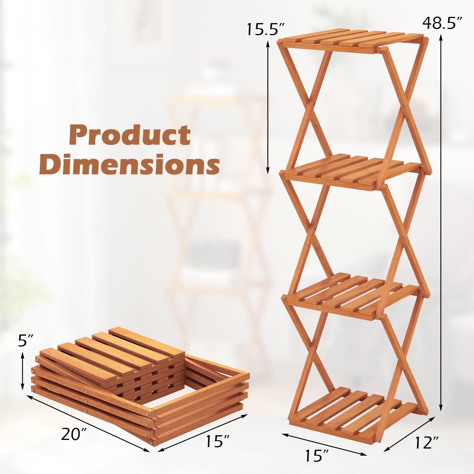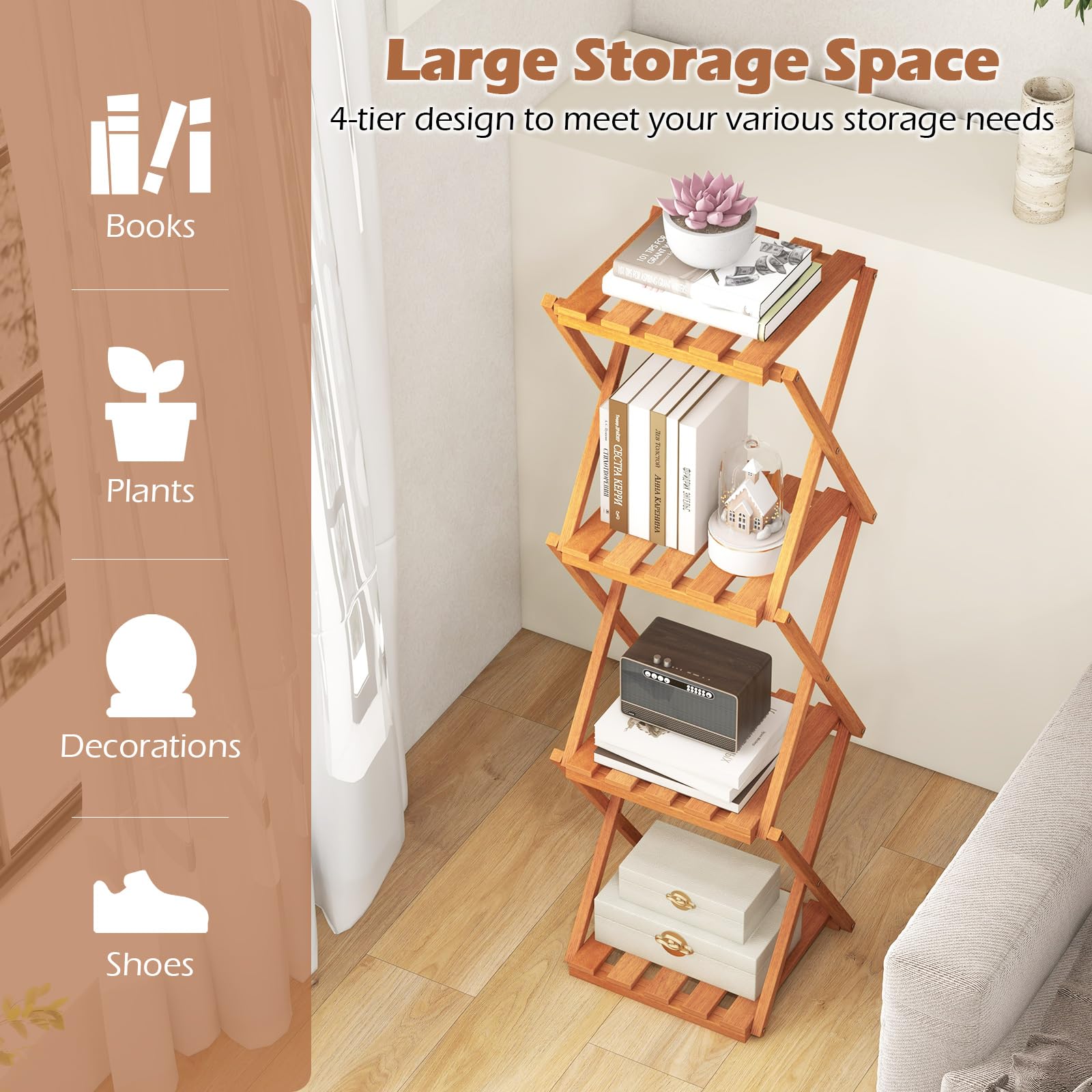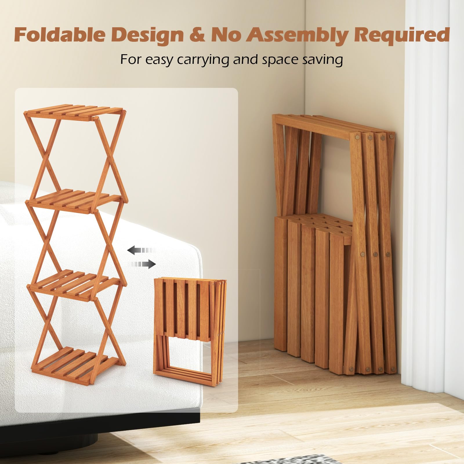 Are you looking for a versatile and stylish storage solution that adds a touch of elegance to your home? Our wooden plant stand offers a 4-tier design with 15.5" spacing between shelves, perfect for organizing books, plants, decorations, and shoes. Besides, the quick folding design saves space and is ideal for small rooms or apartments, while the selected wood material treated with teak oil ensures durability. With a stable X-shaped frame and stylish hollow slat design, this plant stand exudes sophistication in any living space. Hence, our wooden folding shoe rack is perfect for entryway, balcony, and living room.