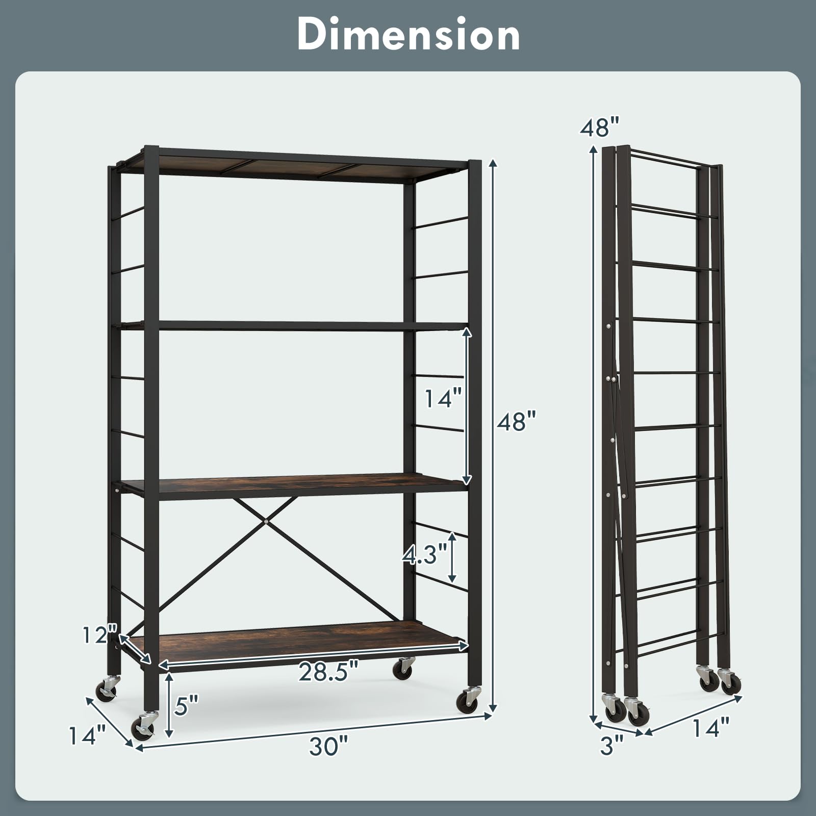 Are you in need of extra storage space to avoid messy environment? Our 4-tier shelving unit is the perfect option for you. Its convenient folding design allows for easy expansion or folding as needed. Once unfolded, it provides 4 storage shelves to accommodate a variety of sundries. Additionally, all shelves can be assembled in 10 different positions, allowing for customizable storage based on your needs. If you require more vertical storage space, simply detach several shelves. Furthermore, our bookshelf is equipped with 4 universal wheels, making it easy to transport items from one place to another. Besides, 2 of wheels are lockable, ensuring the rack stays in place. Most importantly, this bookcase comes with anti-toppling device to maximize steadiness and security.