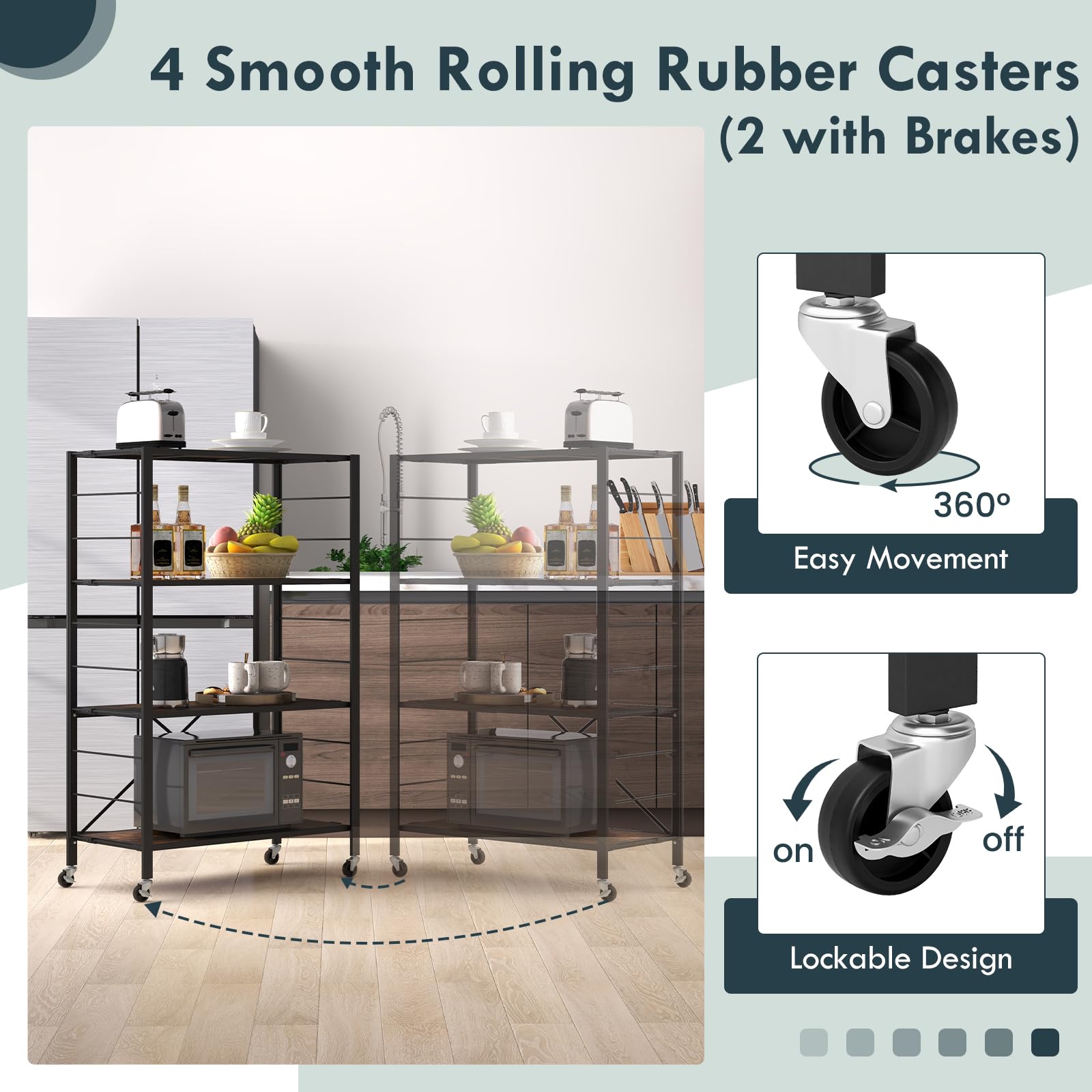 - [Easy Mobility & Secure Design]: The 4-tier shelf is equipped with 4 lockable wheels for smooth movement and can be securely locked in place with brakes. Move it around easily and keep it stationary as needed with the simple locking mechanism.