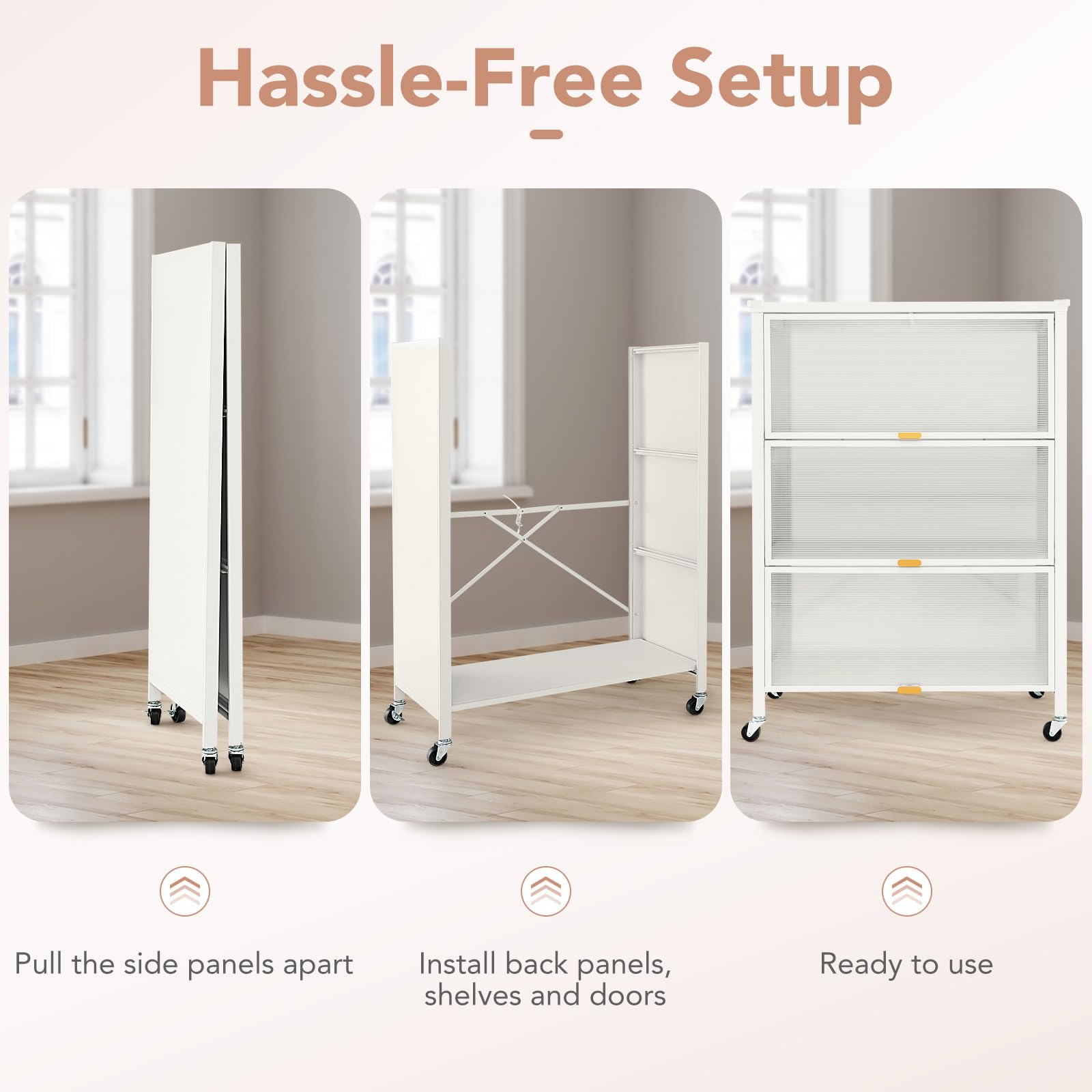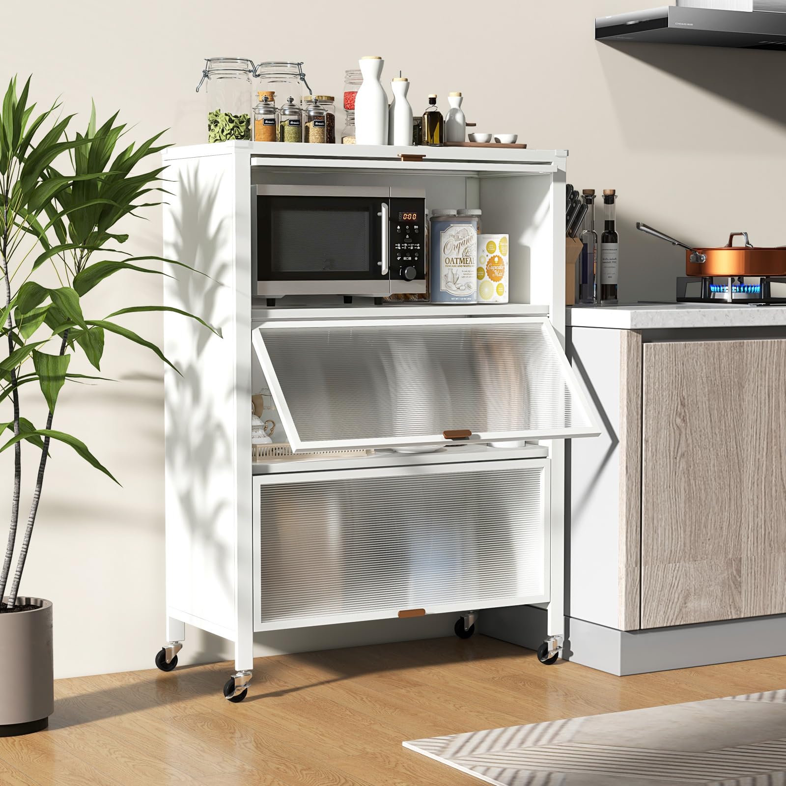 The rack provides a spacious countertop and 3 shelves for multiple items, while the transparent and flip-up PC doors offer visibility and keep out dirt. Its durable and rustproof metal construction supports heavy weight, enhanced with safety features like corner protectors and the anti-toppling device. Mobility is assured with 4 wheels, 2 of which are lockable. Furthermore, the main frame can be folded into a compact size with only 2.5” thickness, which save both effort and space. All in all, this kitchen rack is a perfect blend of functionality, durability and smart design.