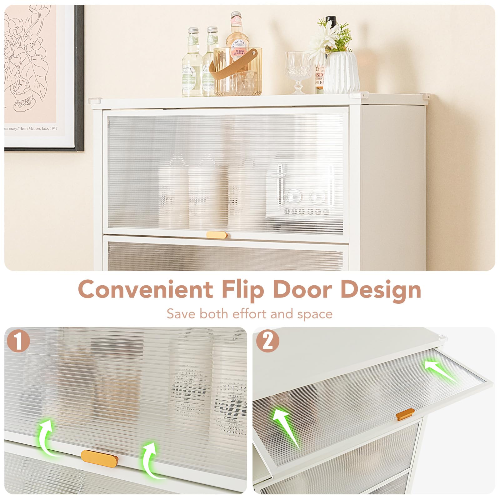 - [Hassle-Free Assembly]: The main frame of the kitchen cabinet is foldable for space-saving storage. To set up the rack, you just need to pull the side panels apart, install back panels, shelves and doors, and then the bakers rack is ready to use.