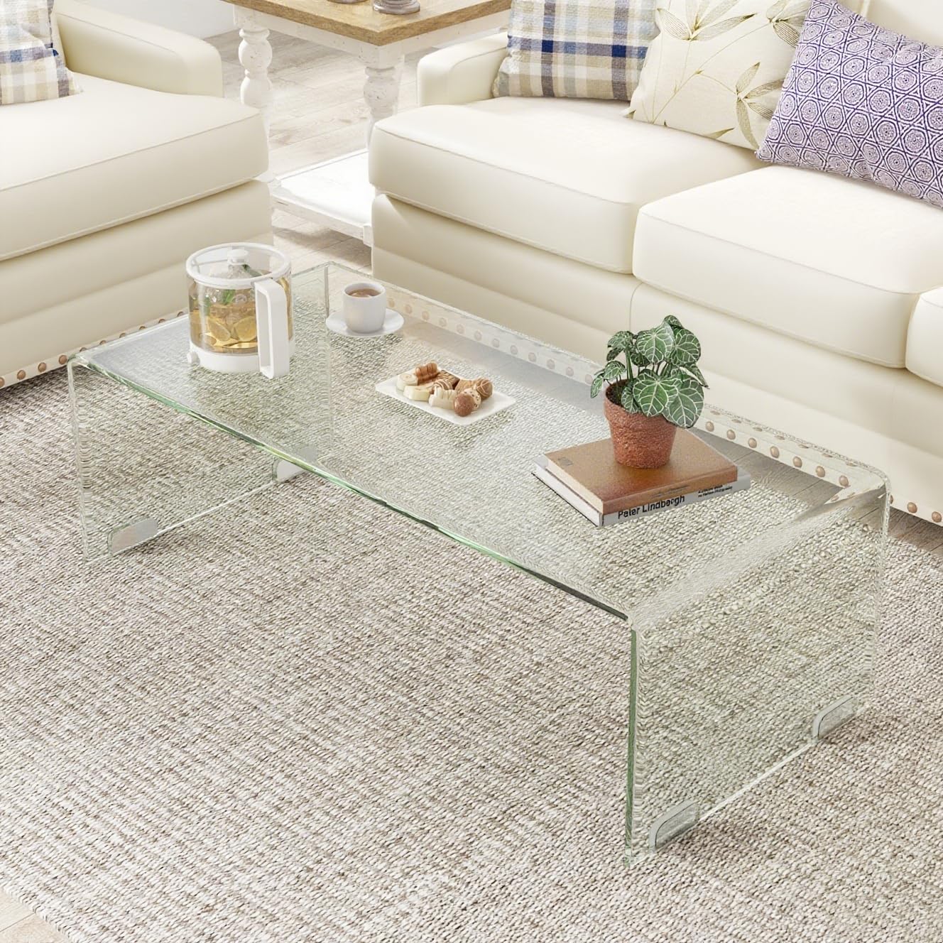 Add a touch of sophistication to your space with this modern glass coffee table, designed in a single smooth curve of clear tempered glass. Its transparent form brings an airy, open feeling, making your living room look brighter and more spacious. The wide tabletop is perfect for coffee, décor, or gatherings, while the open area underneath keeps books and magazines neatly stored. Whether paired with a cozy sofa or sleek lounge chairs, this table blends seamlessly into any style of home.