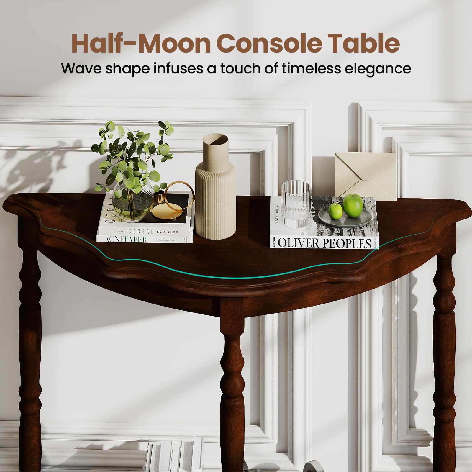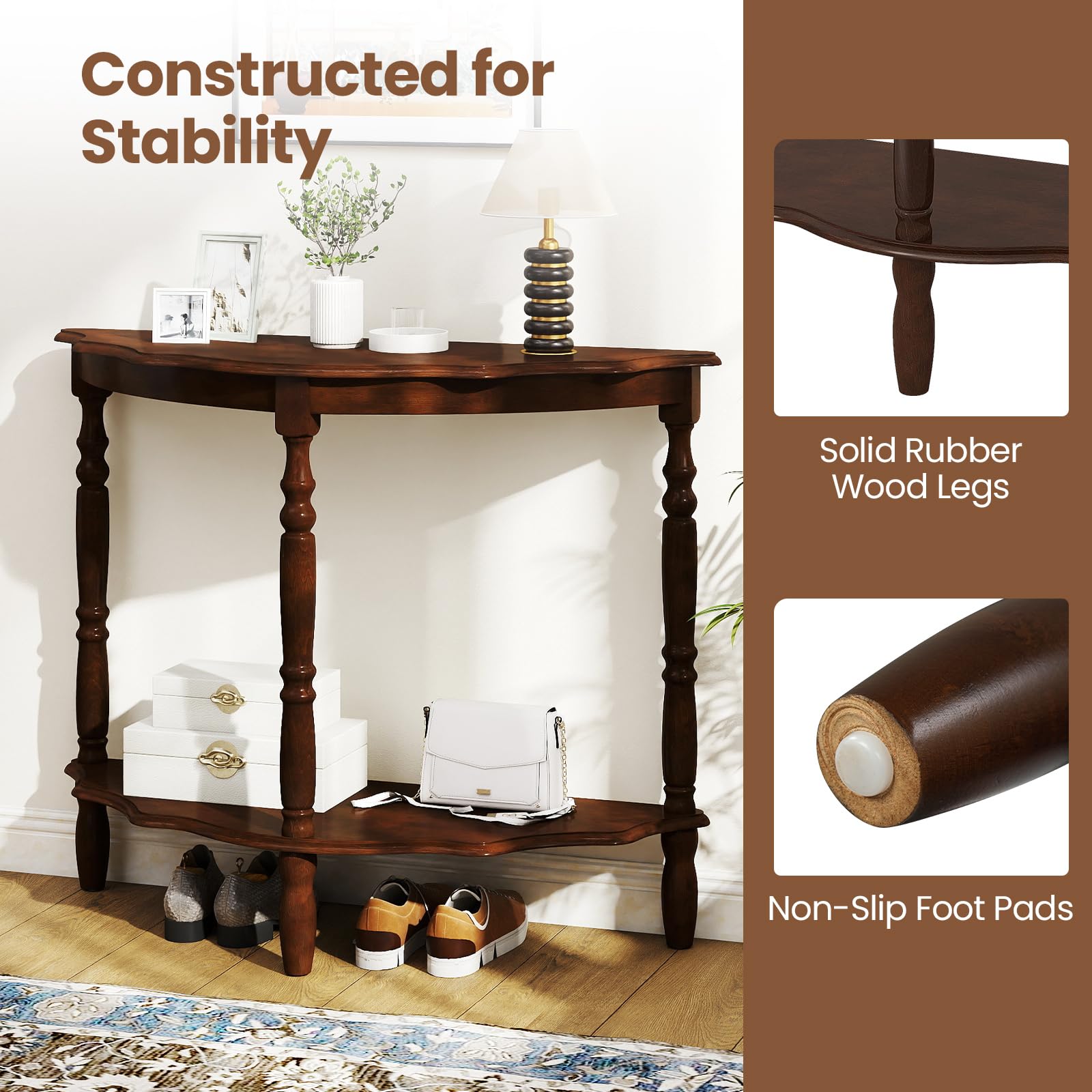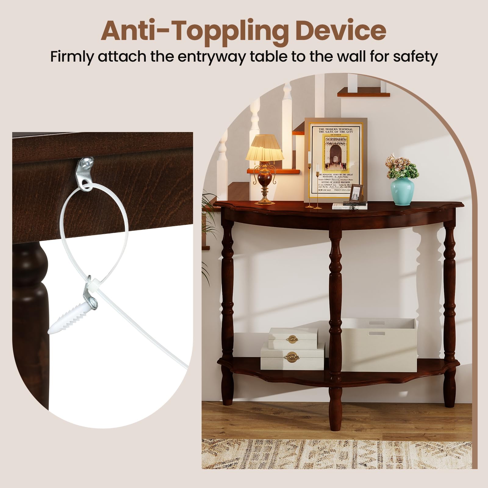 Featuring a timeless wave-inspired silhouette, this semi-circle sofa table adds a touch of elegant charm to your space. The 2 open shelves offer ample room for storing everyday essentials or displaying decorative pieces. Thanks to rubber wood legs fitted with anti-slip foot pads, the half round accent table offers lasting stability and durability. The anti-toppling device ensures secure wall attachment for your peace of mind. Stylish and versatile, this curved console table complements a wide range of spaces, making it perfect for your entryway, hallway, living room, and beyond.