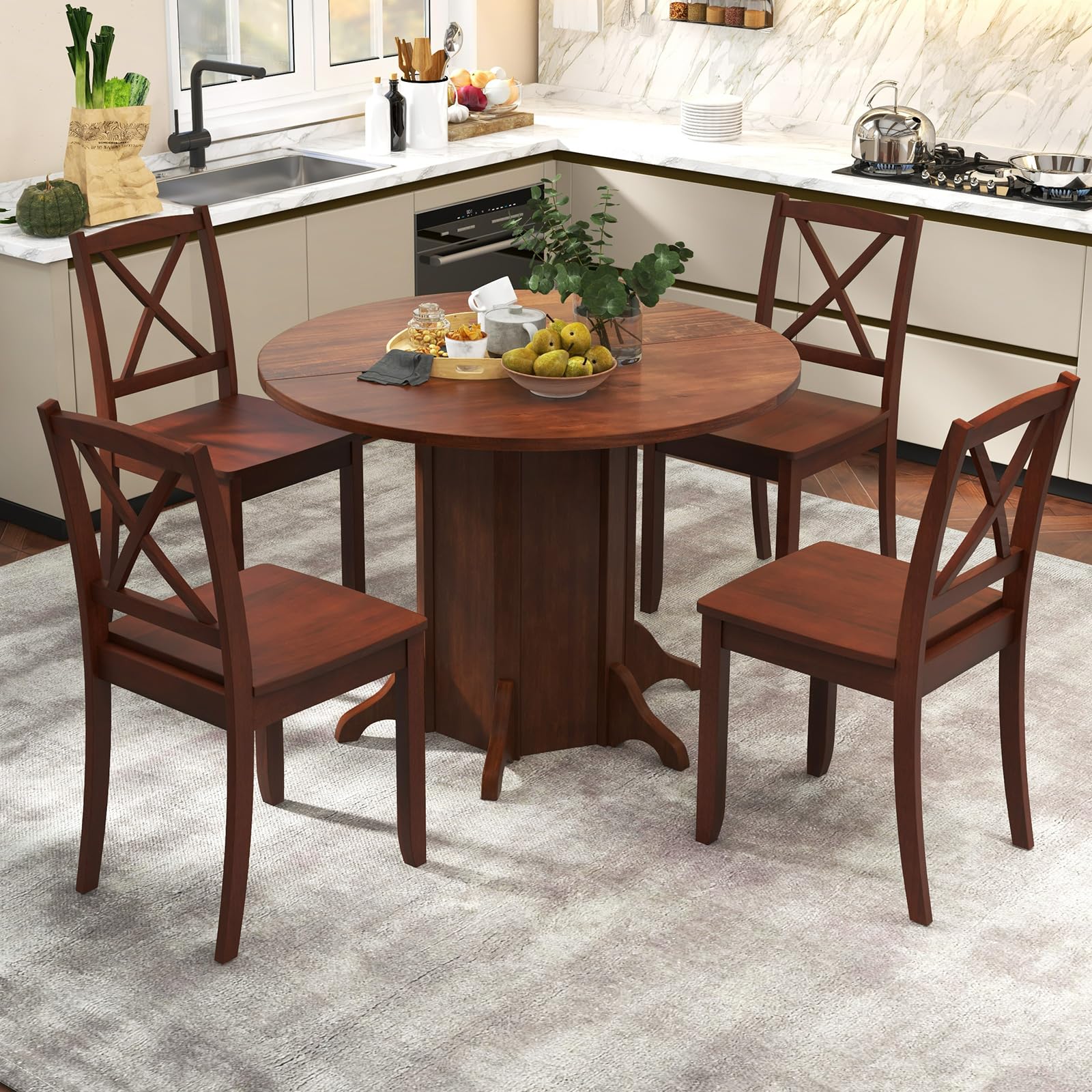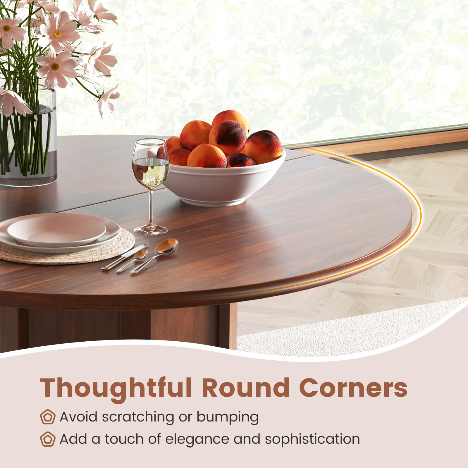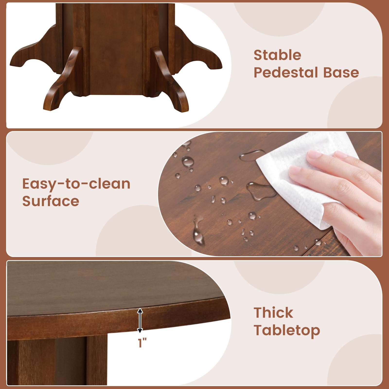 Our round dining table measures 42” x 30”(Dia. x H), which could seat up 4-6 people, making it ideal for intimate dinners or festive gatherings. Featuring warm and luxurious finishes complemented by soft round corners, it could create a cozy yet sophisticated ambiance in your home. Other than that, the kitchen table is supported by a solid pine wood frame and reinforced by a pedestal base, which is built for stability and durability, ensuring a secure dining experience. Cleaning and upkeep are also a breeze with the waterproof MDF tabletop. Make every meal a memorable experience with our wooden round dining table!