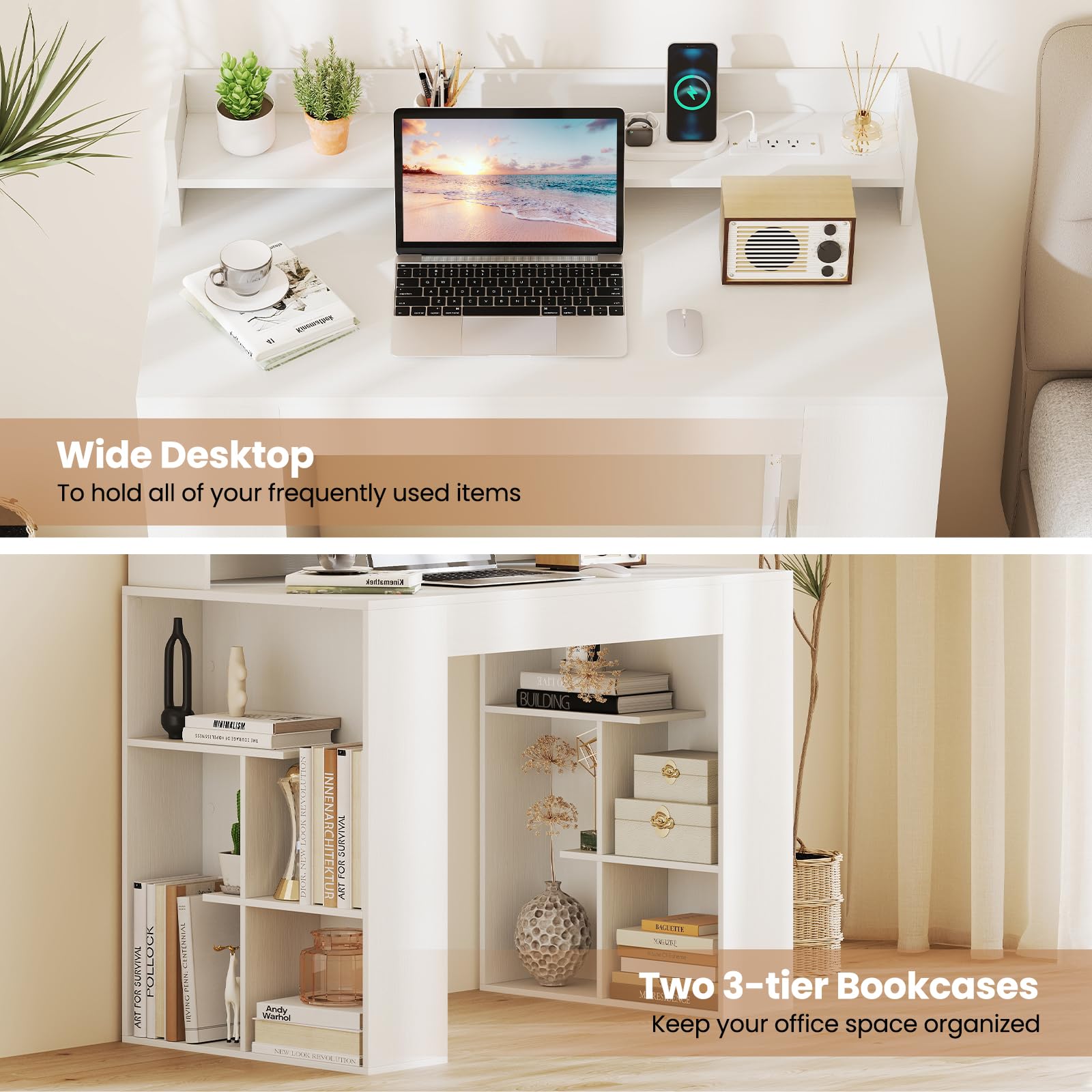 Transform your workspace into a hub of productivity and style with our versatile computer desk. Say goodbye to power struggles with the built-in ETL certified power strip featuring 2 AC outlets (125V/12A), a USB port and a Type-C port (5V/2.4A) - ensuring your devices stay charged and ready. Moreover, your room will stay organized with two 3-tier bookcases and a spacious desktop designed to hold all your essentials within arm's reach. Unlike others, ours features ergonomic monitor stand for a comfortable use experience, which promotes comfort and reduces neck strain during those long work or gaming sessions. Crafted with high-quality boards, this desk offers exceptional stability, supporting up to 350 lbs, making it perfect for gaming marathons, intense workloads, or daily use. Non-slip foot pads ensure your floors stay protected, while the easy-to-clean surface simplifies maintenance, saving you time and energy. Experience unparalleled comfort, convenience, and durability with this robust and user-friendly desk!