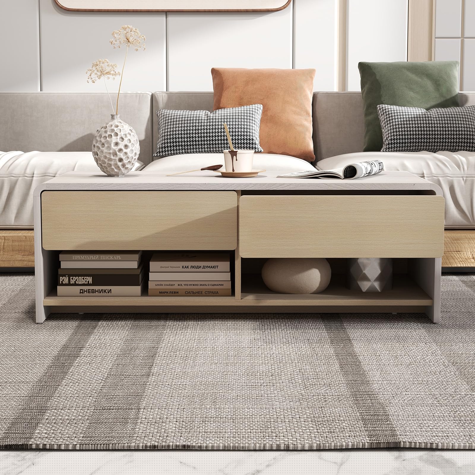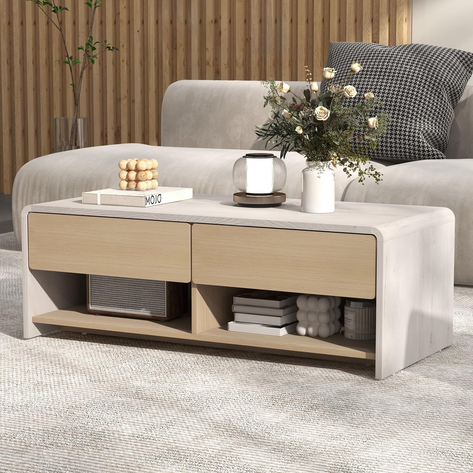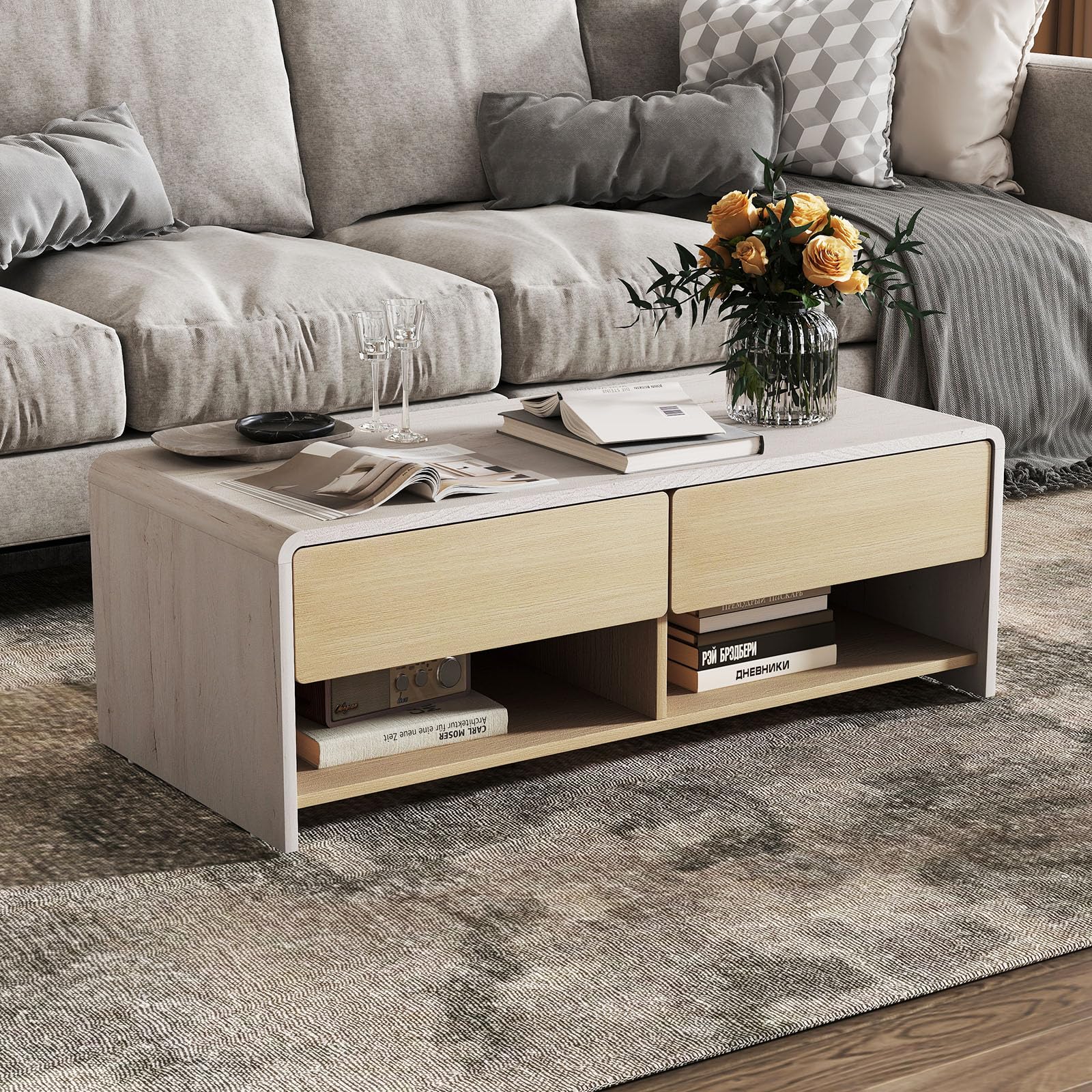 Elevate your living room's aesthetic with this exquisite coffee table boasting a contemporary hidden handle design that exudes elegance and modernity. Its clean lines and sleek appearance effortlessly blend with your existing decor, adding a touch of sophistication to your space. With a wide top surface perfect for beverages or showcasing decor items, along with 2 convenient drawers for storing personal items out of sight, this table is as practical as it is stylish. The addition of 2 open storage shelves provides ample space for books, remotes, or other everyday essentials, ensuring your living room remains clutter-free and organized. Not just a coffee table, this versatile piece can also function as a display or storage table, catering to various needs in your home. Enjoy the ease of cleaning and maintenance with its smooth surface, ensuring a spotless look with minimal effort.