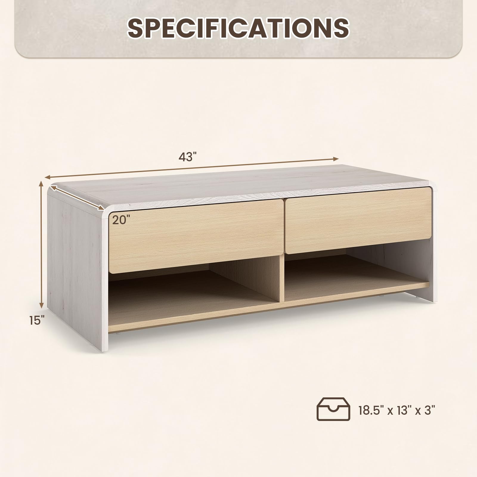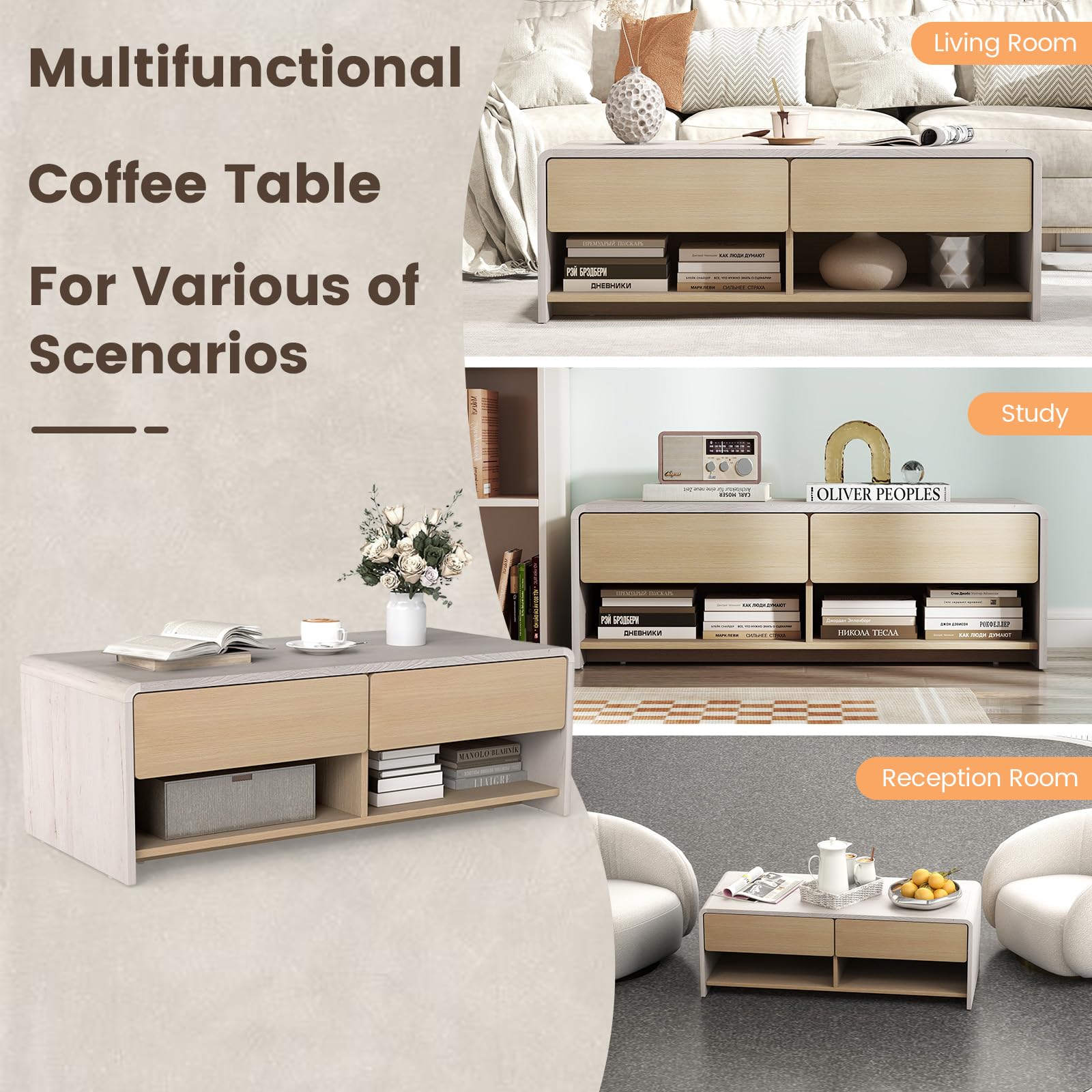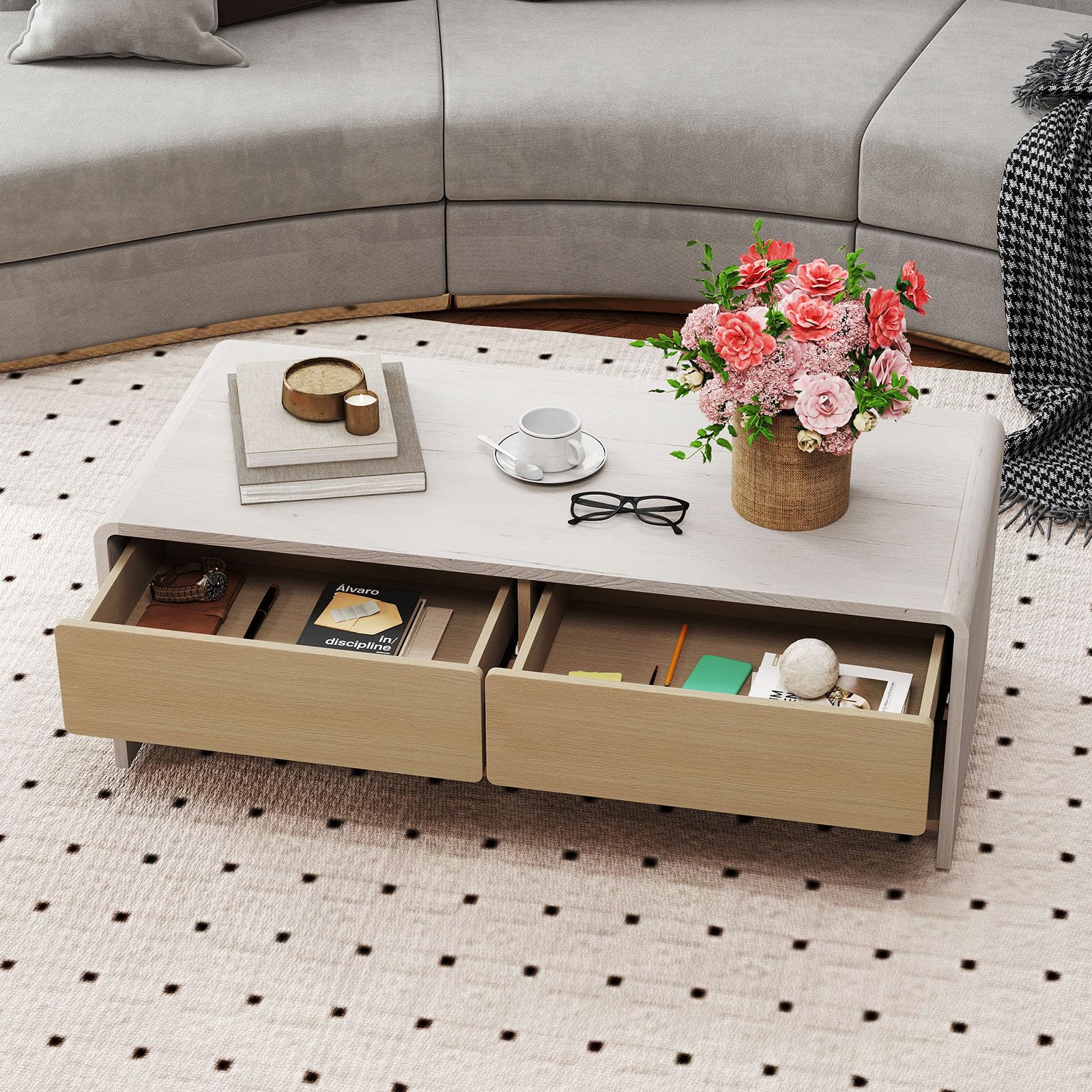Elevate your living room's aesthetic with this exquisite coffee table boasting a contemporary hidden handle design that exudes elegance and modernity. Its clean lines and sleek appearance effortlessly blend with your existing decor, adding a touch of sophistication to your space. With a wide top surface perfect for beverages or showcasing decor items, along with 2 convenient drawers for storing personal items out of sight, this table is as practical as it is stylish. The addition of 2 open storage shelves provides ample space for books, remotes, or other everyday essentials, ensuring your living room remains clutter-free and organized. Not just a coffee table, this versatile piece can also function as a display or storage table, catering to various needs in your home. Enjoy the ease of cleaning and maintenance with its smooth surface, ensuring a spotless look with minimal effort.