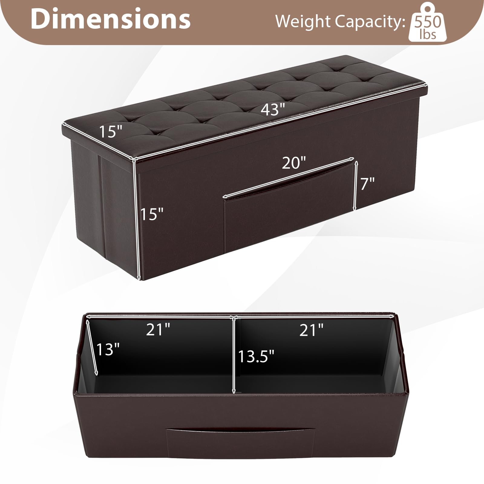 Introducing our stylish and versatile folding storage ottoman. Say goodbye to clutter with its spacious 38-gallon capacity, perfect for storing everything from books to bed linens. The removable divider allows for separate storage, while the side pocket keeps smaller items easily accessible. Enjoy ultimate comfort with its ultra-soft, skin-friendly surface and soft foam padding. Use it as a shoe bench, footrest, or extra seating in any room. Assembling and folding away with ease, this ottoman is perfect for small spaces or those who value flexibility in their furnishings.