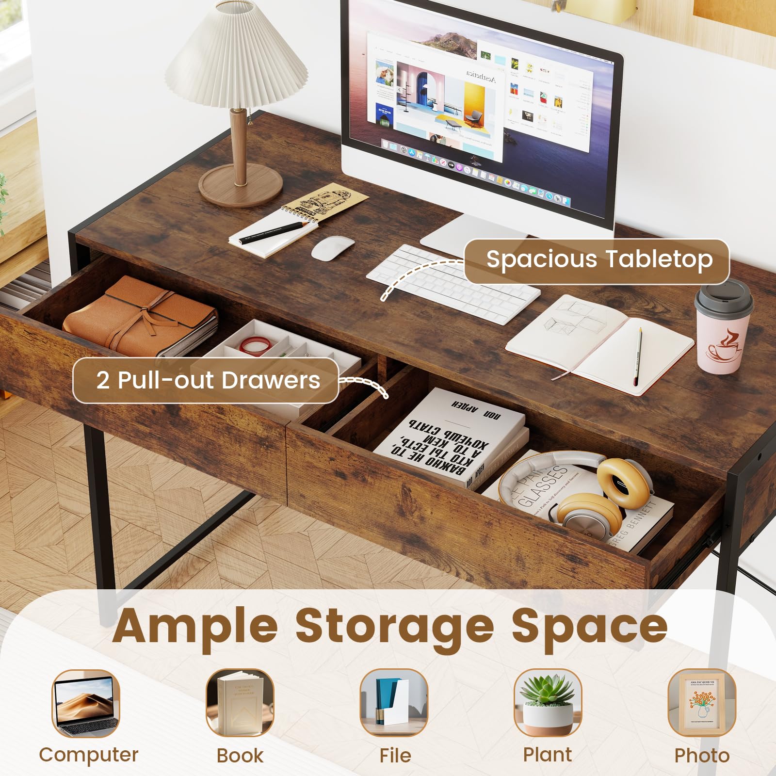 This versatile computer desk combines style, function, and durability. It features two smooth-gliding drawers to keep your workspace tidy and essentials close at hand. The spacious tabletop holds your laptop, books, and decoration with ease. Built with a reinforced metal frame and X-shaped support, it offers strong stability and can hold up to 250 lbs. Adjustable feet keep the desk steady on uneven floors. At 30 inches high, it provides ergonomic comfort and ample legroom—ideal for work, study, or daily tasks. Whether you're furnishing a small apartment, a home office, or a student room, this compact desk offers the perfect blend of style and practicality—making productivity feel effortless.