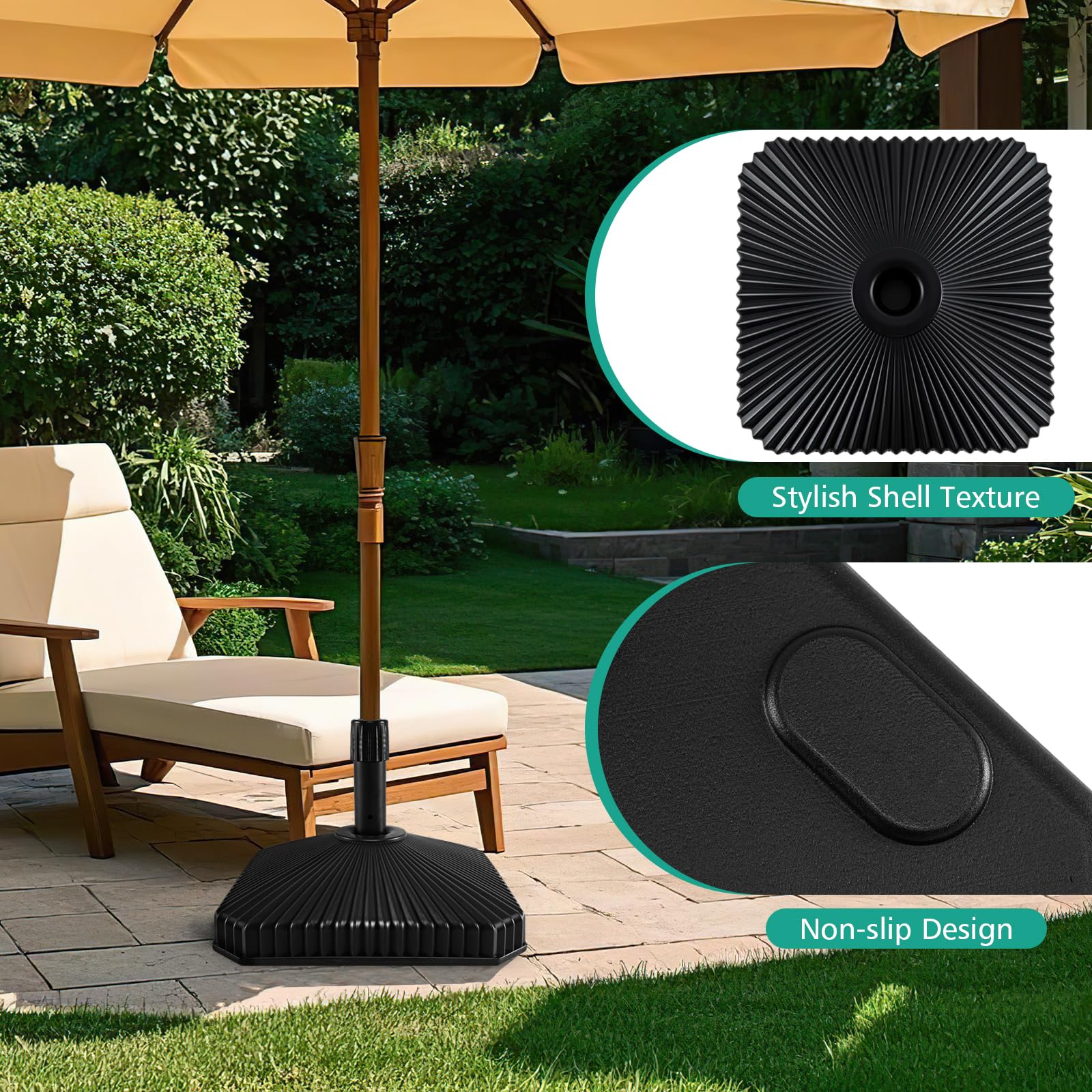 Designed for versatility, this umbrella stand includes a plastic ring and three adapters, making it compatible with umbrella poles of various sizes. The built-in carrying handle allows for effortless transportation, while the non-slip base enhances stability on different surfaces. With its exquisite shell-textured finish, this base not only provides reliable support but also adds a touch of sophistication to your outdoor space.