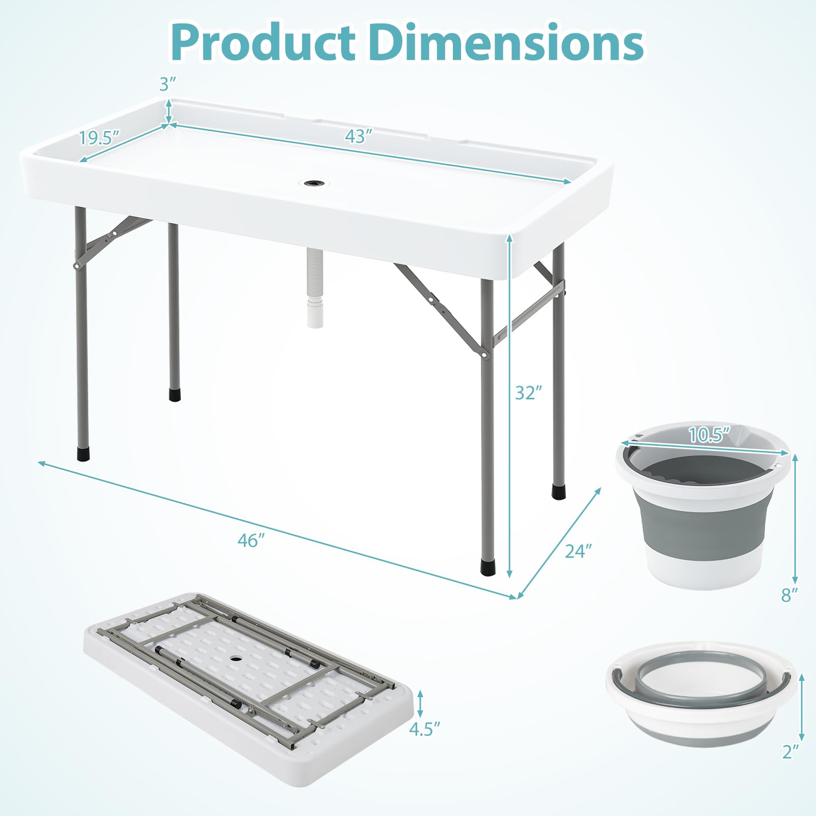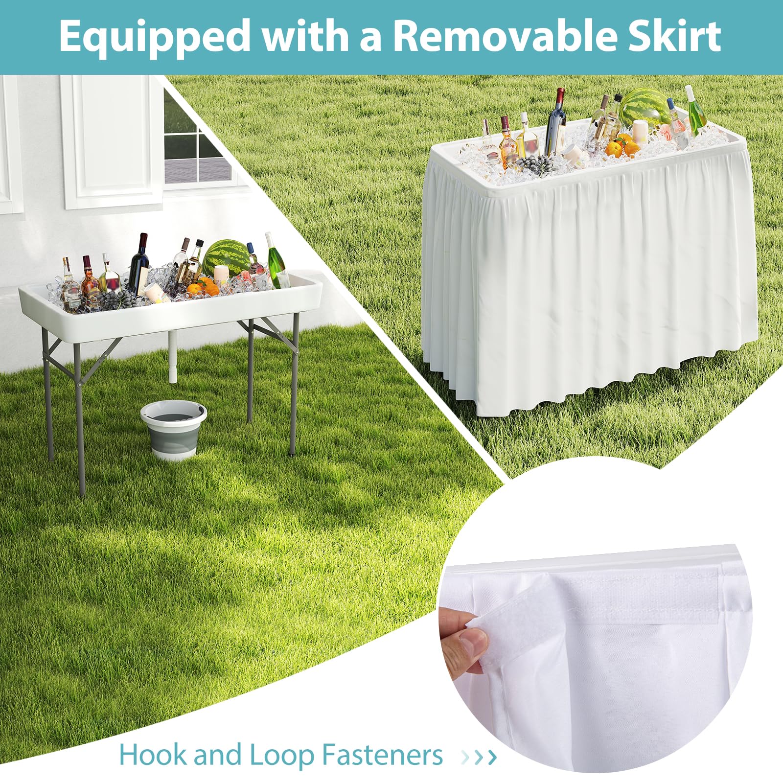 This portable ice bin table is built for long-lasting use with a high-quality HDPE tabletop and heavy-duty metal frame. Moreover, the matching skirt not only adds style to the table but also can be easily removed for washing. Along with a water-collecting bucket, the drainage holes and telescoping hose contribute to an efficient drainage system that keeps your floor clean. The outdoor chill table is perfect for different activities, such as parties, picnics, camping, and barbecues, serving as a great complement. When not in use, the foldable ice table can be folded for space-saving storage.