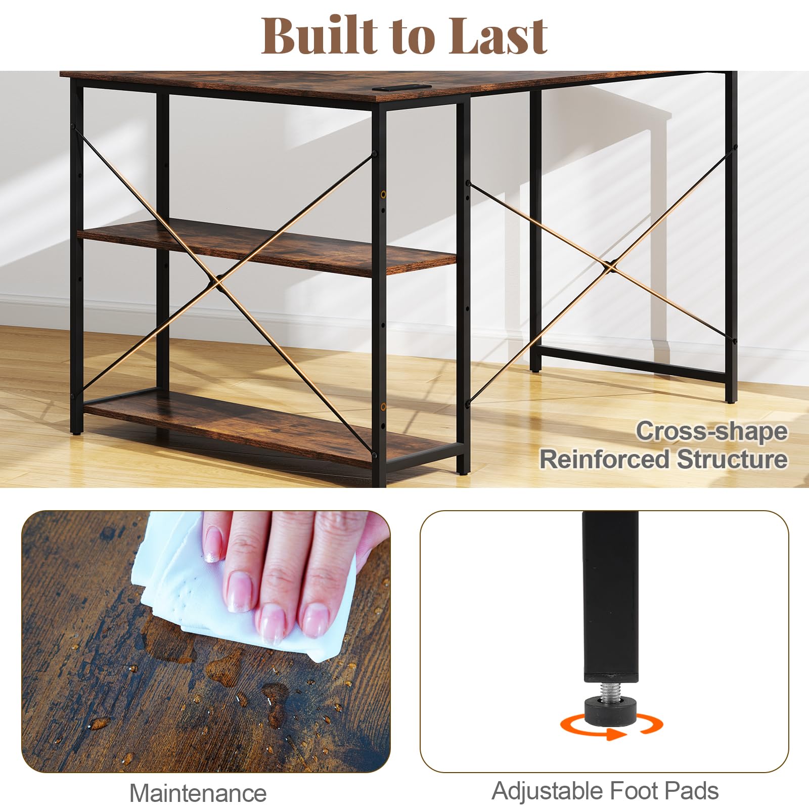 Transform your workspace! Say goodbye to cable chaos with this L-shaped desk! Charge all your gadgets instantly via built-in AC outlets, USB, and Type-C port—no adapters needed! Perfectly nestles into corners, this reversible desk adapts to any room layout. Stay ultra-organized with customizable shelves—adjust the middle shelf to 3 heights or remove it entirely for bulky gear. Built like a tank? You bet! The industrial metal frame and cross-shaped structure handle heavy monitors and gaming rigs without a wobble, even on uneven floors. Sleek, minimalist design fits any vibe—dorm, office, or battle station. Maximize space, crush clutter, and fuel productivity in style! Your dream desk awaits -- upgrade now and dominate your day!