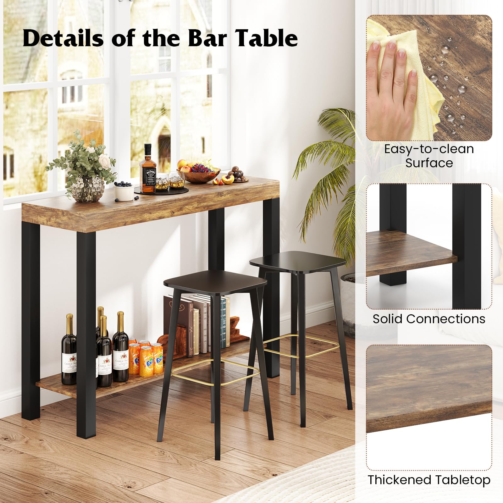 Elevate the ambiance of your living space with this rustic country-style bar table that effortlessly complements a variety of interior decor styles. Meticulously crafted with a selected cashew wood frame, this dining table ensures a reliable structure and durability. The dual storage space offers a spacious 48" extended tabletop, and the extra storage shelf provides convenience for storing books and audio accessories, keeping your space organized and clutter-free. With easy installation and a detailed assembly manual, setting up this kitchen table is a breeze. Versatile and multifunctional, this bar table is suitable for use in bars, kitchens, and living rooms, adding both elegance and practicality to any setting.