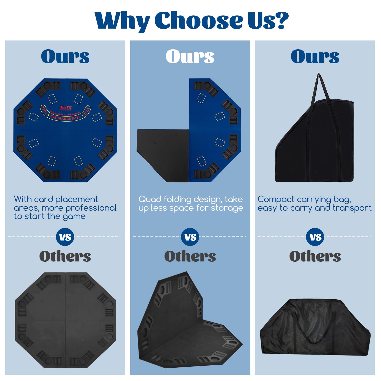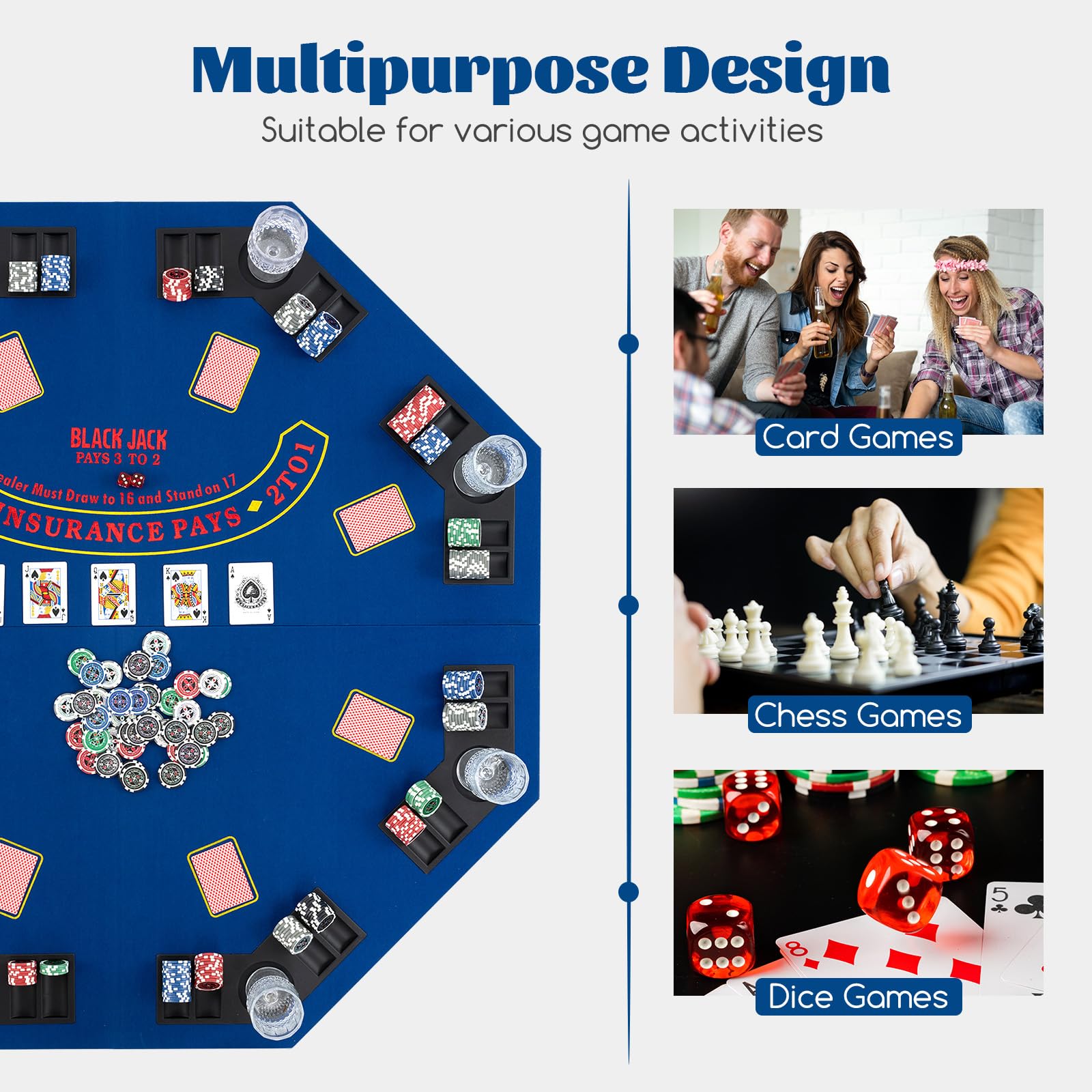 Our 48" 8-player foldable poker table top provides ample space for your friends and family to enjoy classic card games like Texas Hold’em and Blackjack, play chess games, or dice games. What sets this table apart is its space-saving 4-fold design, making it easy to store and transport with the included carrying bag. Thus, you can bring the gaming excitement, whether it’s a friend’s house, a party, or a camping trip. Additionally, thanks to its luxurious felt surface, the mat allows cards to glide effortlessly during shuffling and dealing. Furthermore, with designated card placement areas, individual cup holders, and poker chip trays, every game feels like a high-stakes casino affair. Elevate your game nights and create unforgettable memories with this top-of-the-line gaming accessory.