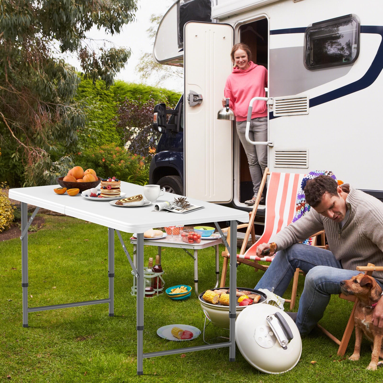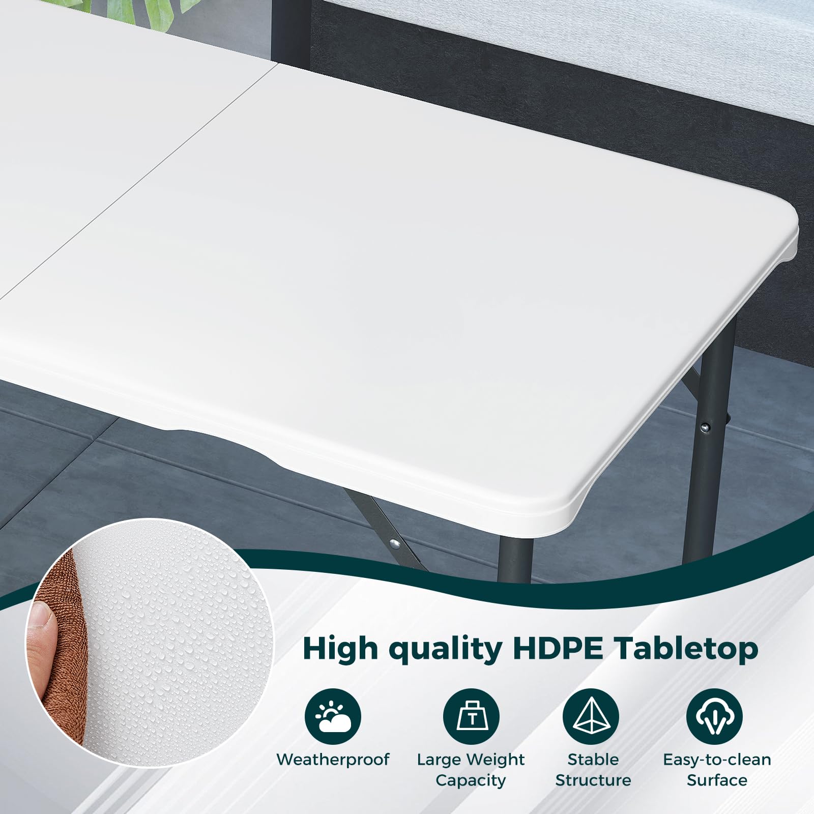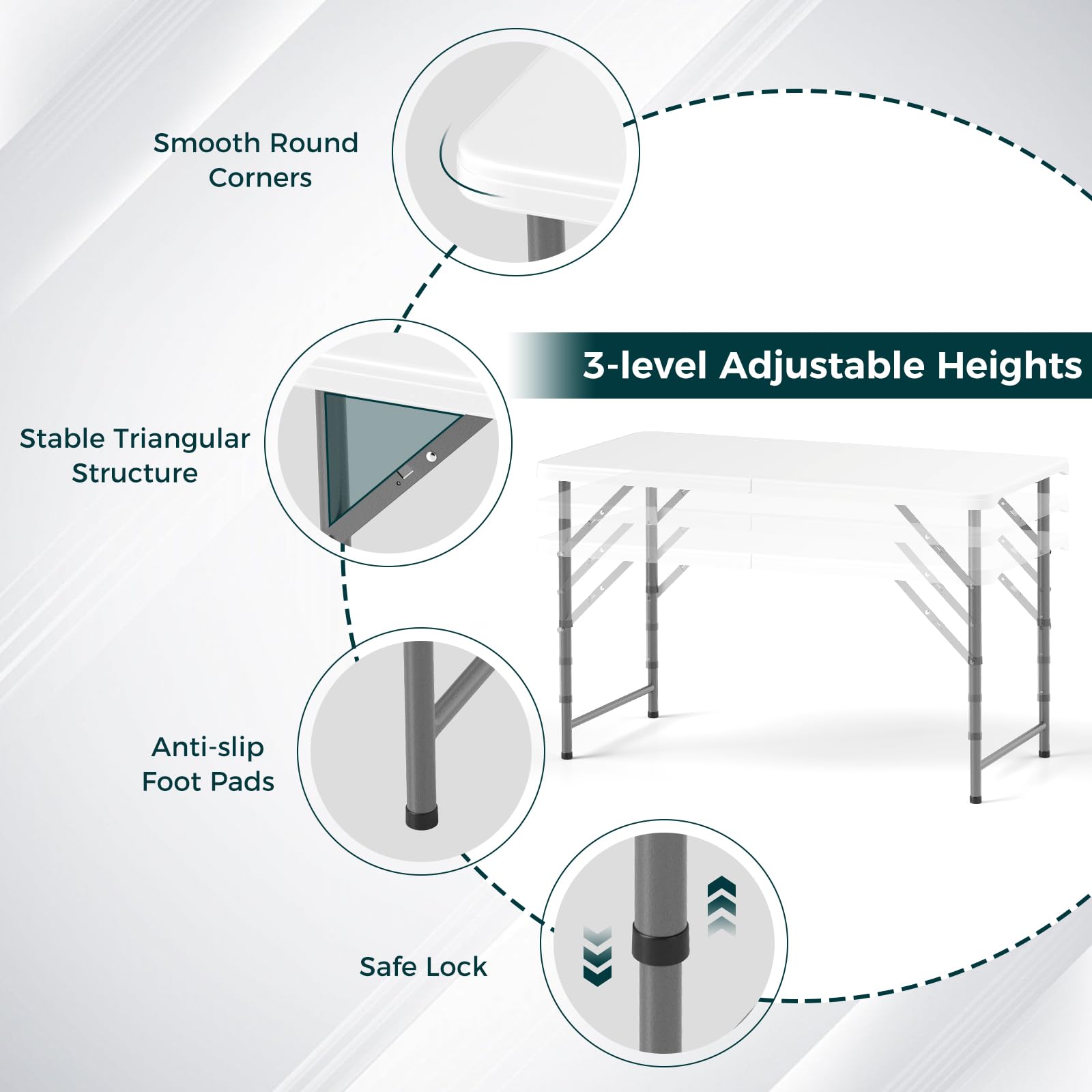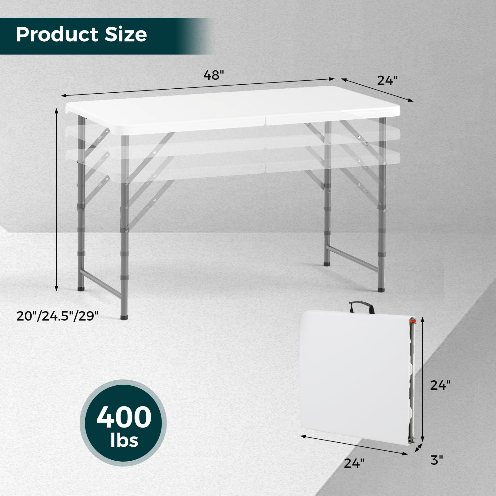 Experience adaptable convenience with our outdoor folding table, tailored to meet an array of event needs with its easily adjustable height settings at 20", 24.5", and 29". Sporting a spacious 6 x 2.5 ft tabletop, this robust table offers ample room for 6-8 people. The top of the table is composed of HDPE, supporting a substantial weight of up to 400 lbs. Featuring an easy-to-handle, foldable design, this table is perfect for carrying to different venues like campsites, picnics, or tailgating events. Its compact folded size aids in effortless storage. Perfect for both indoor and outdoor scenarios to your reliable companion for all your adventures.