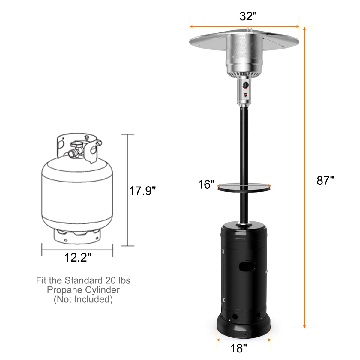 • ?Efficient & Fast Heating?: This 87" tall outdoor propane heater with 32" reflector cover features an impressive heat output of 48,000 BTU, which provides a large warm area. This gas patio heater is a great alternative comparing with a traditional fire pit, which is effective, quiet and smokeless.