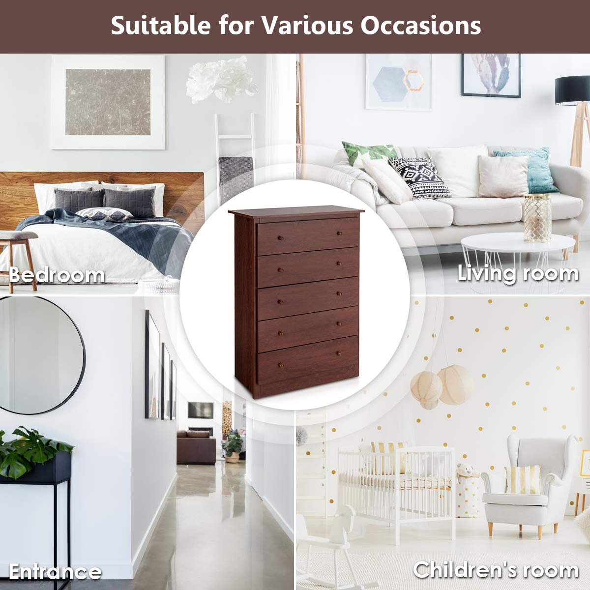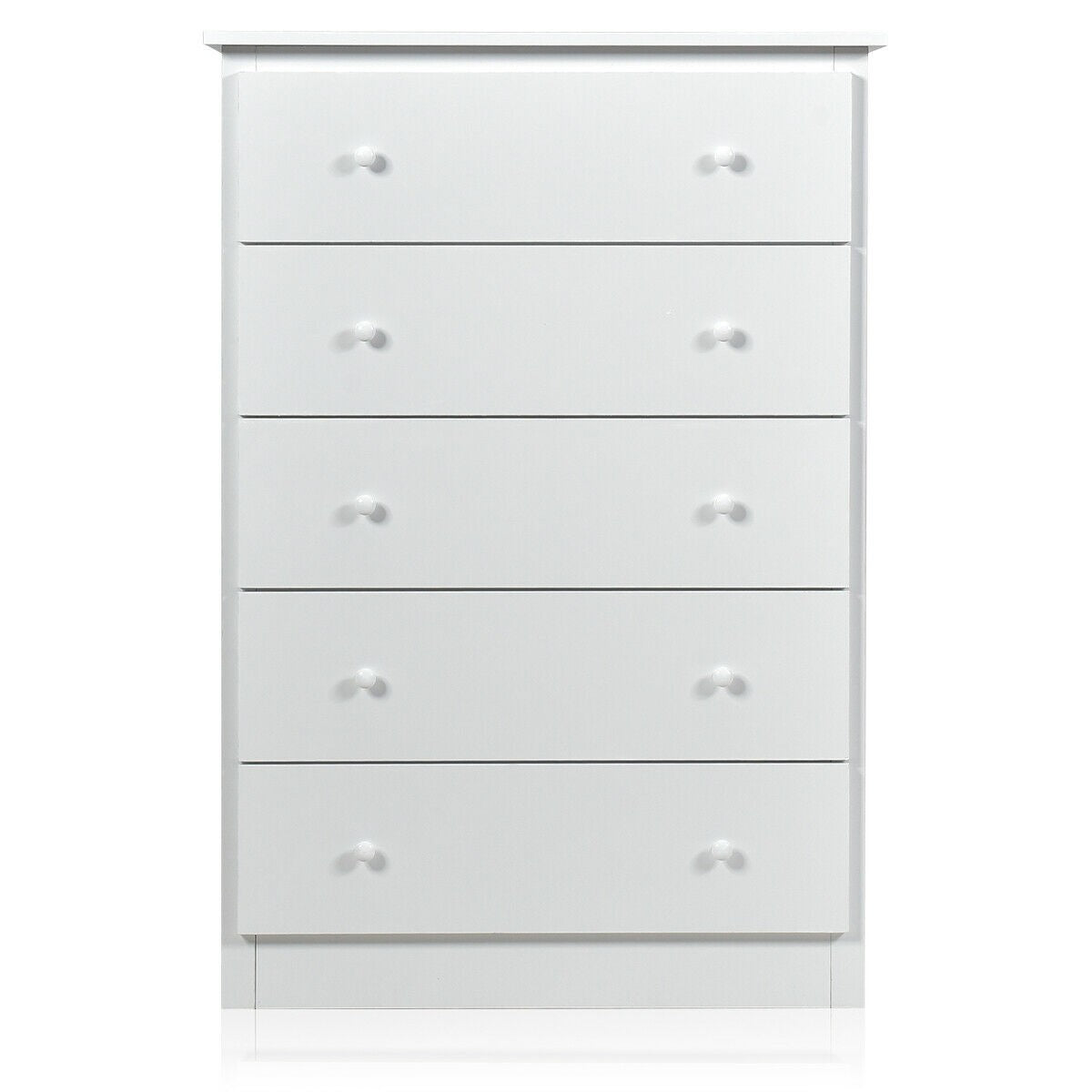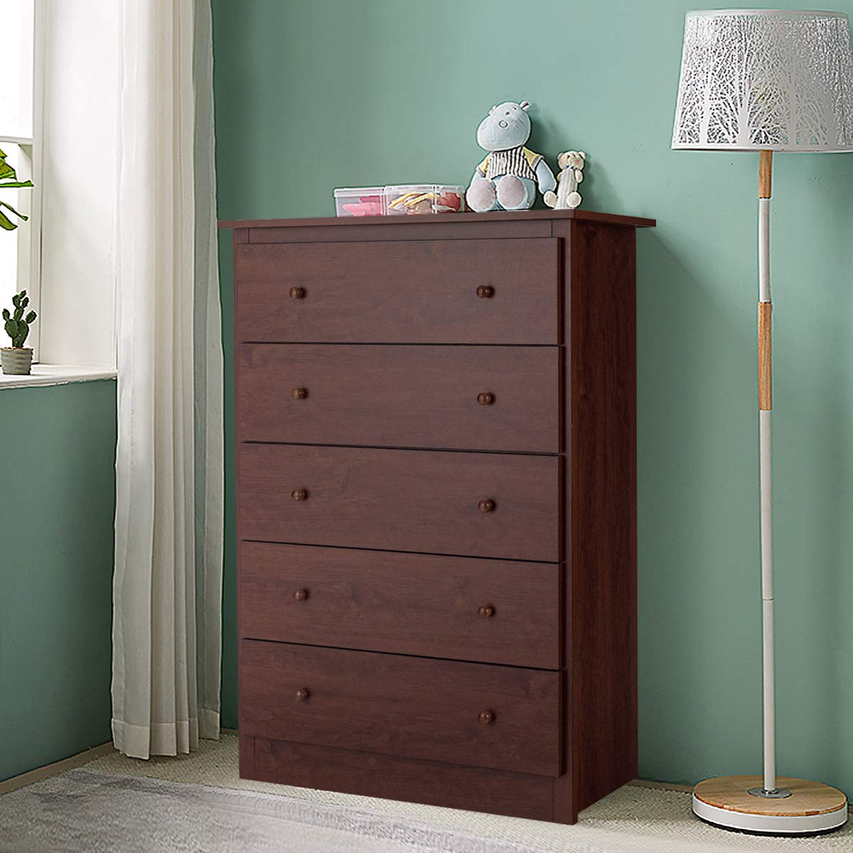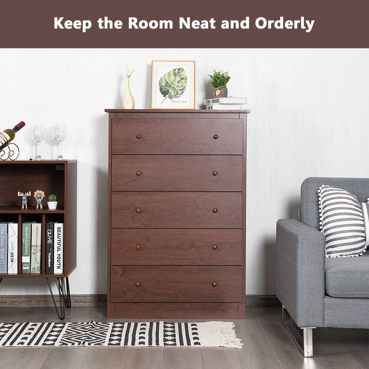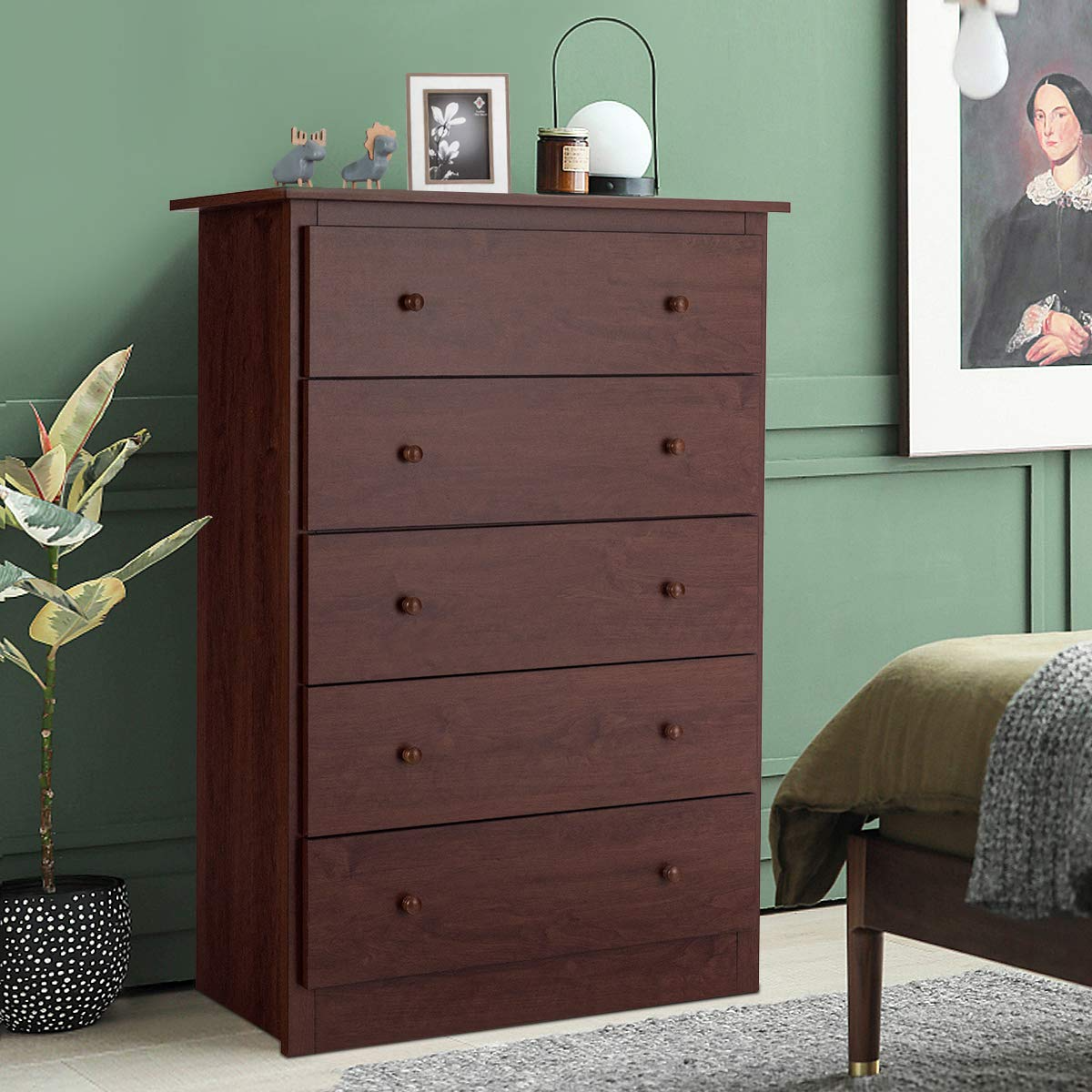 Constructed of premium wood material, this dresser is solid and durable for a long lifespan. It is designed with 5 large drawers, which allows you to store a variety of items. And you can place decorations on the top of this dresser, such as lamps, photos and plants. With sleek and classic style, it is perfect for bedroom, living room, entrance and kid's room.