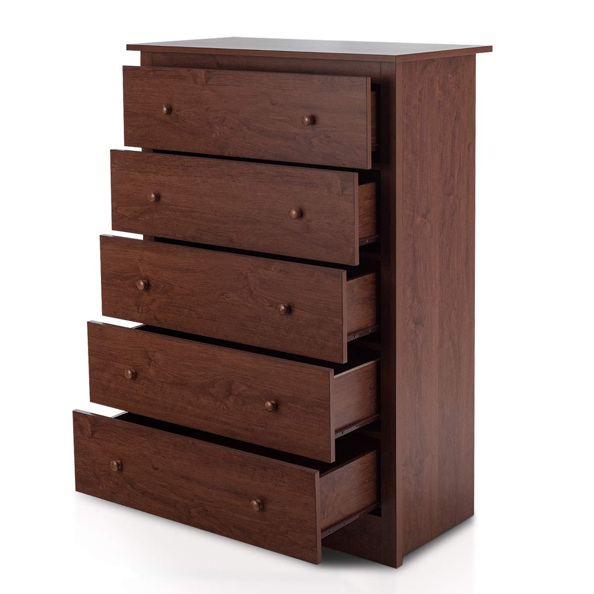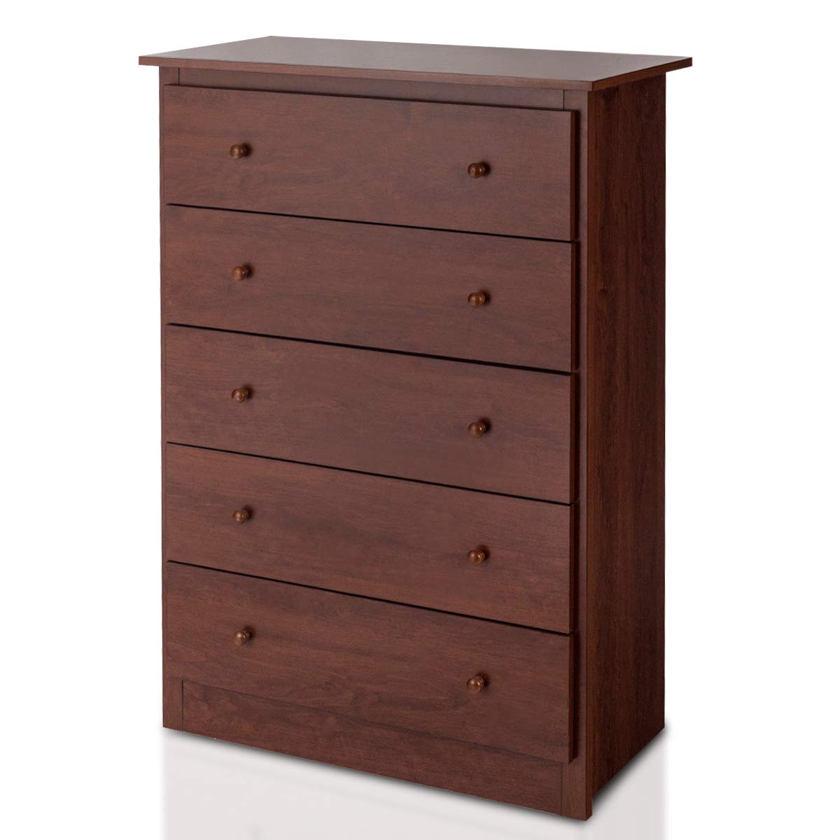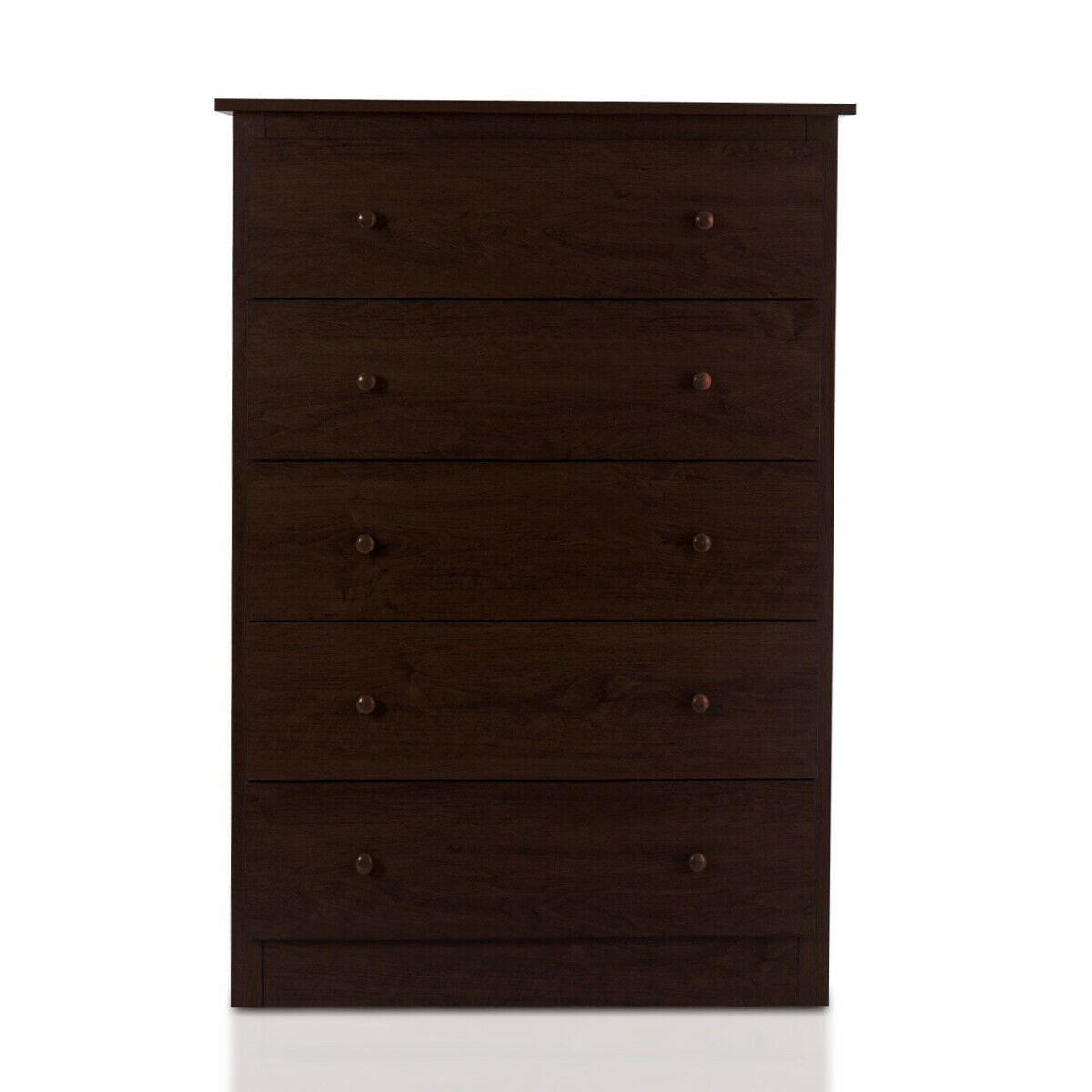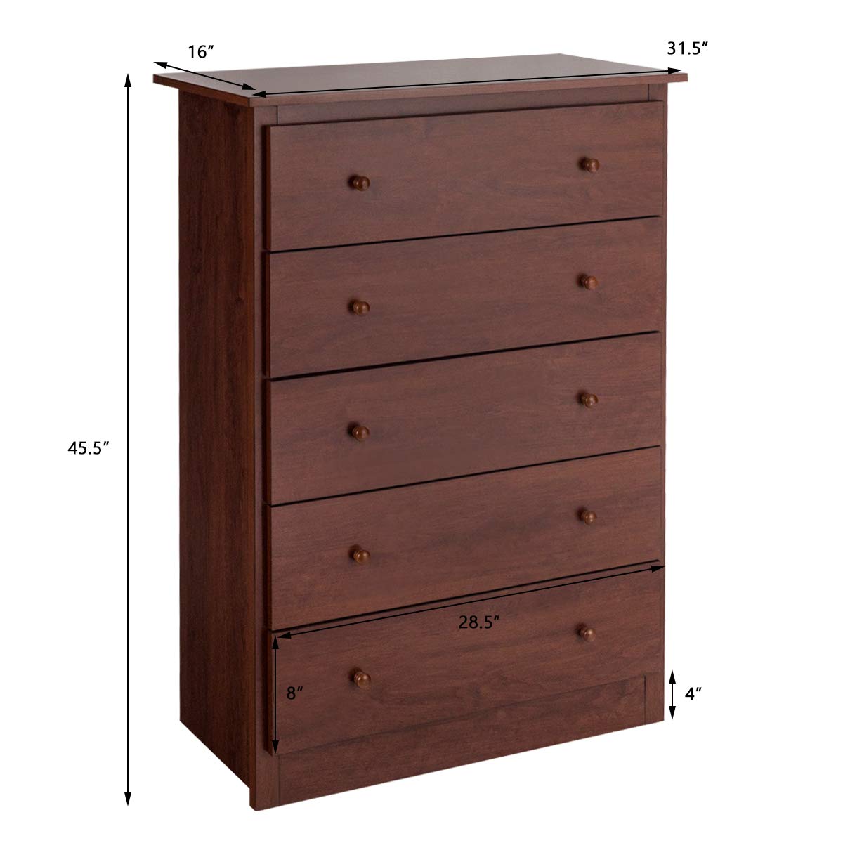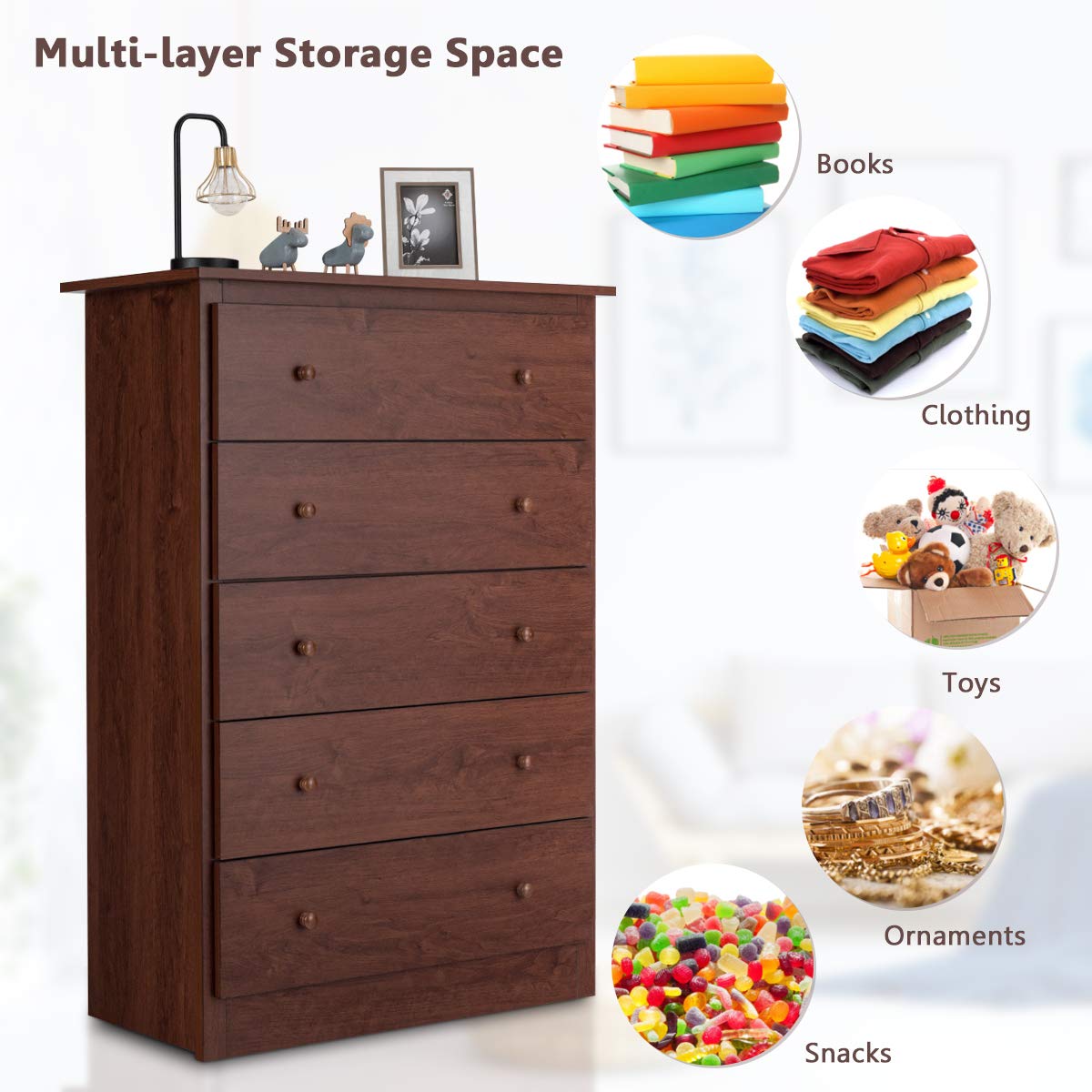 Constructed of premium wood material, this dresser is solid and durable for a long lifespan. It is designed with 5 large drawers, which allows you to store a variety of items. And you can place decorations on the top of this dresser, such as lamps, photos and plants. With sleek and classic style, it is perfect for bedroom, living room, entrance and kid's room.