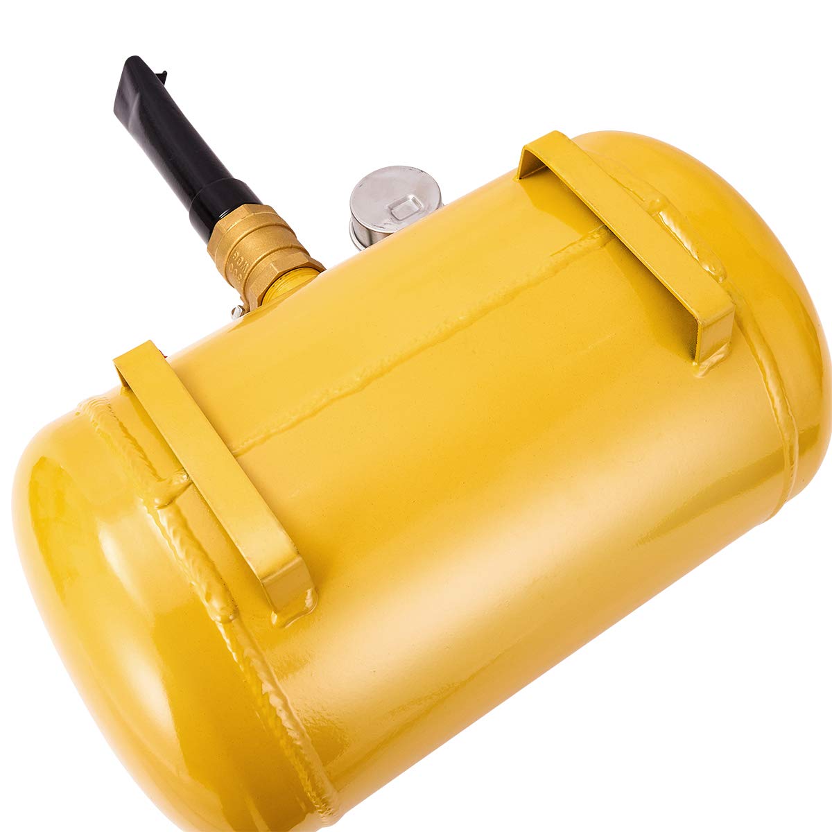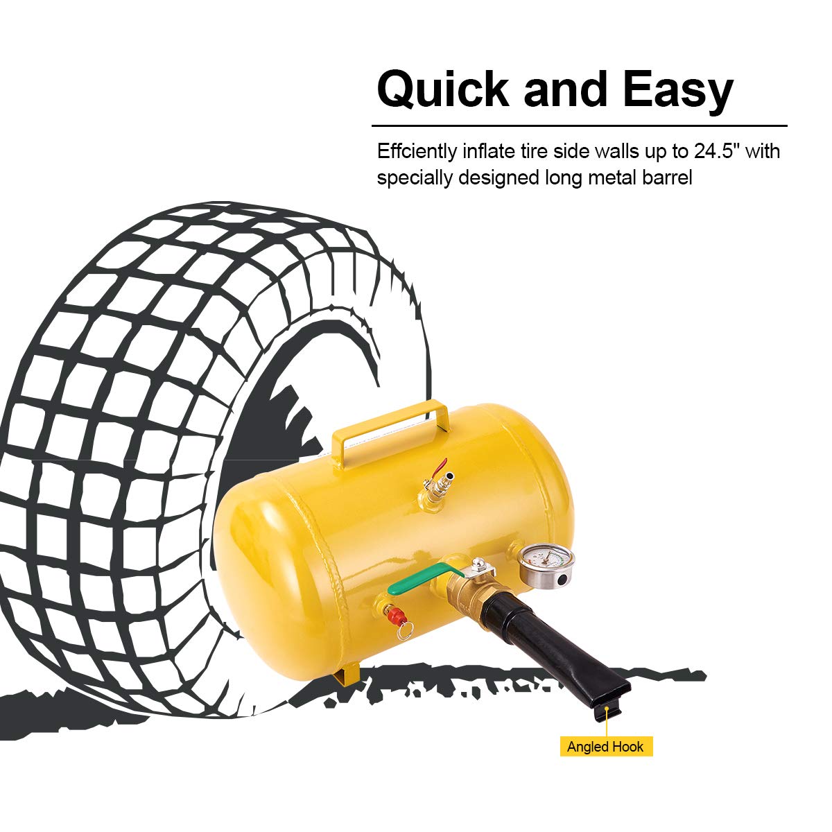 This is our 5 gallon air bead seater which is made of solid steel. There is a on/off valve which is designated for controlling the filling of tank. There is also a air gauge exposed which tells you the air volume accurately. Our item is essential for your tire beading. It is suitable for heavy-duty vehicle such as truck, ATV, tractor and soon.
