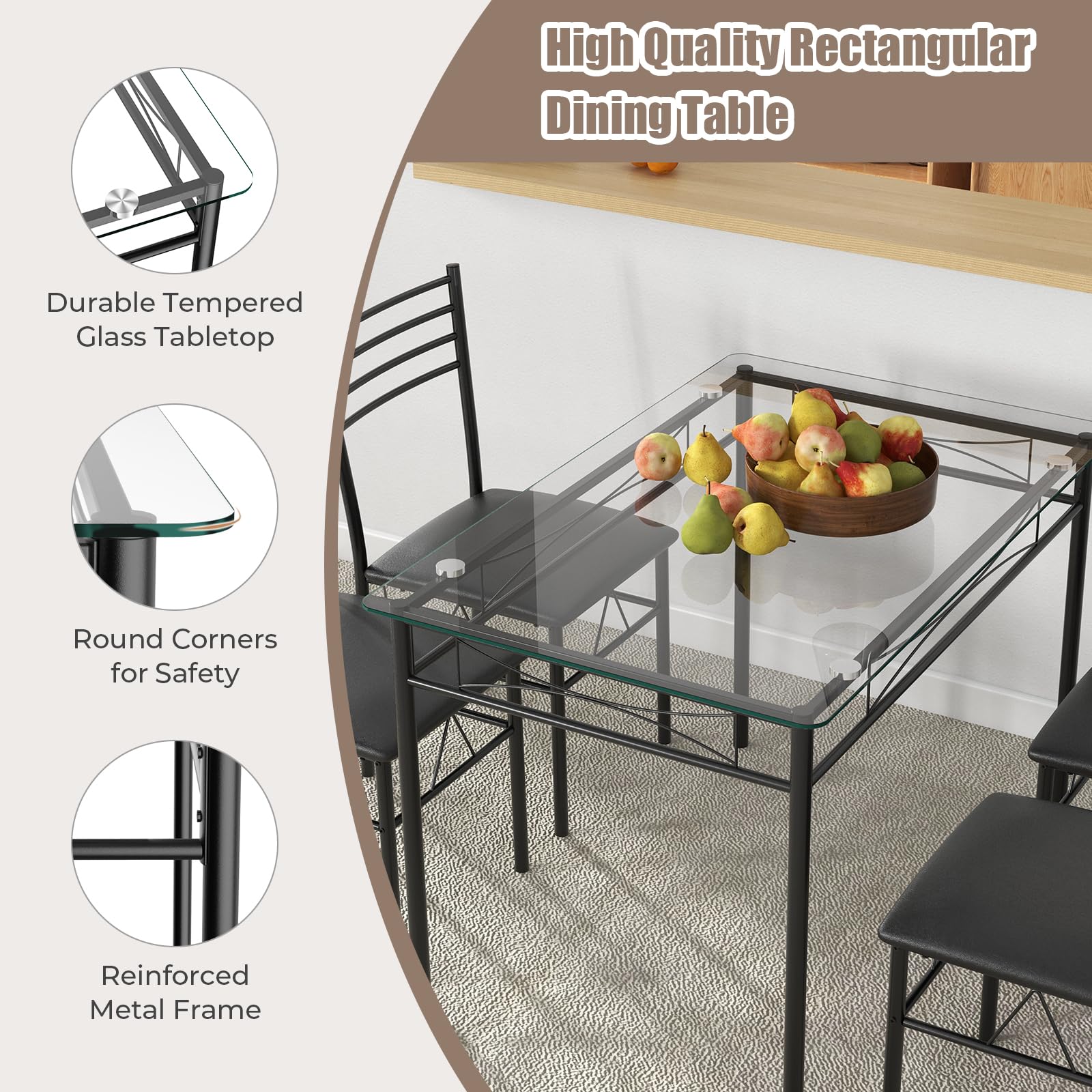 Including a rectangular dining table and 4 high back chairs, this modern 5-piece kitchen table set is a perfect addition to any dining space. The tabletop is made from high quality tempered glass, ensuring both strength and durability. Plus, round corner design protects the safety of you and your family. The chair seat is filled with high resilience sponge and covered in PU leather that offers both comfort and style. Additionally, when not in use, you can conveniently store the chairs underneath the table, maximizing the available floor space in your dining area.
