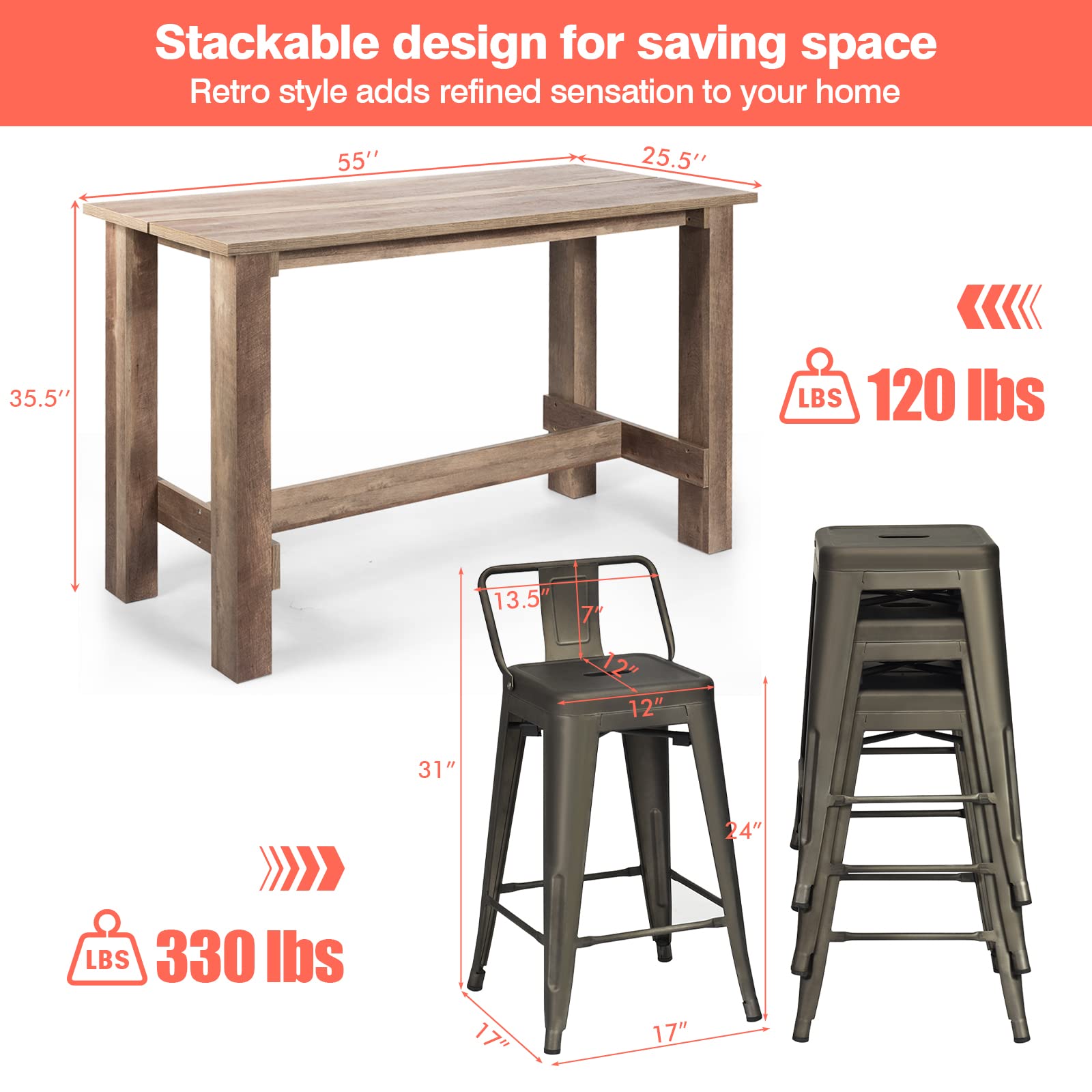 Use this well-designed dining table set to enjoy a leisurely lunch, romantic dinner and evening cocktail! Large tabletop not only provides spacious space for the placement of dinnerware and decorative items but also offers enough space for home office activities. Moreover, an ergonomically shaped backrest helps you alleviate back fatigue while a considerate footrest provides you with much more comfort. The combination of a heavy-duty steel frame and durable tabletop with exquisite workmanship accounts for a reliable structure. Detachable backrest makes it easier to stack chairs to save more space, which is designed to meet the needs of those who live in limited space. This retro dining table set brings a refreshing feeling to various occasions, such as dining rooms, restaurants, cafes, and pubs.