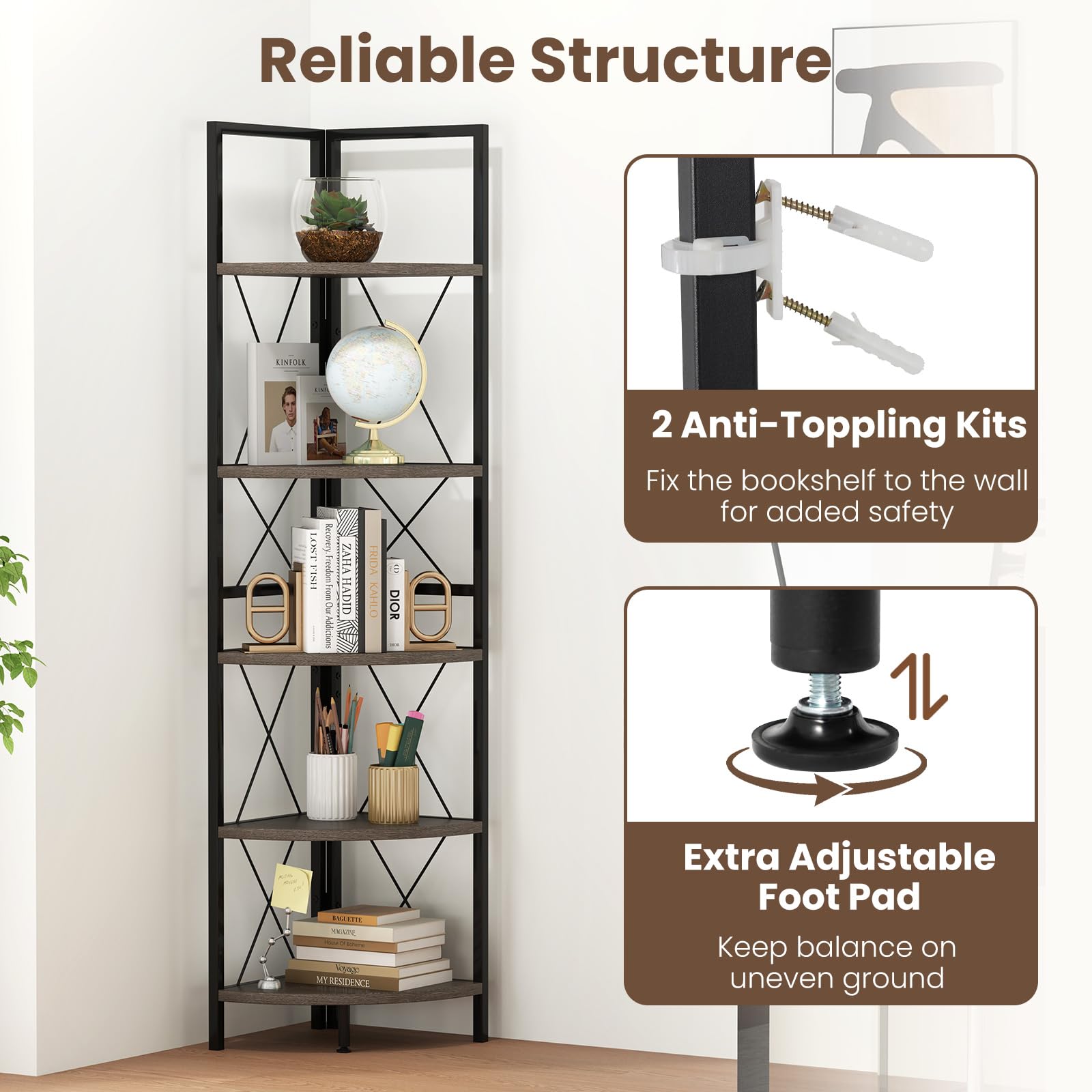 This 5-tier storage shelf is designed to showcase and organize various items. Besides, the clever corner design allows you to optimize vertical space while adding a decorative touch to any room. Supported by robust metal frame, this freestanding storage rack offers stability and long-lasting durability. Moreover, 2 anti-toppling kits anchor the shelf to the wall, adding security and peace of mind. Extra adjustable foot pad can level and stabilize the display rack son uneven surfaces. This rustic corner stand stand also doubles as a display shelf, be it your living room, study, or office.