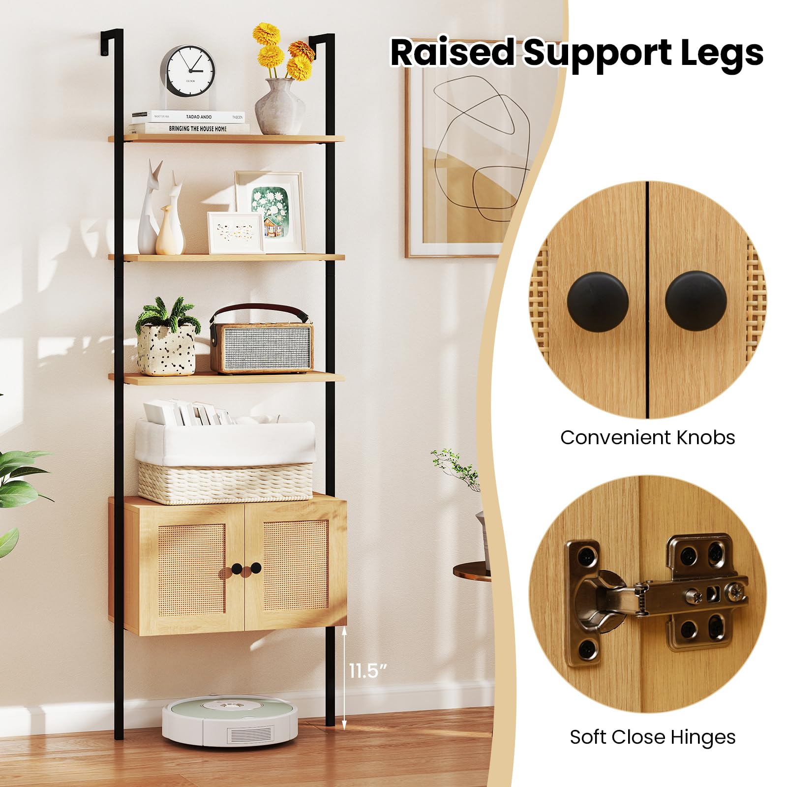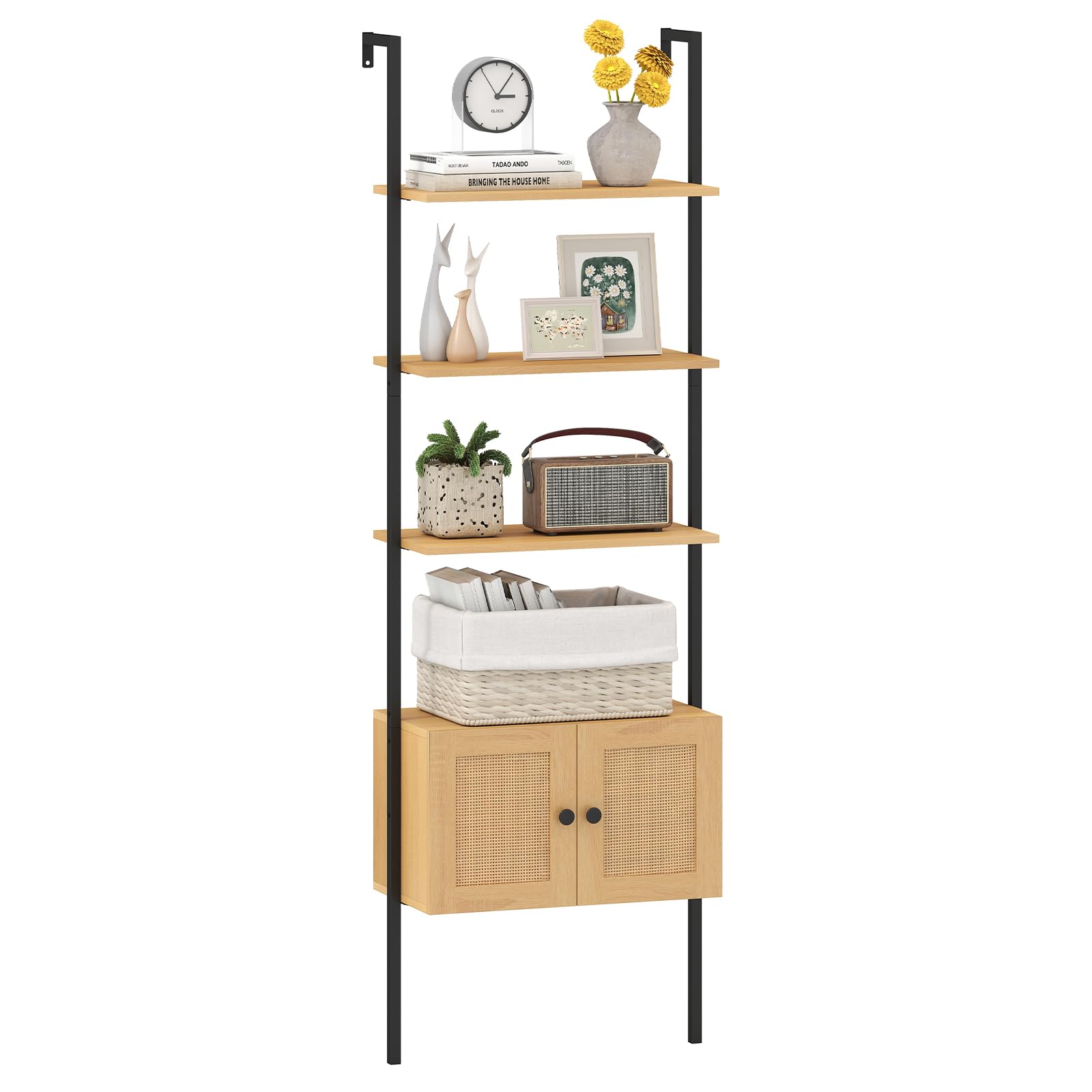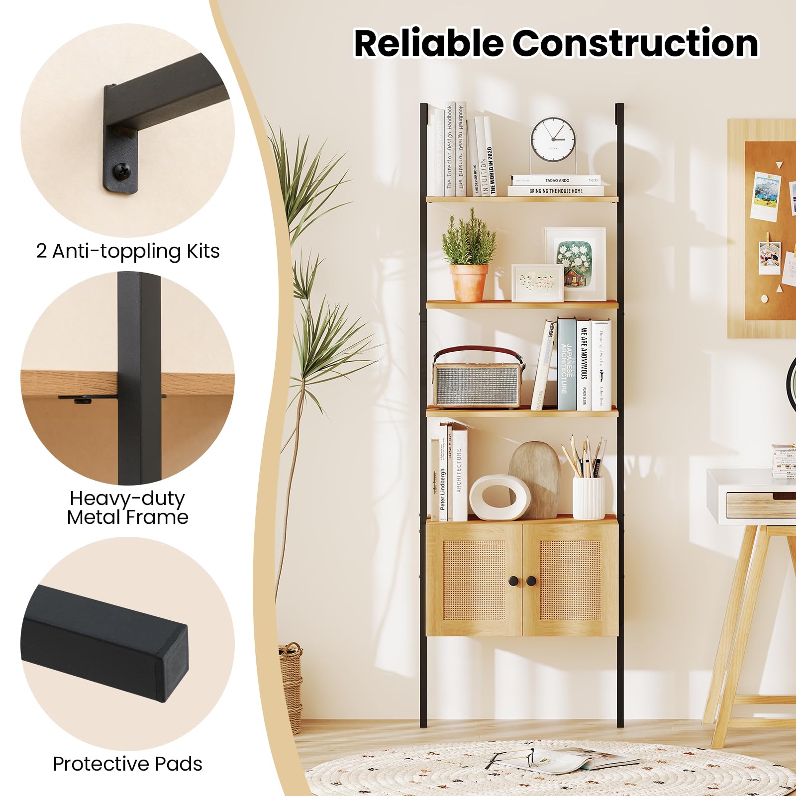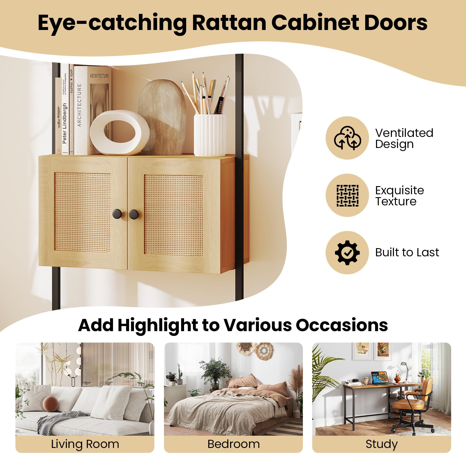 Thanks to double anti-tipping design, the ladder bookcase can be securely fastened to the wall. The blend of open shelving and enclosed storage cabinet makes this piece suitable for multiple uses from a book display to an organizational hub. Constructed with a sturdy metal frame, this wall-mounted bookshelf is built to last and hold a variety of items securely. Moreover, the eye-catching rattan cabinet doors add highlight to various occasions, either for home and office.