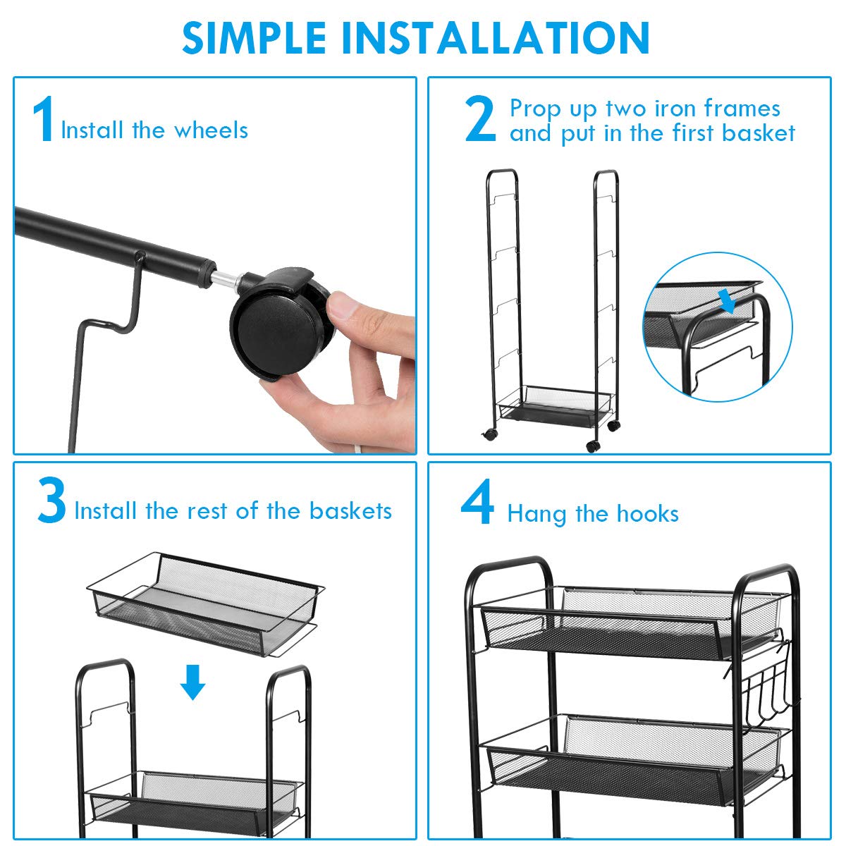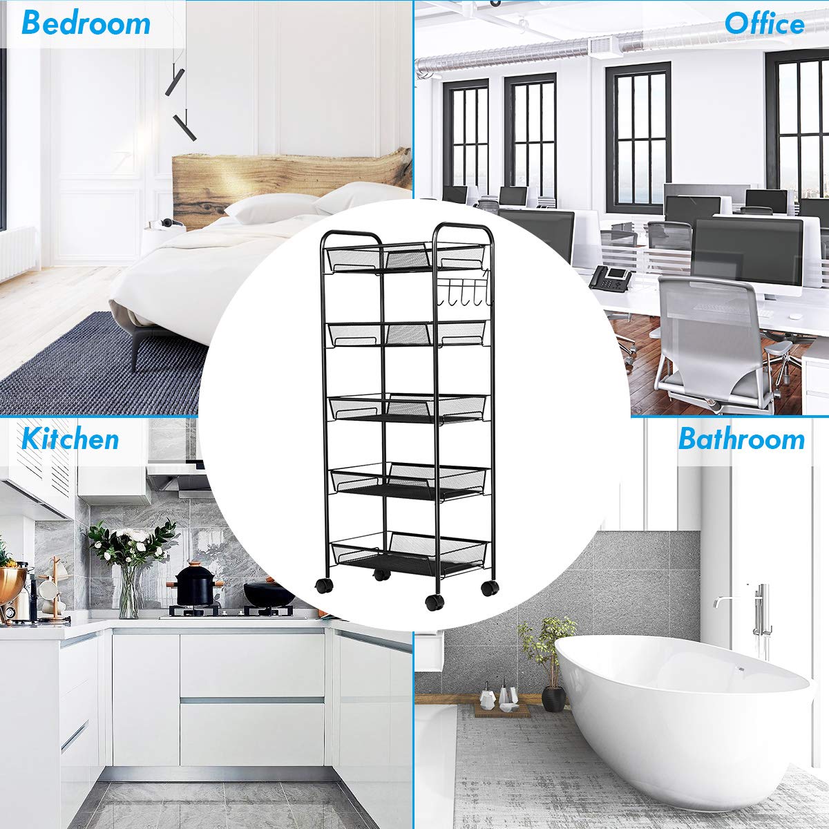 This is our mesh rolling cart which can help you a lot for storing and organizing your items in your home or office trimly. Its simple but great design and satisfied storage capabilities are just your good helpers. The five open large shelves are advantageous to ventilated and avoid overmuch dirt to accumulate. At the same time, they can be used to store more items. The iron frame is for durability and stability. The four wheels at the bottom (Two of the wheels have brakes) can roll smoothly and stop exactly to make sure your floors stay scratch free. , you can lock it at anywhere you want.
