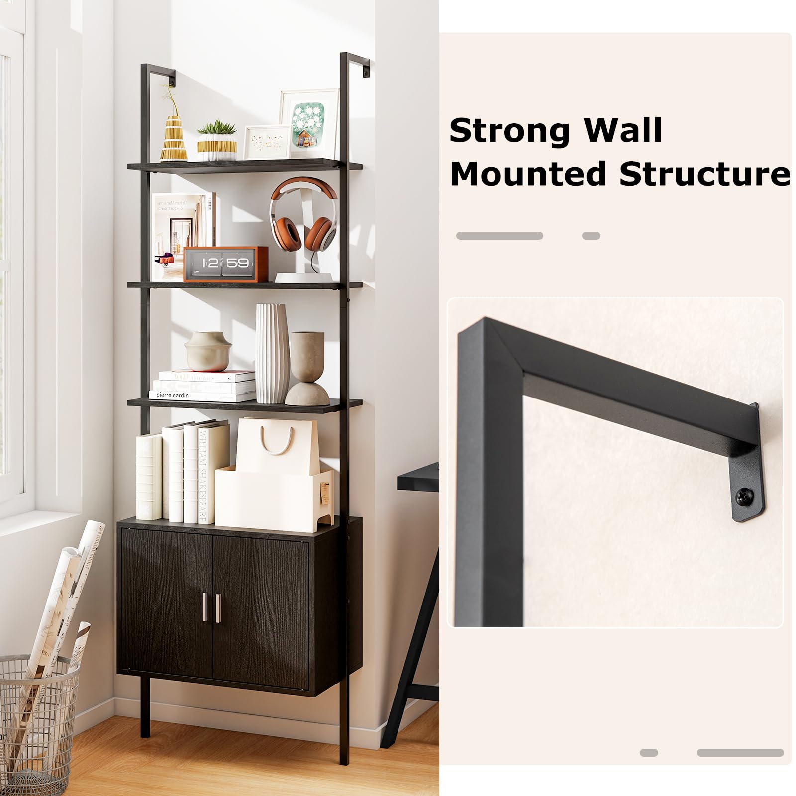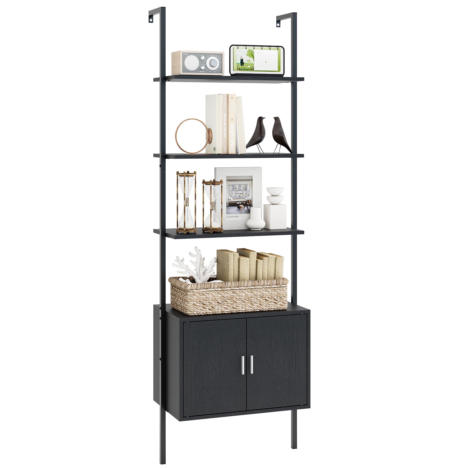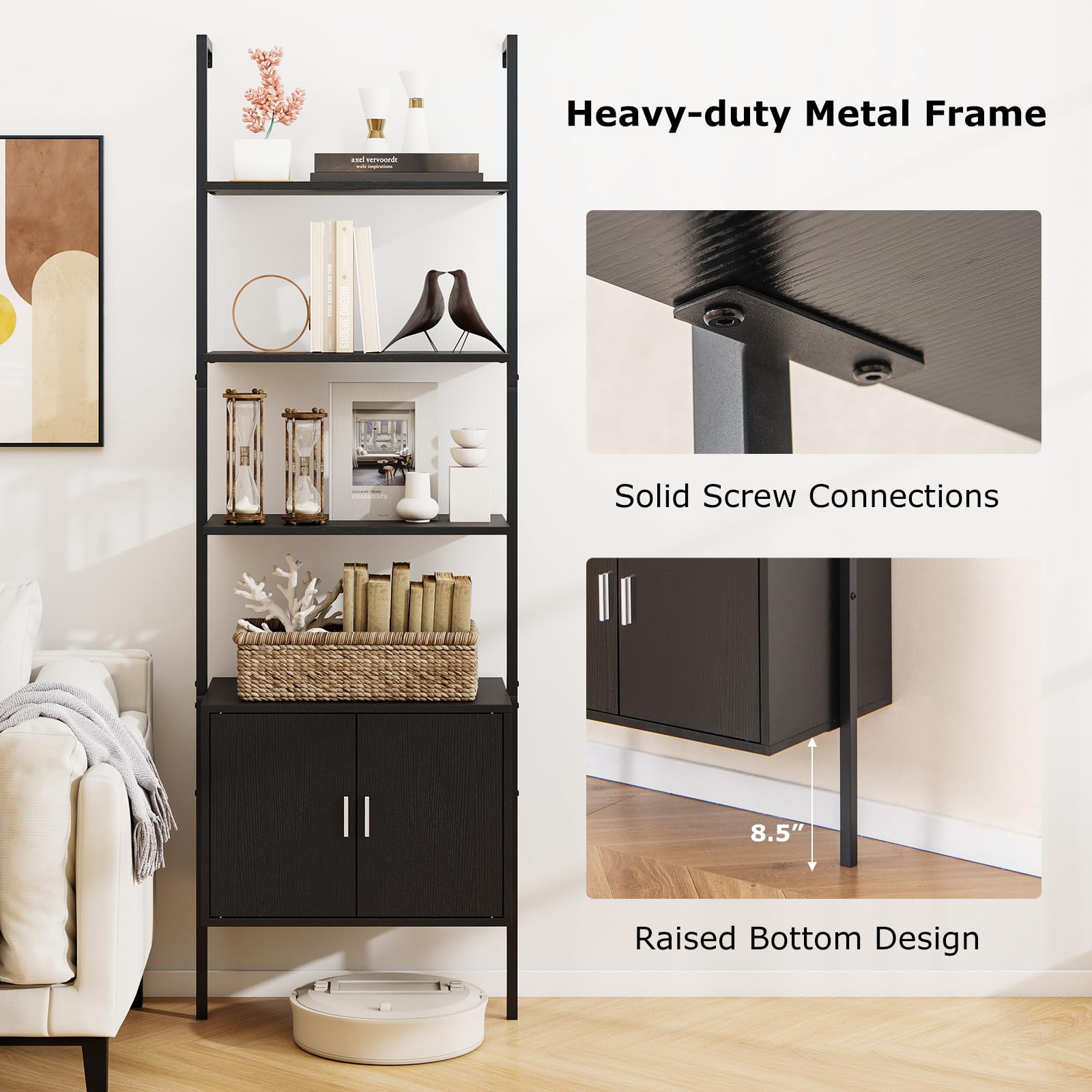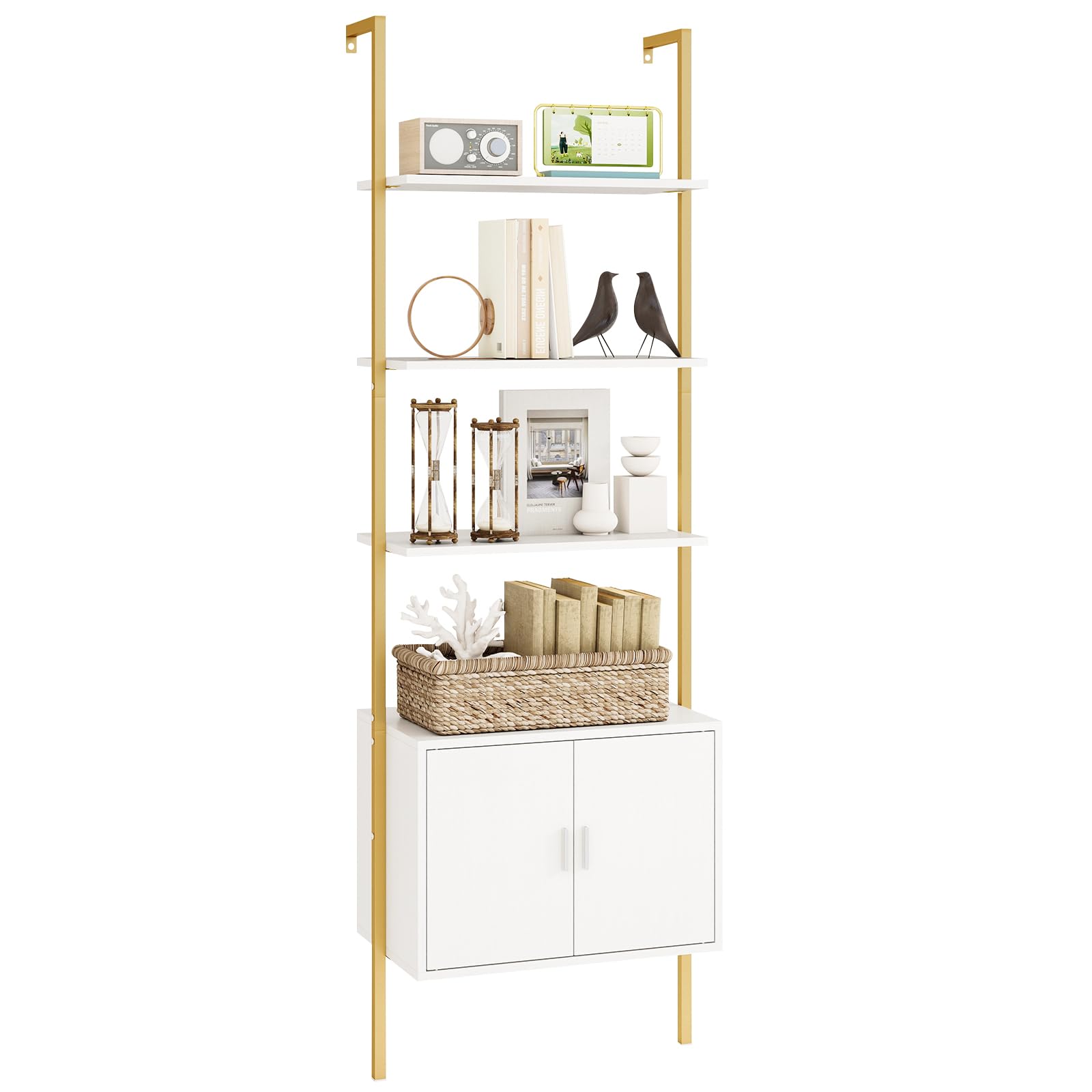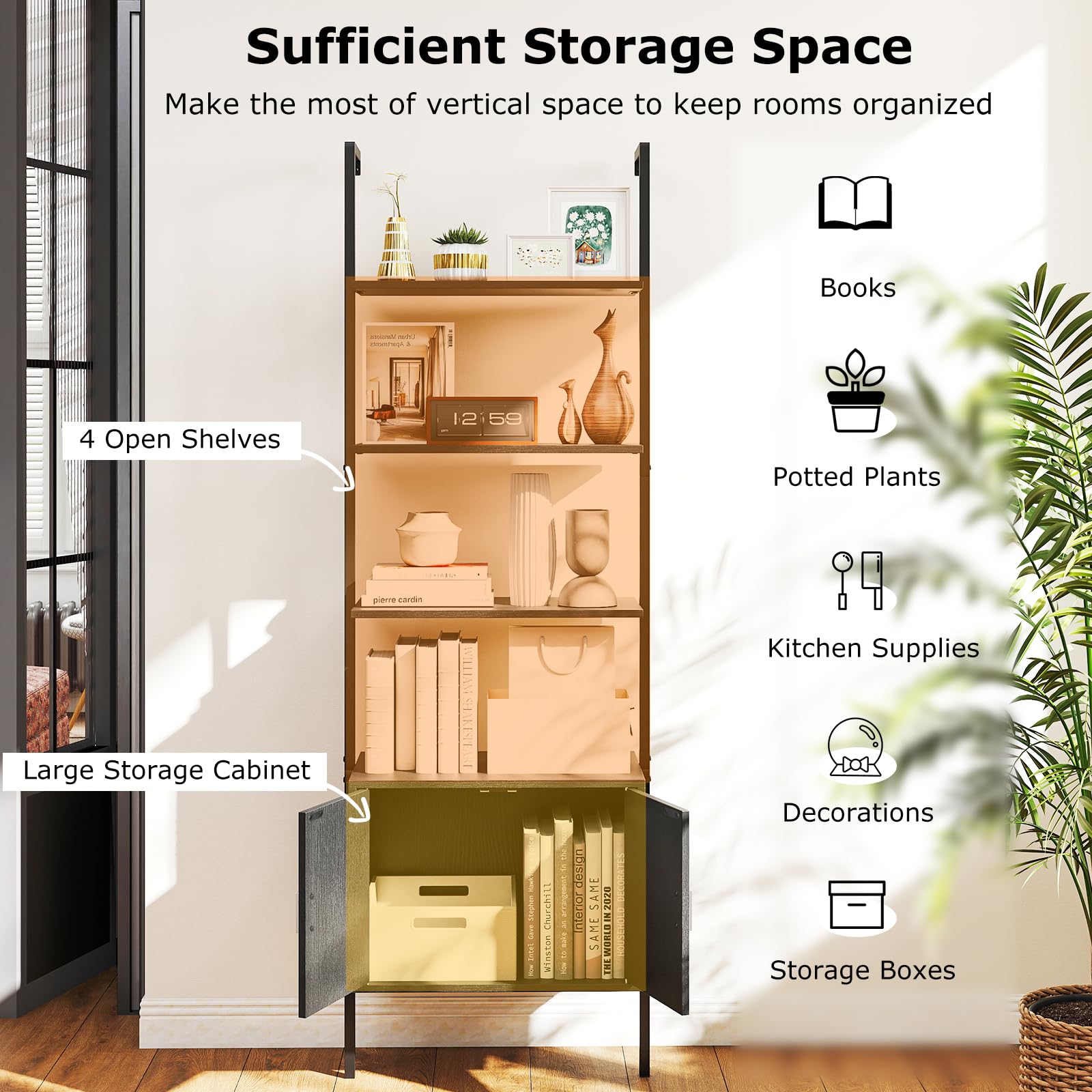 Elevate your home with our exquisite wall ladder shelf, designed to bring style and functionality to any room. Featuring 4 open shelves and a spacious storage cabinet, this shelf offers ample space for your books, plants, kitchen supplies, or decorations. The sturdy heavy-duty metal frame and solid screw connections ensure stability and can support up to 165 lbs. Enjoy the convenience of easy maintenance with the shelf's clean surface and raised bottom design for effortless cleaning. Embrace the chic and modern aesthetic of this shelf that effortlessly blends in with any decoration style, adding a touch of elegance to your space.