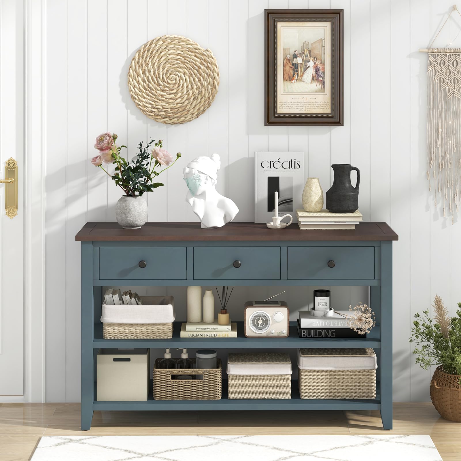 Its sleek, elongated design effortlessly fits into tight spaces while offering a generous tabletop for your treasures. Revel in the convenience of 3 pre-installed drawers and 2 open shelves, keeping clutter at bay with ease. Solid wood legs, fortified with non-slip pads, ensure steadfast support. Embrace safety with 2 anti-tipping kits, perfect for families and pet lovers. Complete your home's look with our table's inviting farmhouse finish - rustic elegance at your doorstep. Bring this stylish and safe addition to your home!