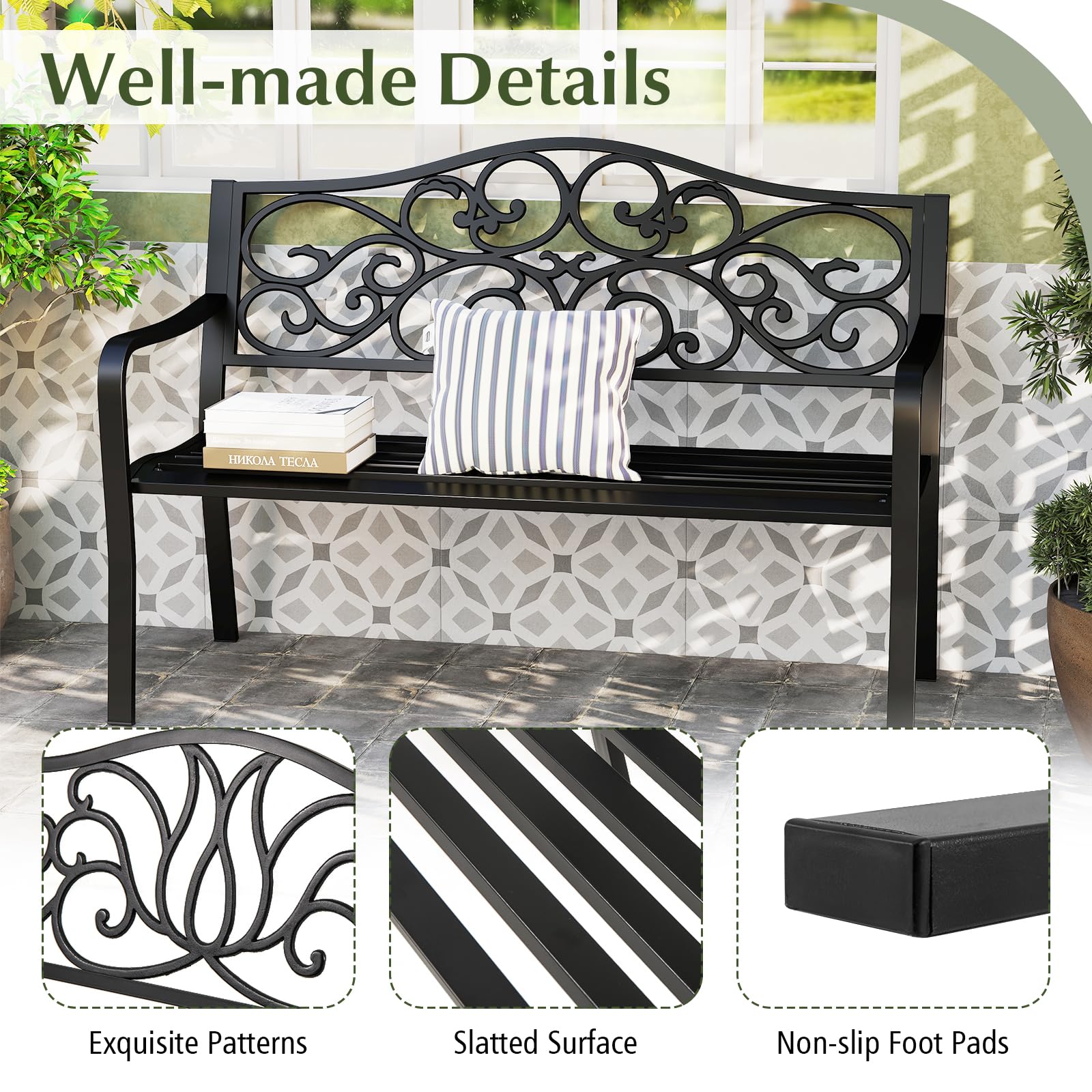 Crafted meticulously from heavy-duty spray metal and cast metal, it is sturdy and an enduring investment for your open-air spaces. Designed to support up to 660 lbs, the outdoor bench can effortlessly accommodate 2-3 people, ideal for family gatherings on your balcony, serene moments in the garden, or socializing in park settings. The ergonomic 105° slanted backrest, coupled with a smoothly curved seat and armrests, ensures hours of relaxation. Moreover, the garden bench features beautiful floral patterns that enhance its visual appeal and complement landscapes. Plus, the slatted surface offers the practical benefit of quick drying after rain, making maintenance practically effortless.