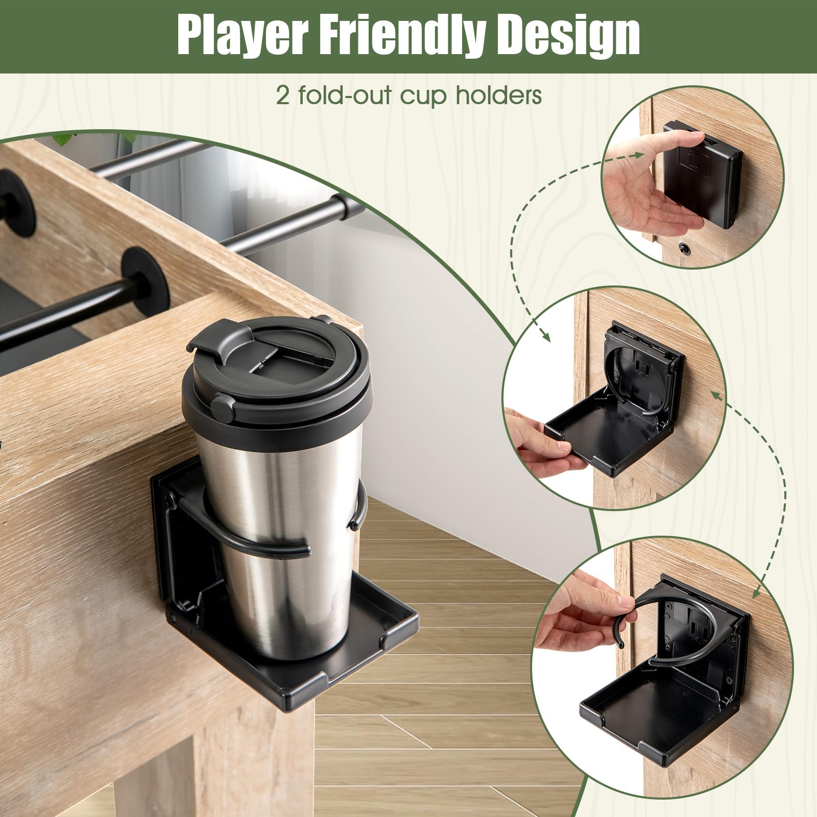 - [Player Friendly Design]: For added comfort and convenience, this indoor family game table is equipped with 2 fold-out cup holders to keep your drinks secure during high-action games. When not in use, the cup holders can be folded up to save space.