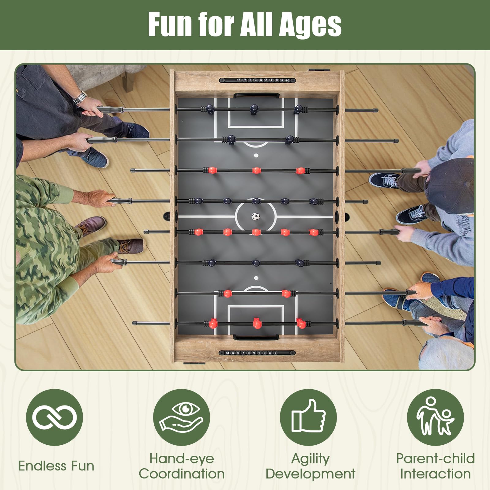 - [Ideal Indoor Game]: This full size foosball table is built to bring people together and add excitement to any social event or casual play. It also helps promote hand-eye coordination, agility development and parent-child interaction.